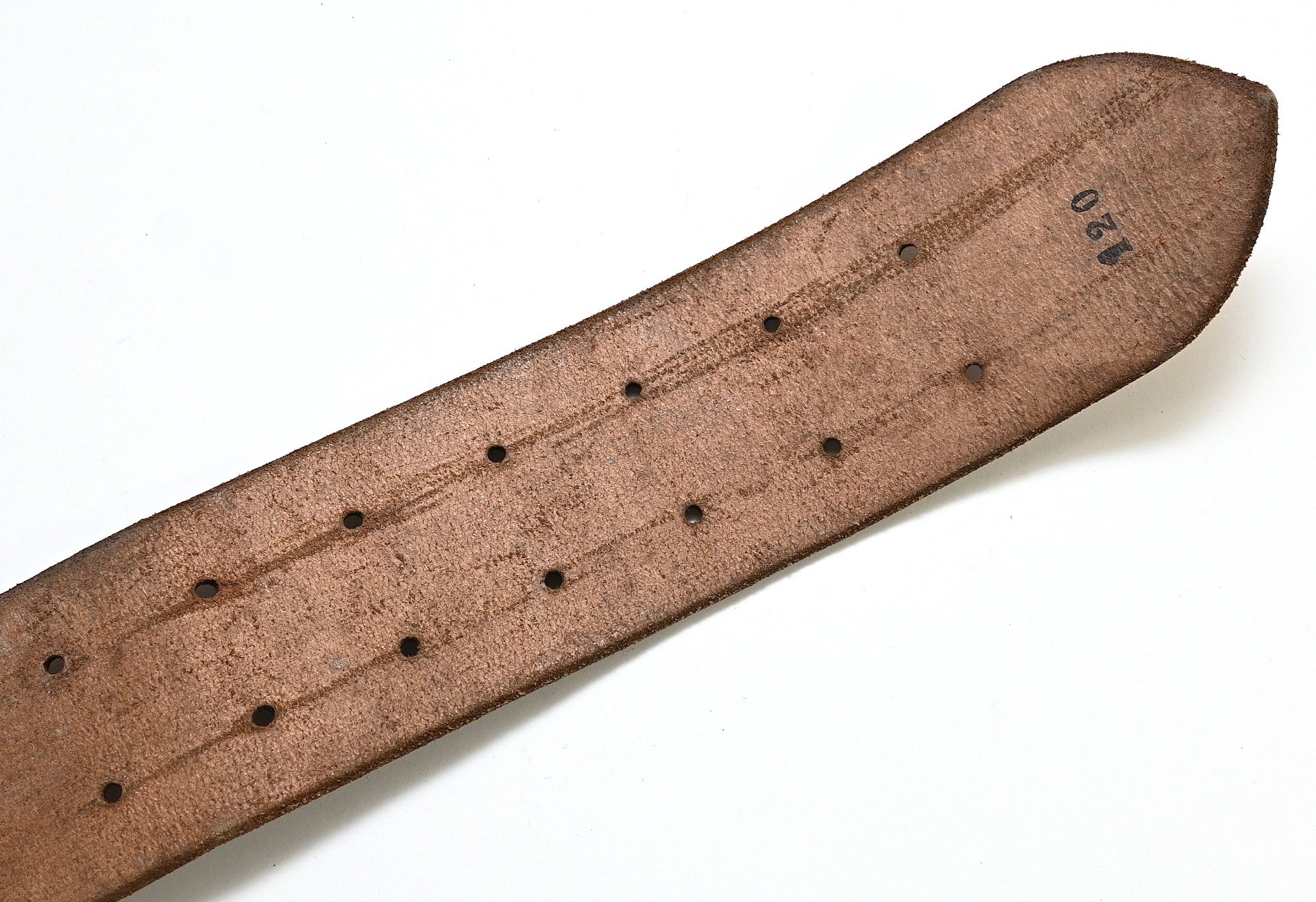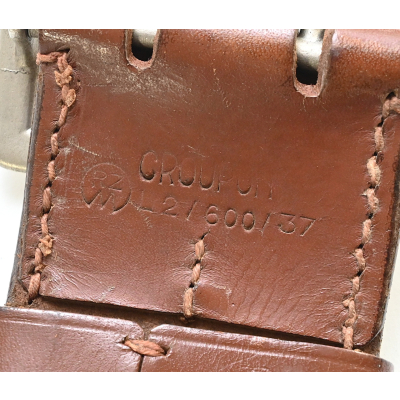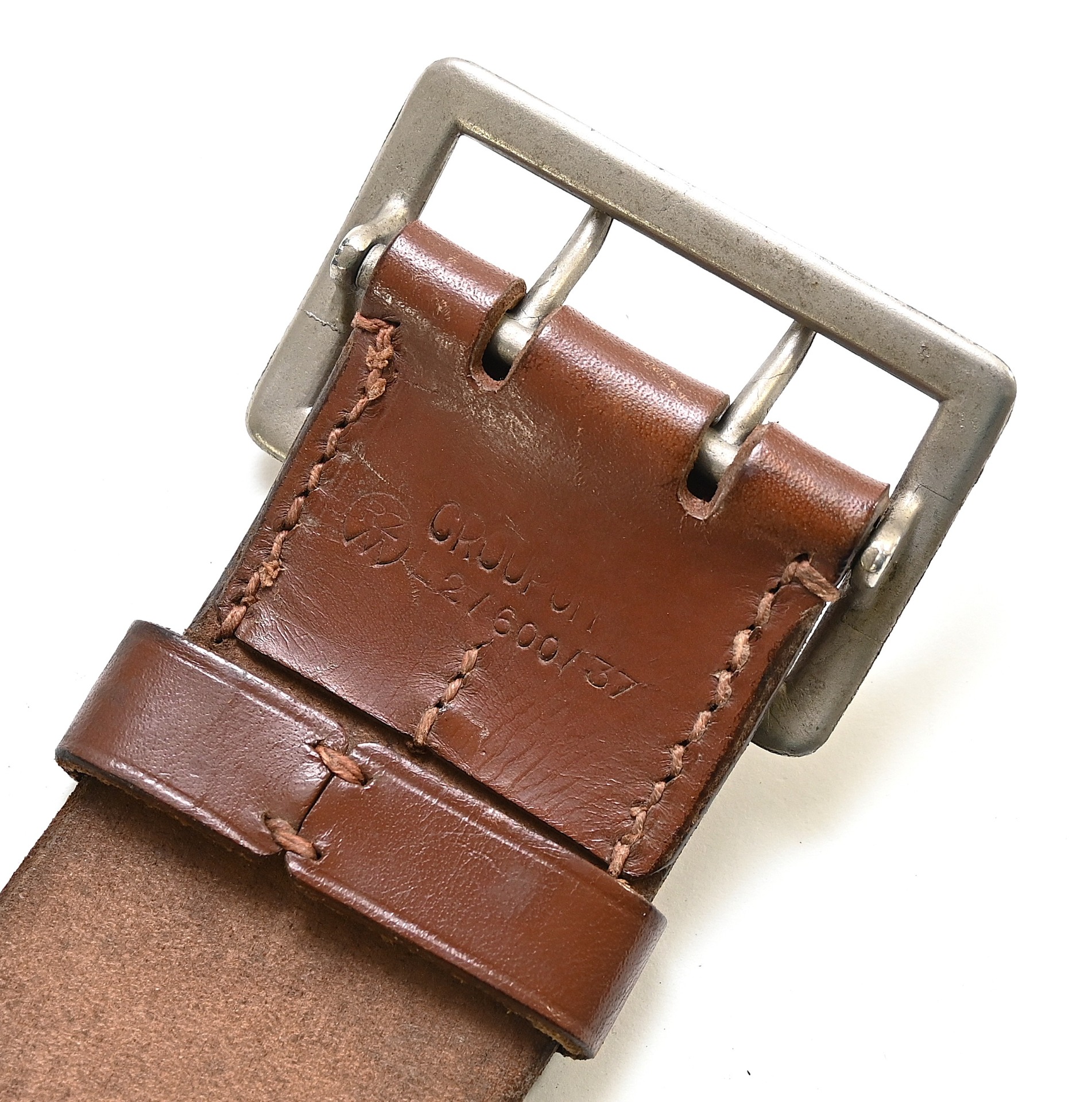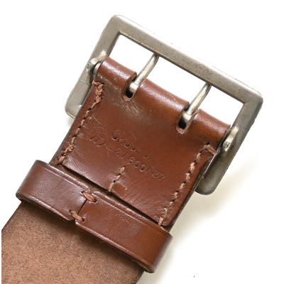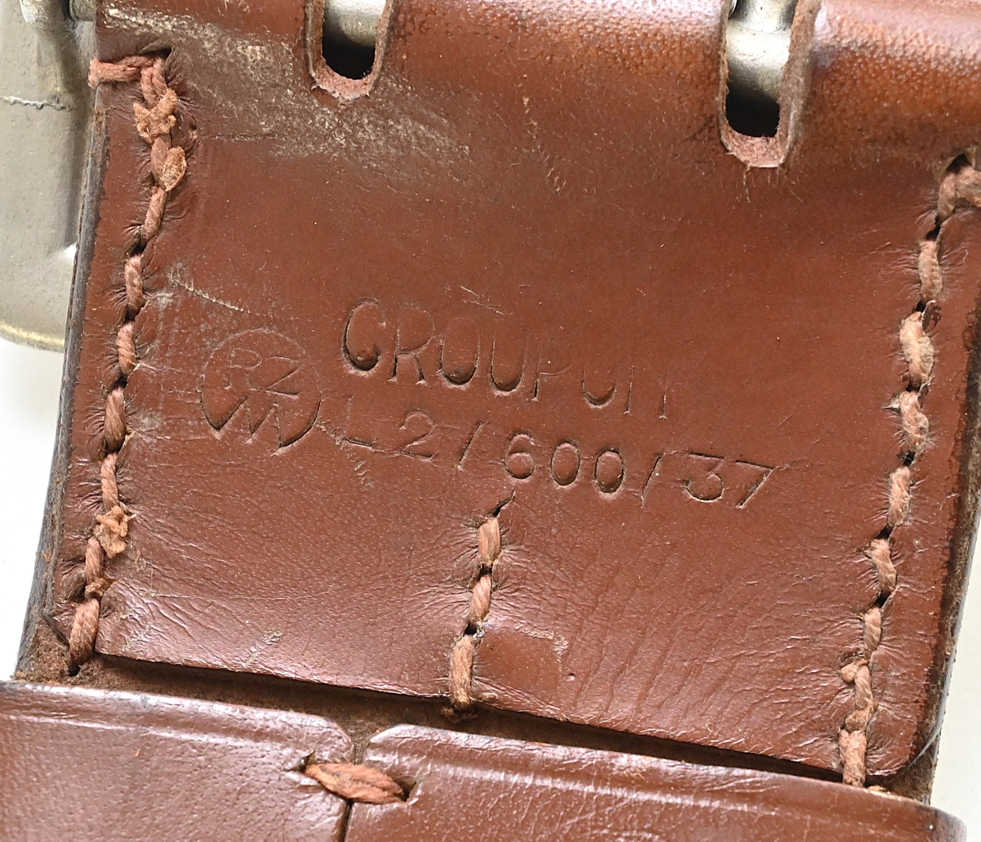 Teh belt shows overall normal signs of wear. The leather is supple and solid. It's nicely marked 'Croupon RZM L2/600/37'. The buckle is also marked with 'RZM M5/71'.