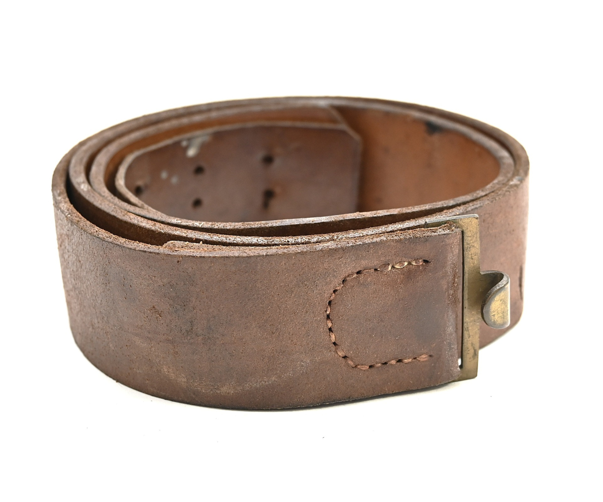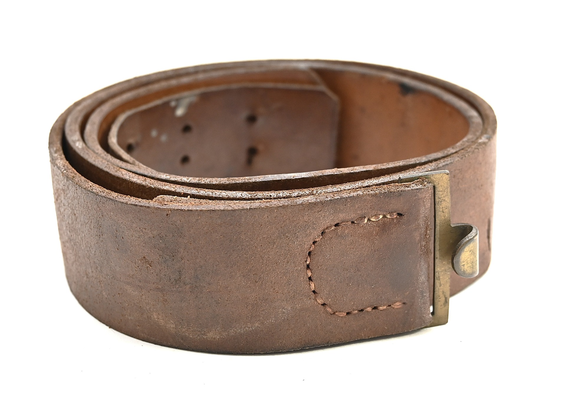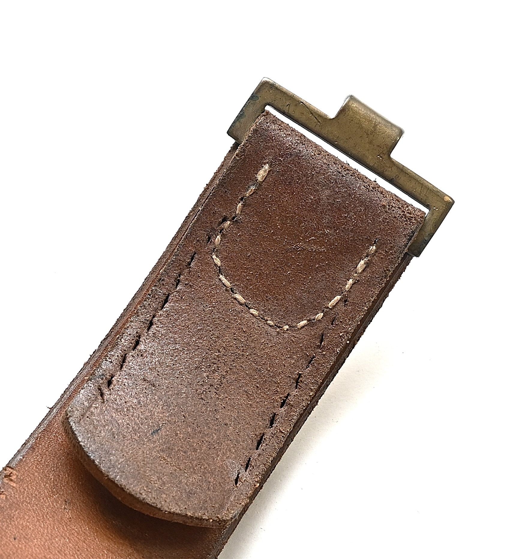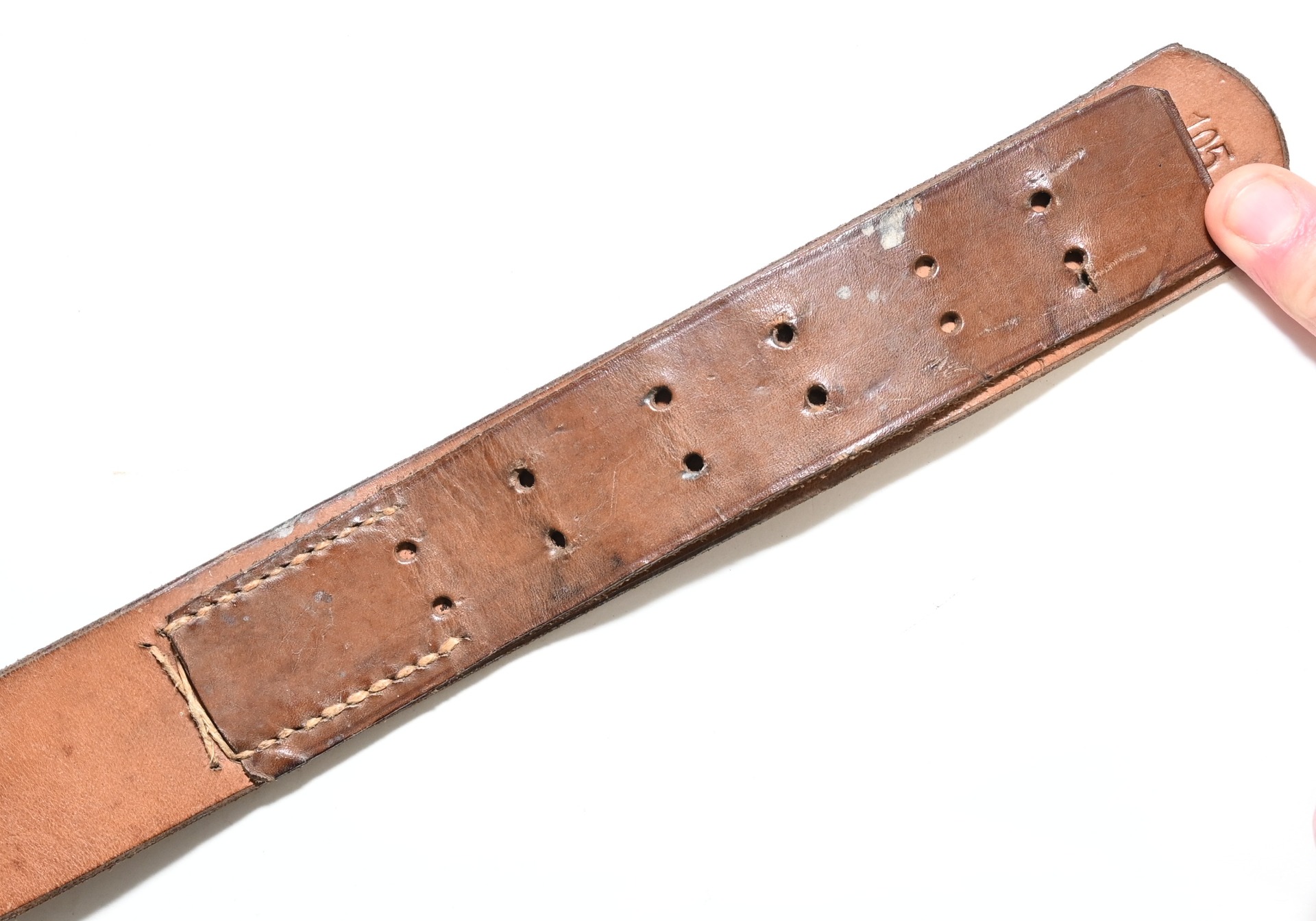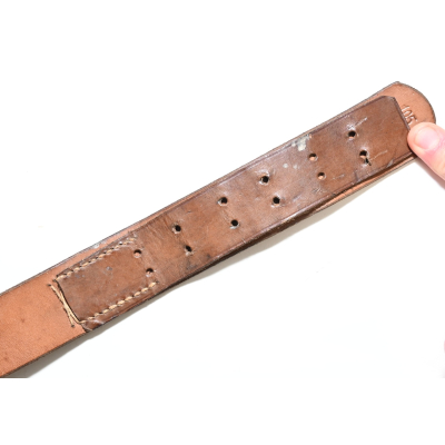 The belt shows overall normal signs of wear. The leather is supplie and solid. Complete with brass hardware. It has been period shortene which is only visible on the back.
