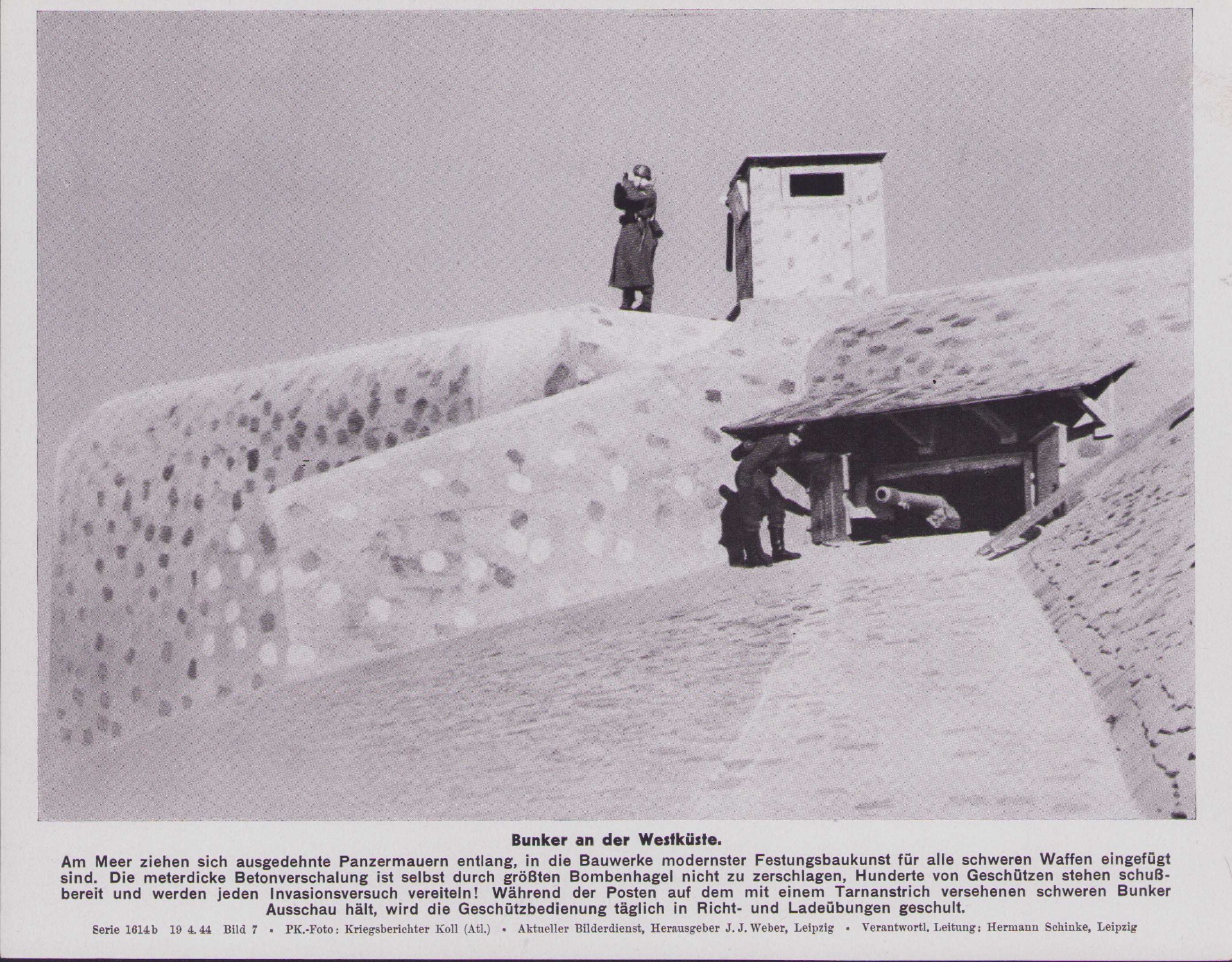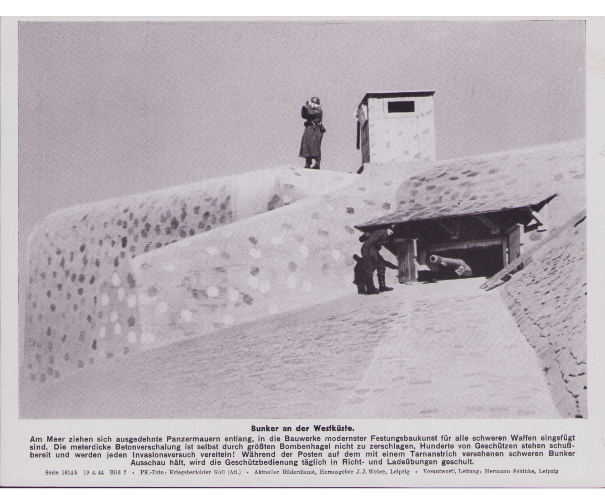 The photo shows overall normal signs of storage wear. Very nice shot of a large, camouflaged Atlantik Wall bunker.