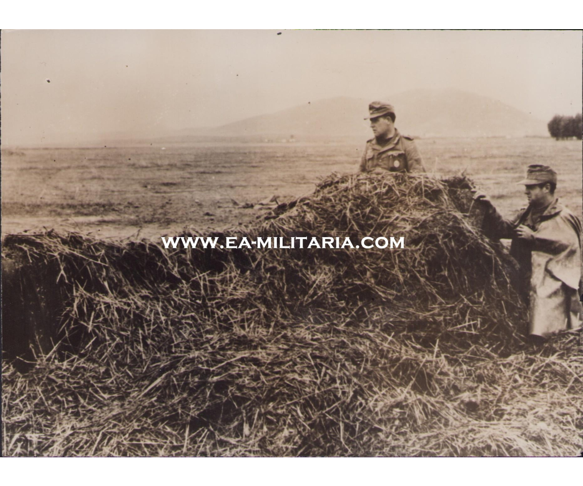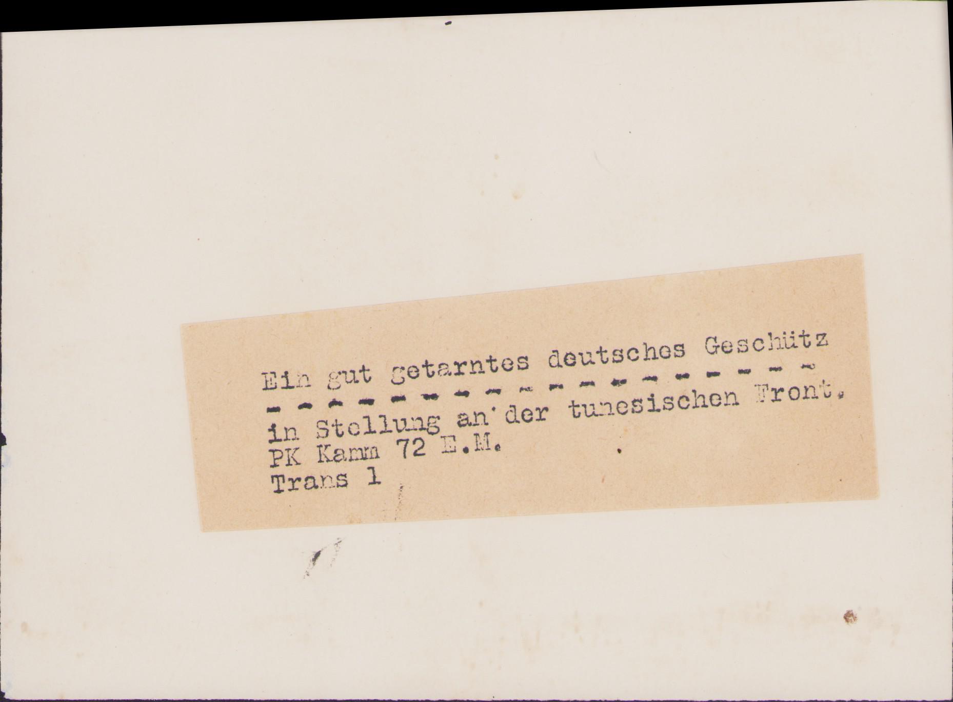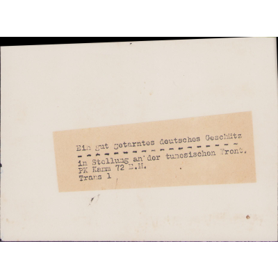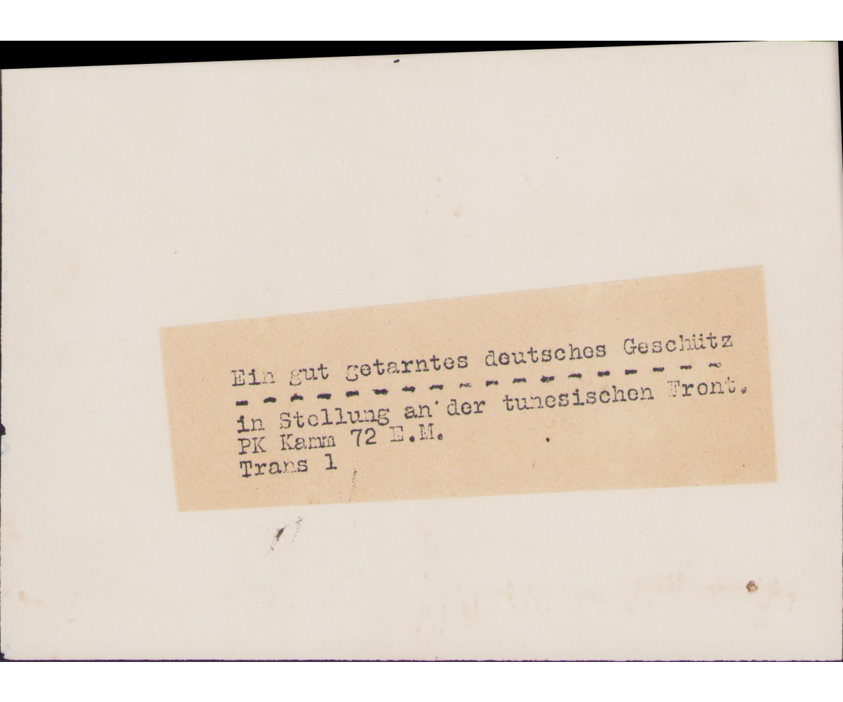 The photograph shows overall normal signs of storage wear. It's complete with paper caption on the back. Here we see a wll camouflaged German 7.5cm PaK40 gun crew.