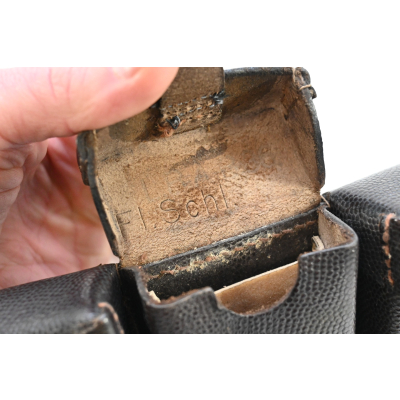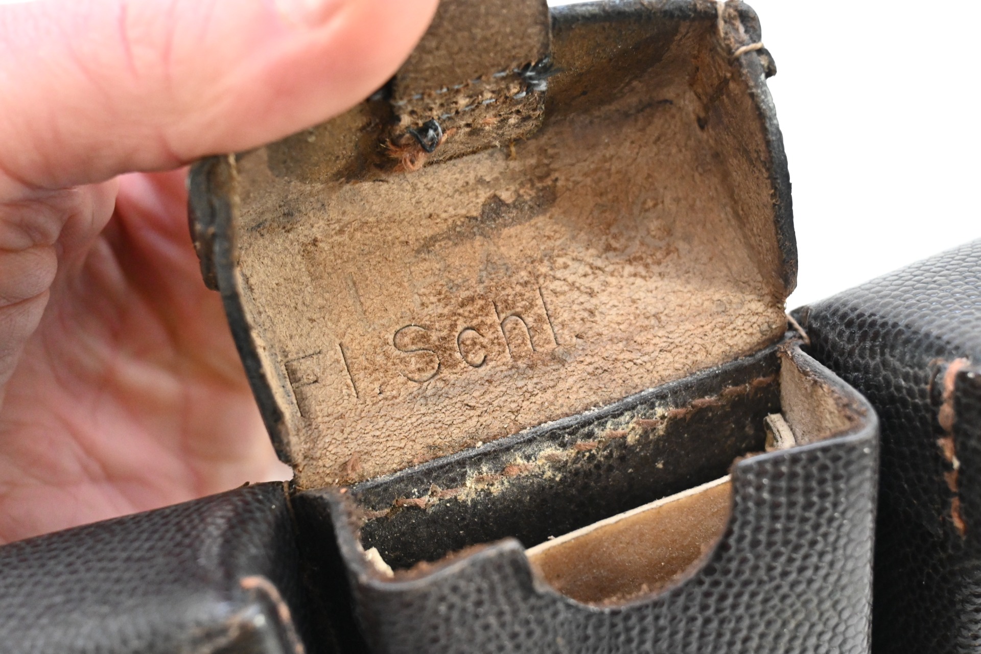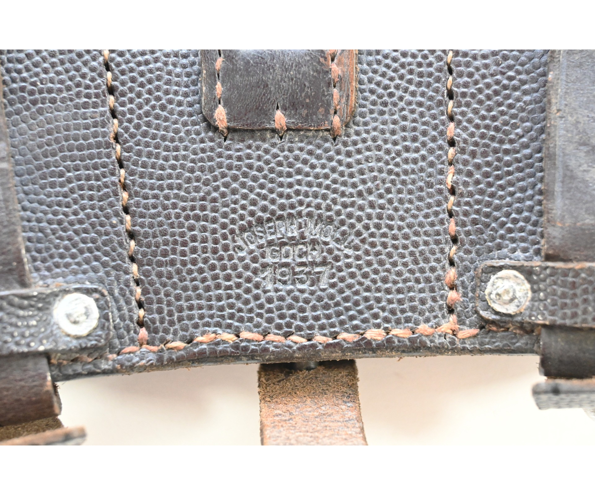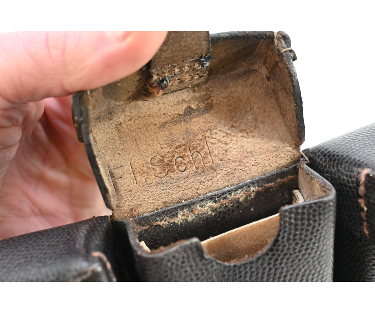 The pouch shows overall signs of war. The leather is supple and solid, however each strap on the front have been repaired/replaced. This is nicely done tho. On the inside all the partitions are present. And the middle section is marked 'Fl.Schl' which stands for 'Flieger Schule'. It's nicely marked on the back by the maker 'Joseph Moll' from Goch and dated 1937.