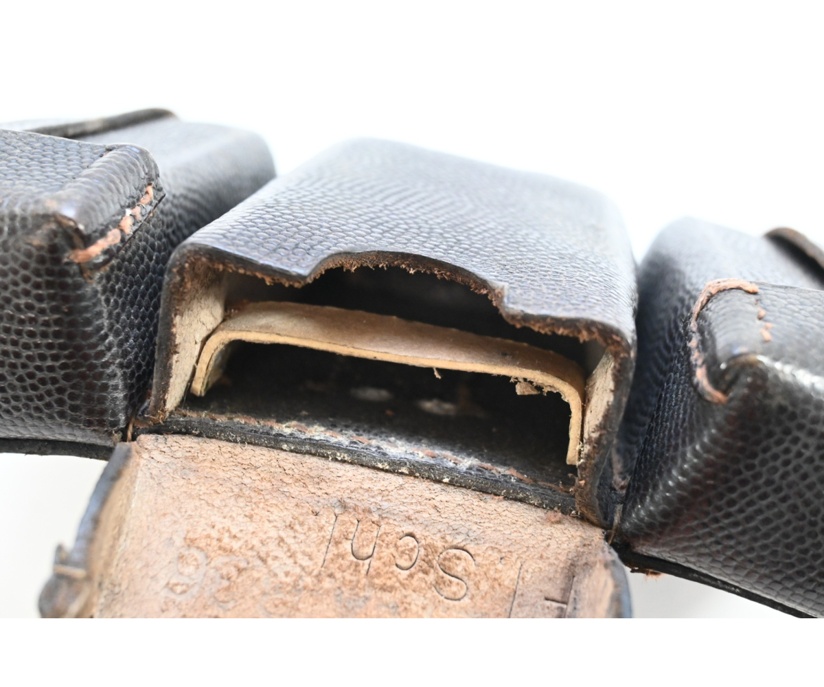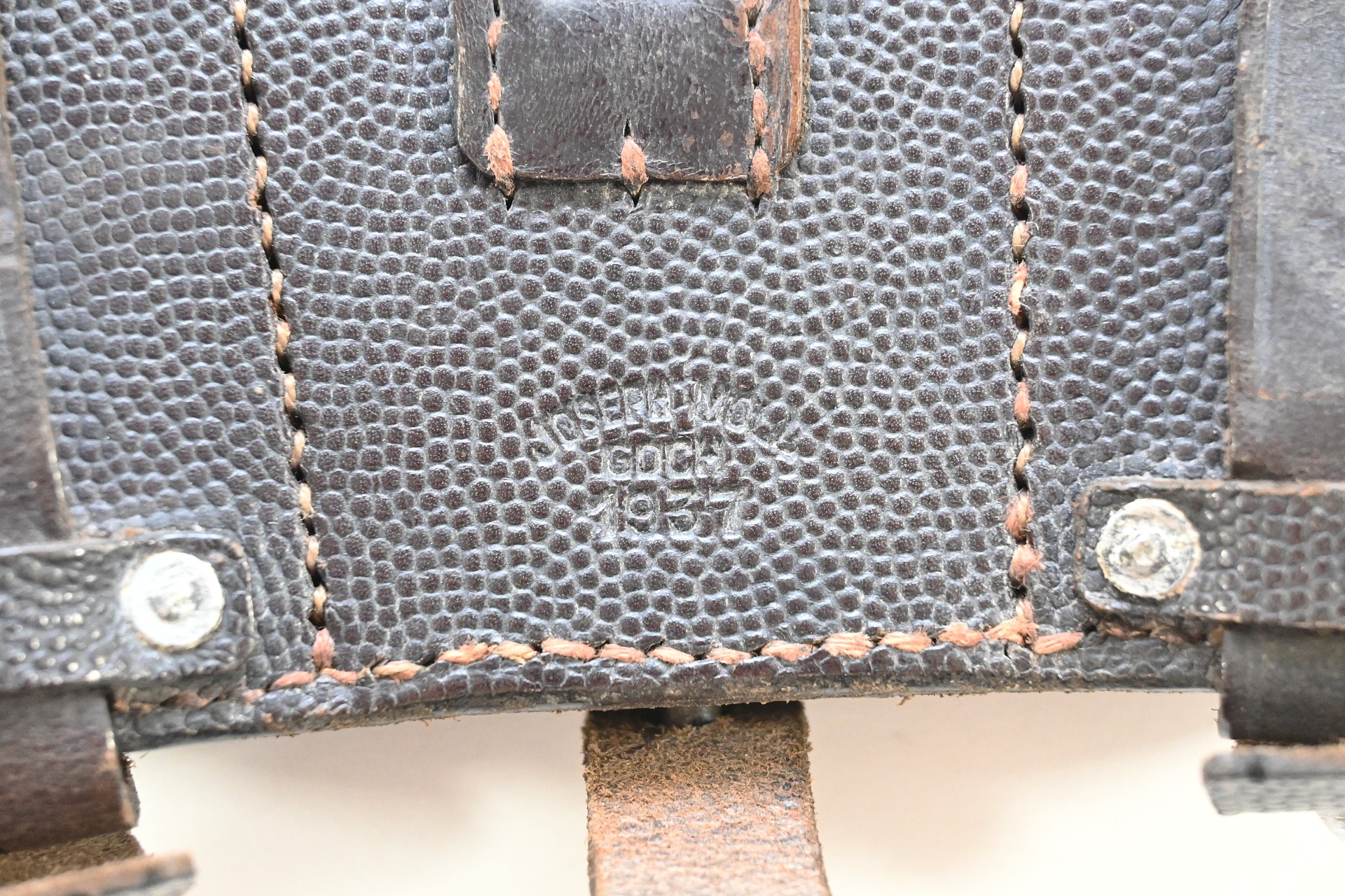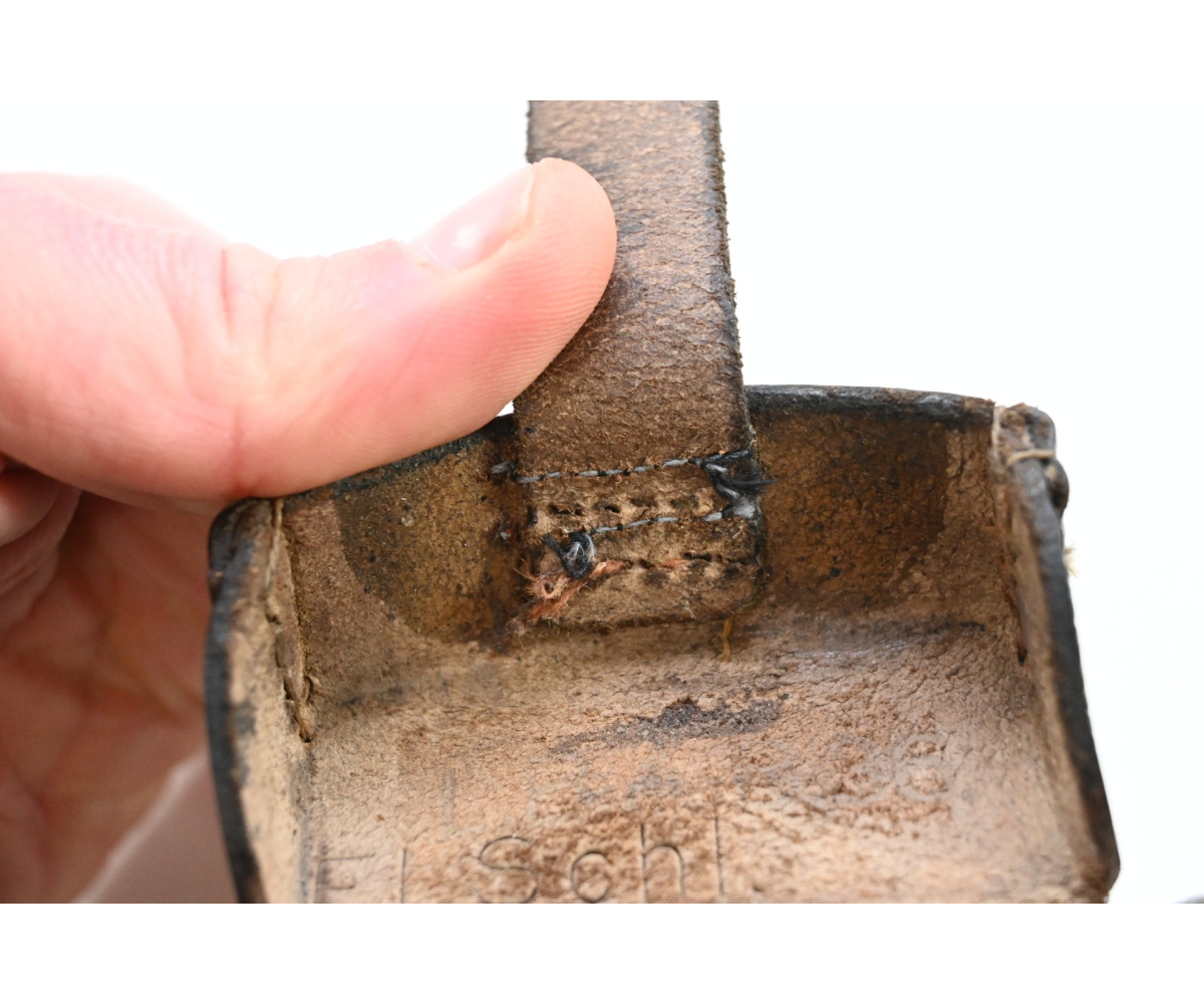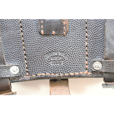 The pouch shows overall signs of war. The leather is supple and solid, however each strap on the front have been repaired/replaced. This is nicely done tho. On the inside all the partitions are present. And the middle section is marked 'Fl.Schl' which stands for 'Flieger Schule'. It's nicely marked on the back by the maker 'Joseph Moll' from Goch and dated 1937.