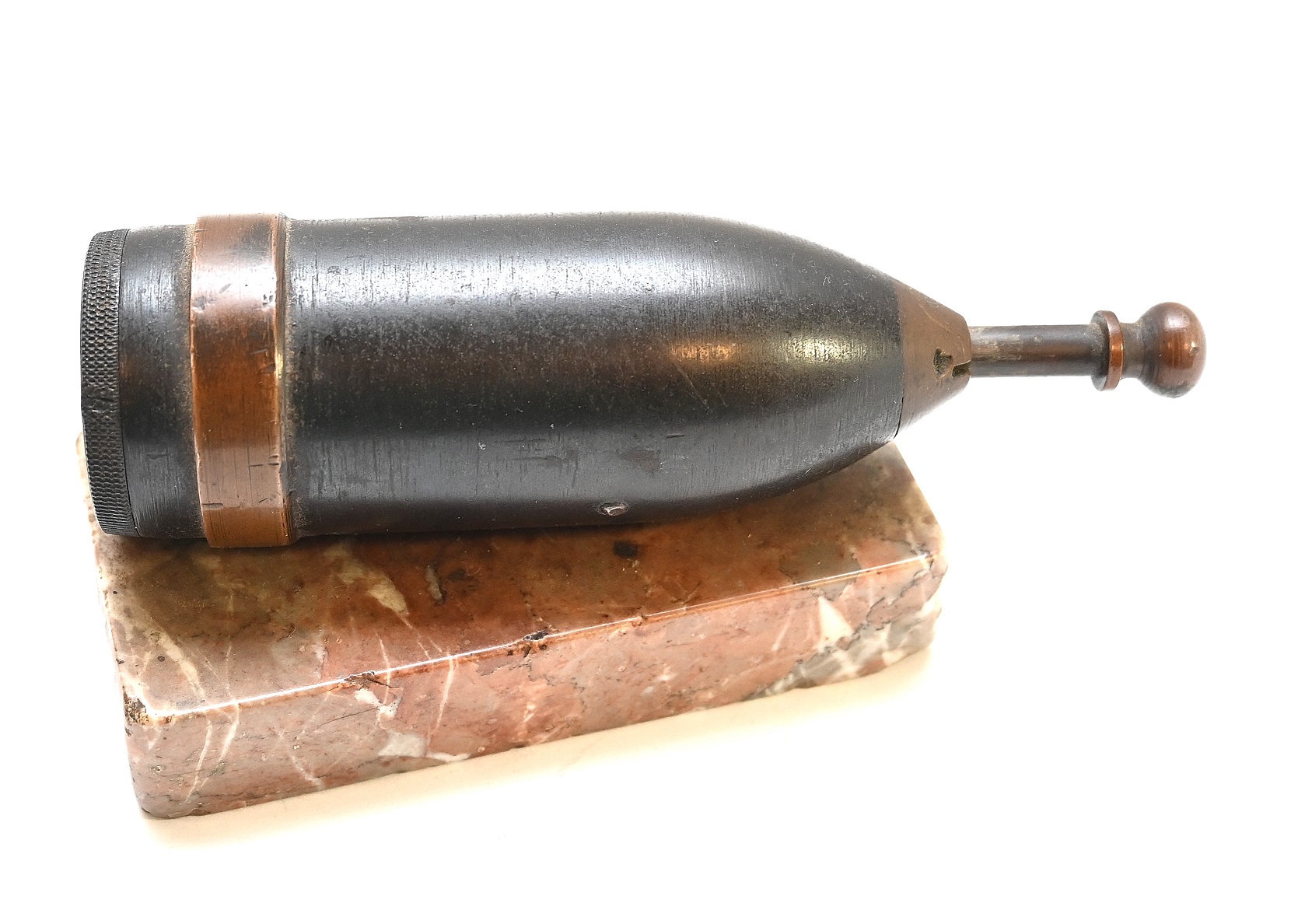 The ornament shows overall normal signs of wear. It's a 3,7cm shell made into a cigar cutter. It's in working order. Mounted on a piece of marble.