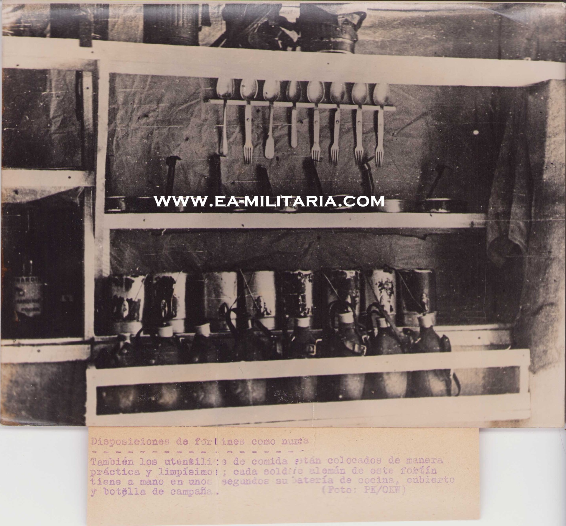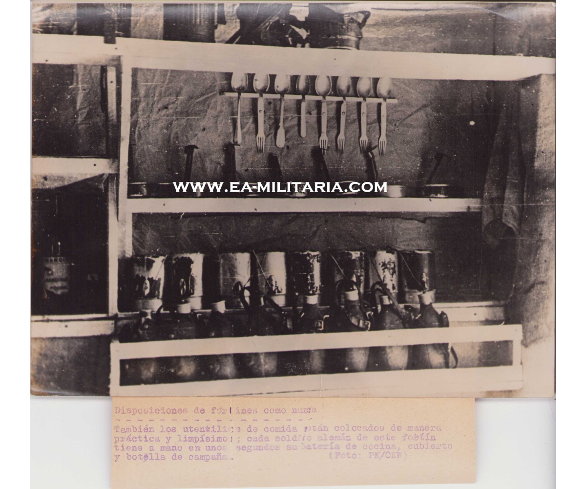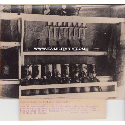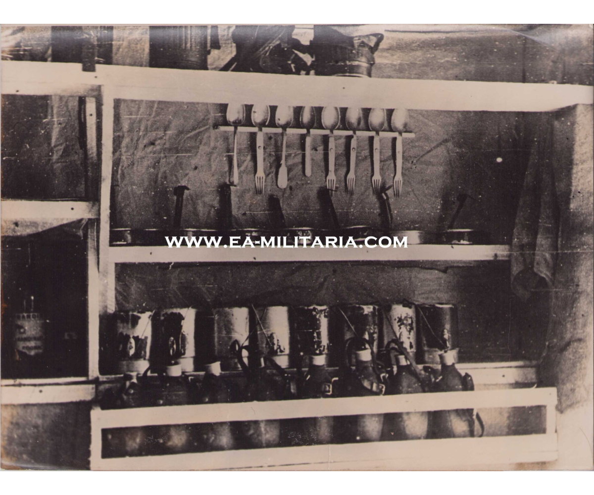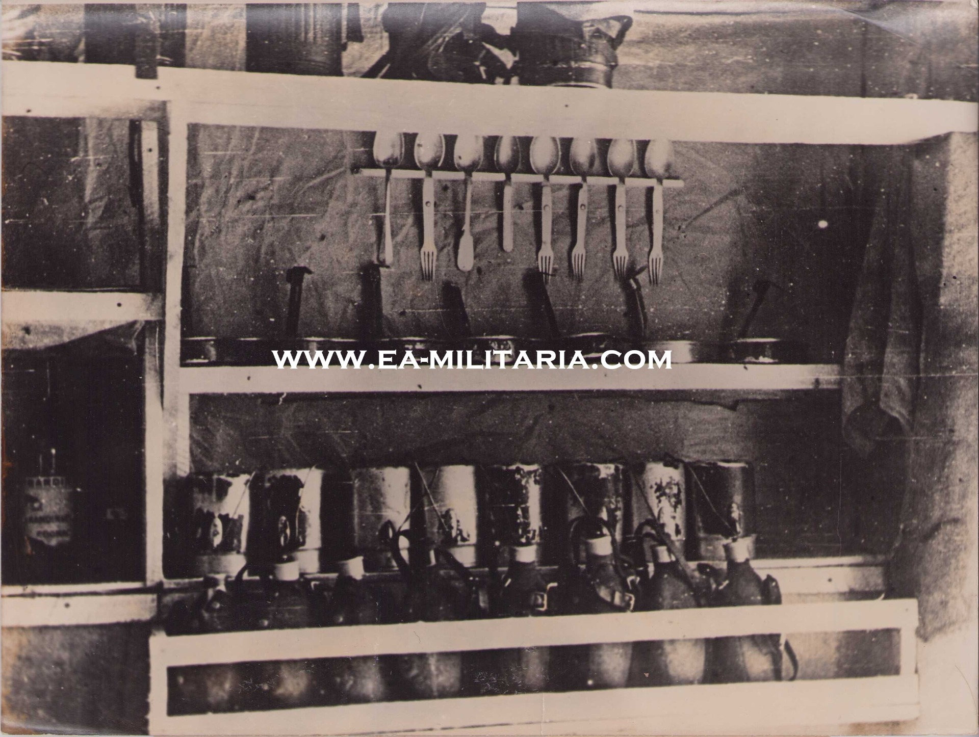 The photo shows overall normal signs of storage wear. It's complete with (Italian) paper caption on the back. It shows the (bunker) kitchen set up of Goffels, Kochgeschirrn and Canteens.