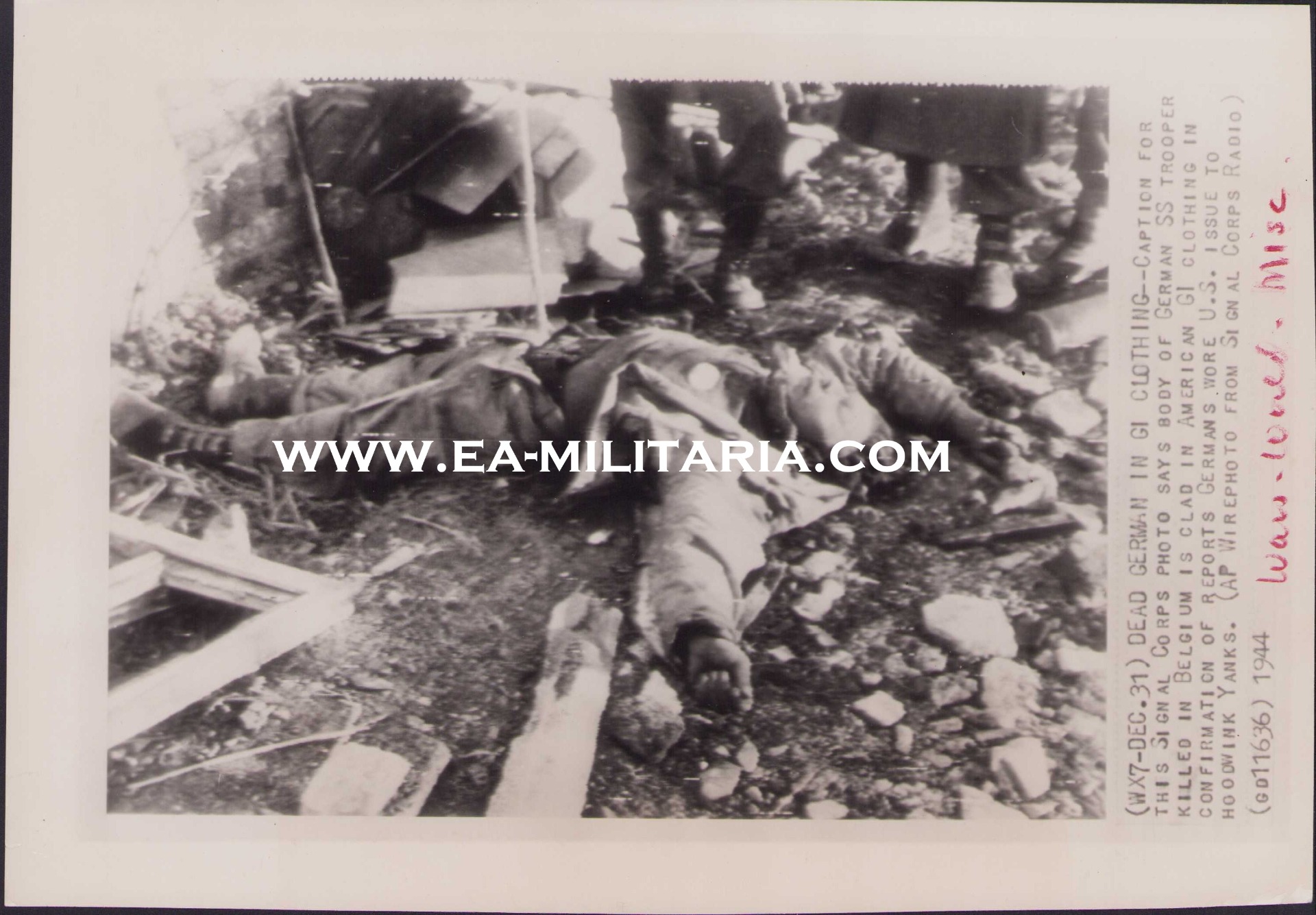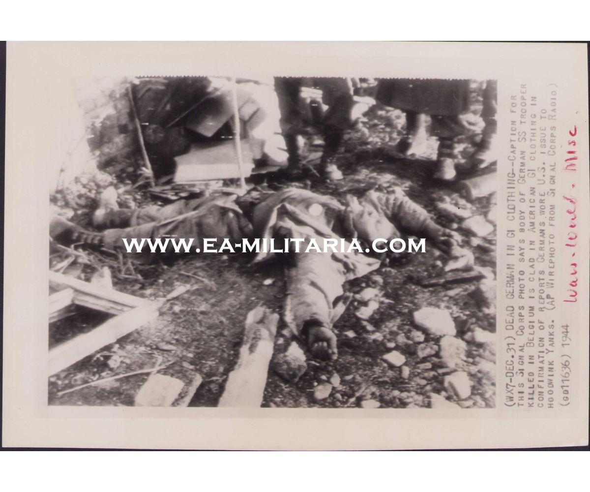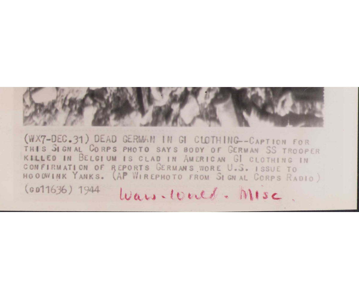 The photograph shows overall normal signs of storage wear. It's complete with typed description on the front which says 'Dead German in GI-Clothing'. The German soldier is one of SS-Standartenführer Otto Skorzenys' men who was killed during Operation Greif, a German operation within the Battle of Bulge with the task of capturing 1 of more bridges over the Meuse river. His soldiers wore captured British and American uniforms and drove captured Allied vehicle and were to cause confision in the rear of the Allied lines.