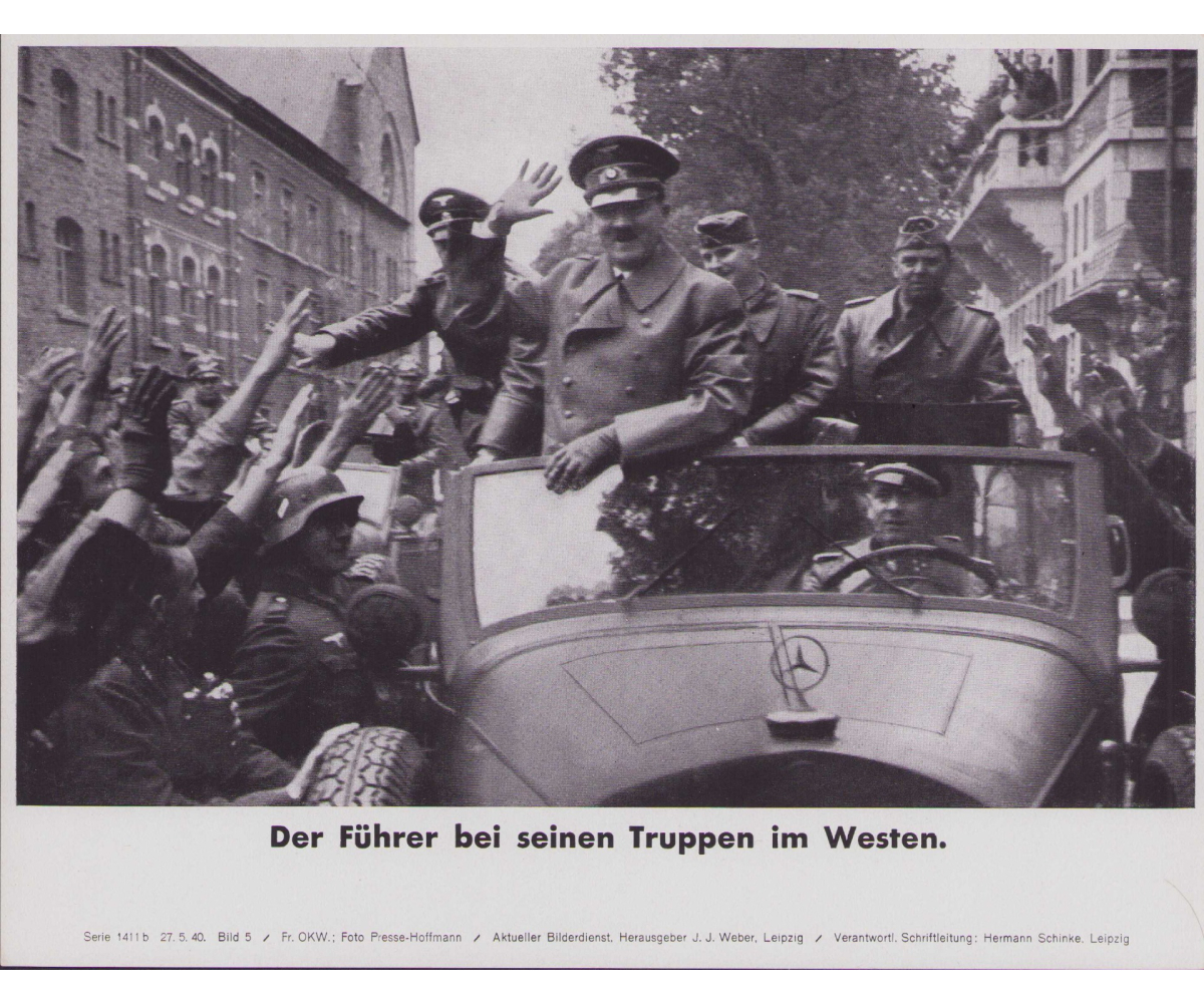 The photo shows overall normal signs of storage wear. It shows Adolf Hitler in his staffcar visiting the troops in Bastogne, Belgium. His driver is Erich Kempka.