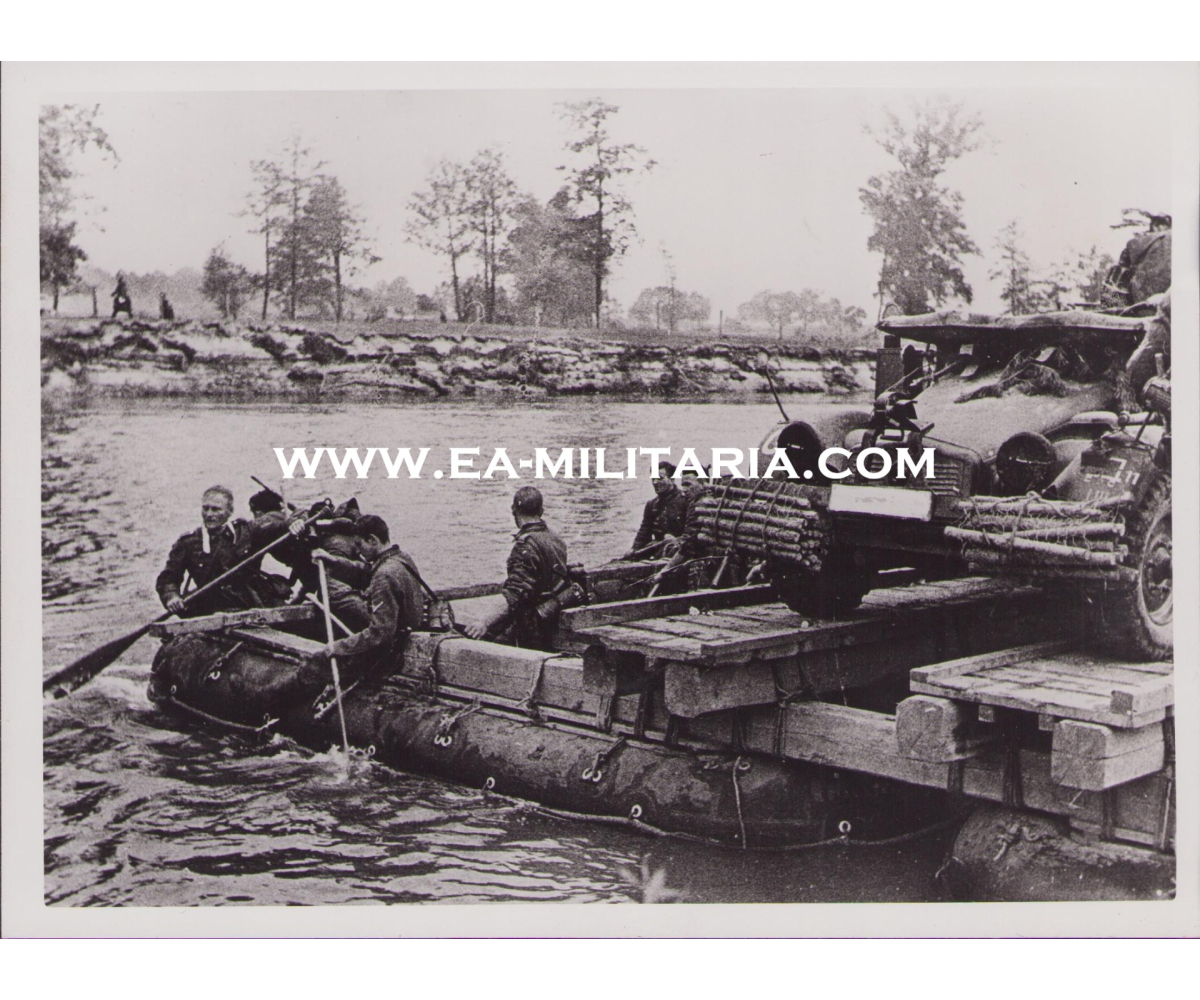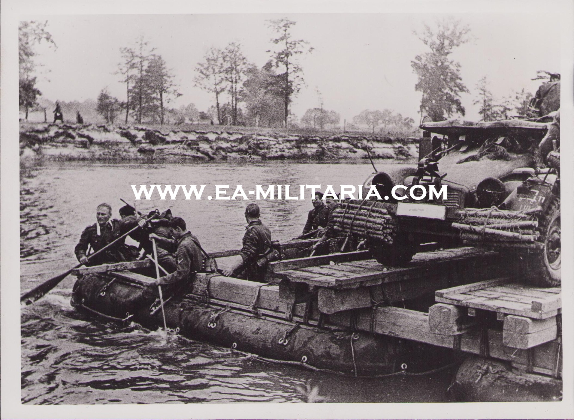The photo shows overall normal signs of storage wear. It's complete with paper caption on the back. Here German soldiers are crossing a river. The vehicle on the raft is a Krupp Protze.