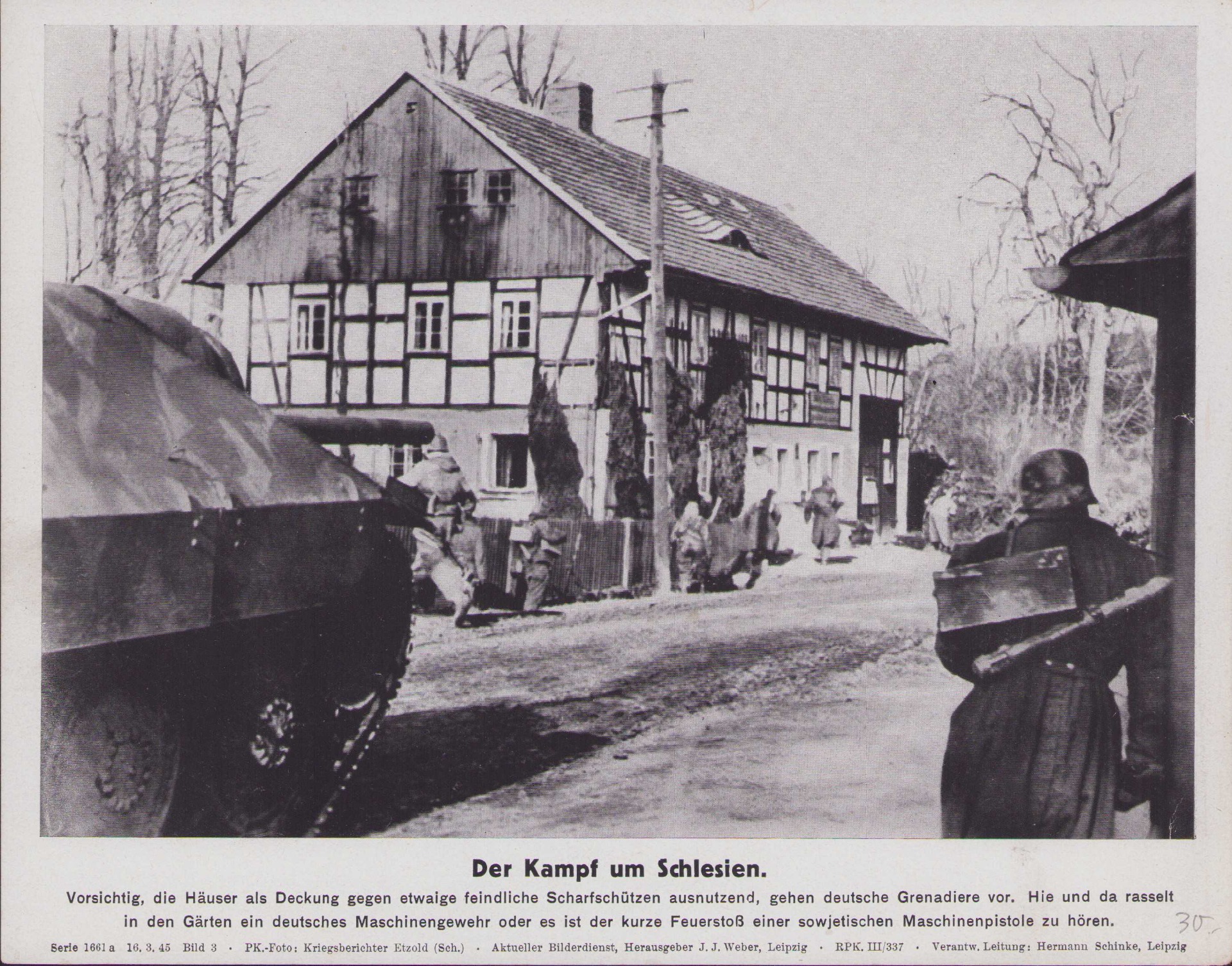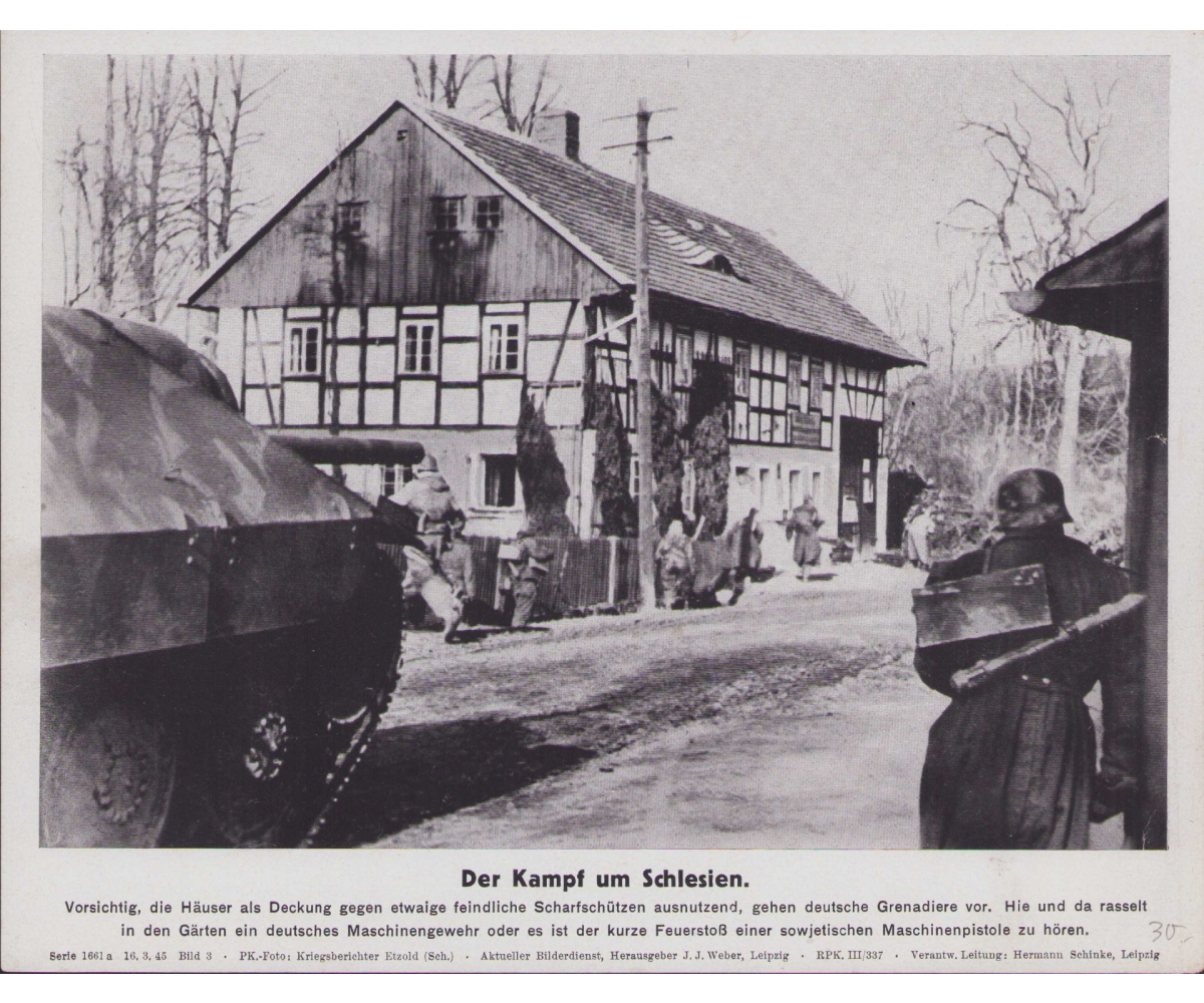 The photo shows overall normal signs of storage wear. Here a Hetzer Panzerjäger and Grenadiere are carefully moving forward in a small town.