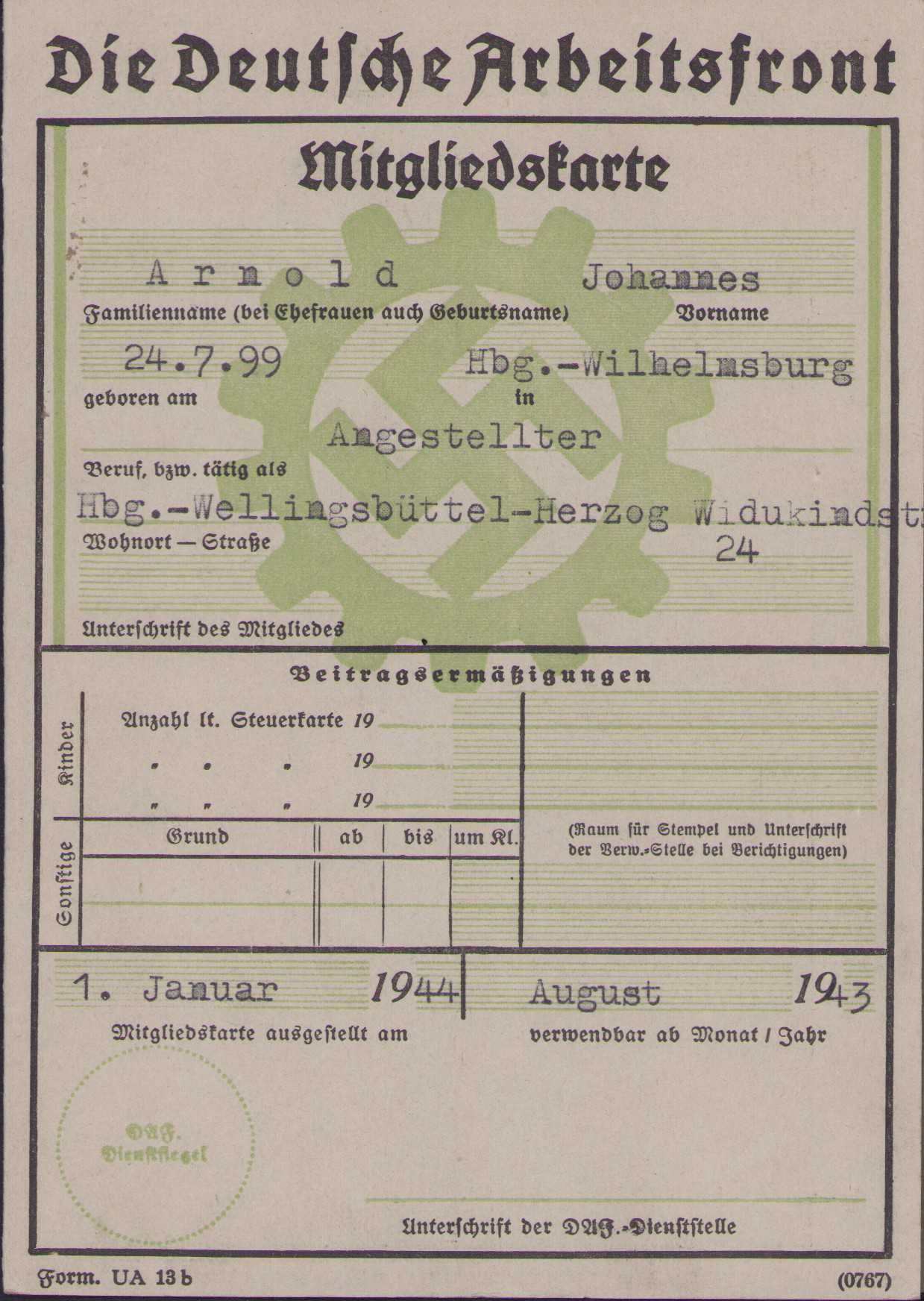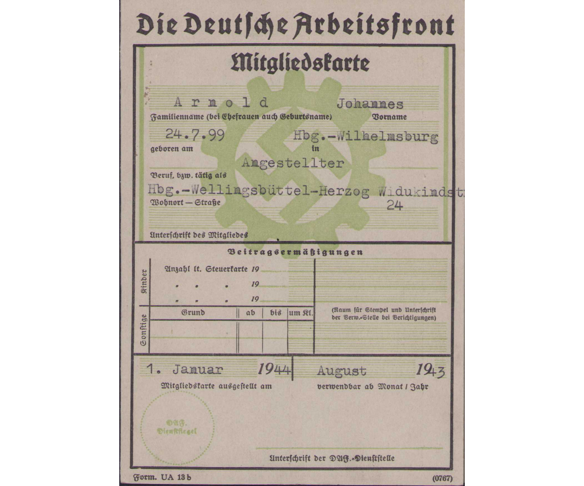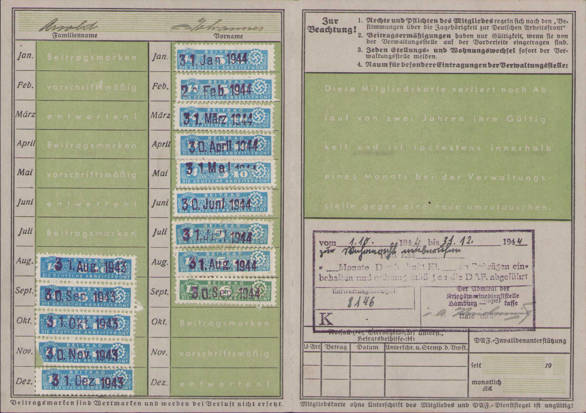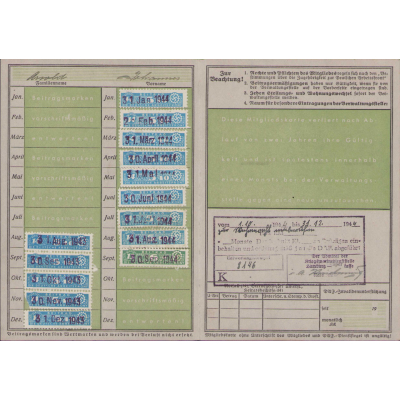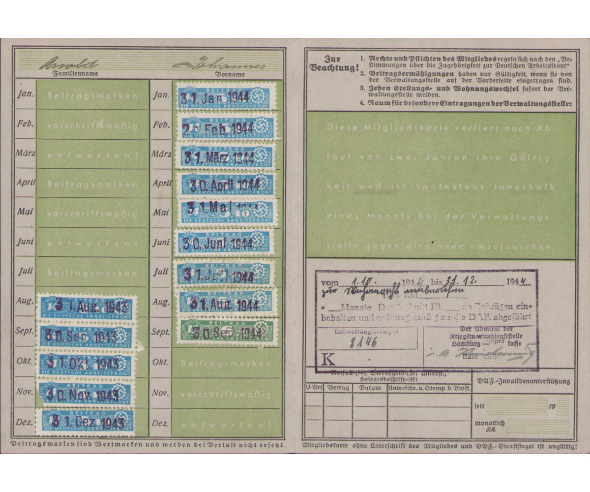 The card shows overall normal signs of wear. It's named to Arnold Johannes. It's dated 1943/44. The inside contains a couple of contribution stamps.