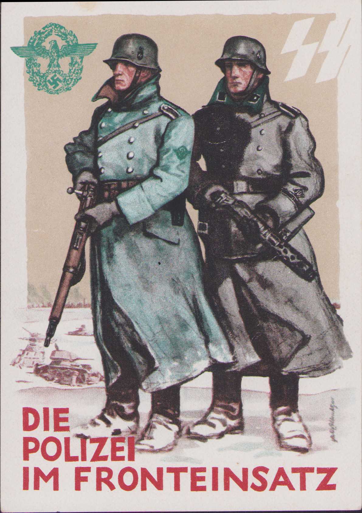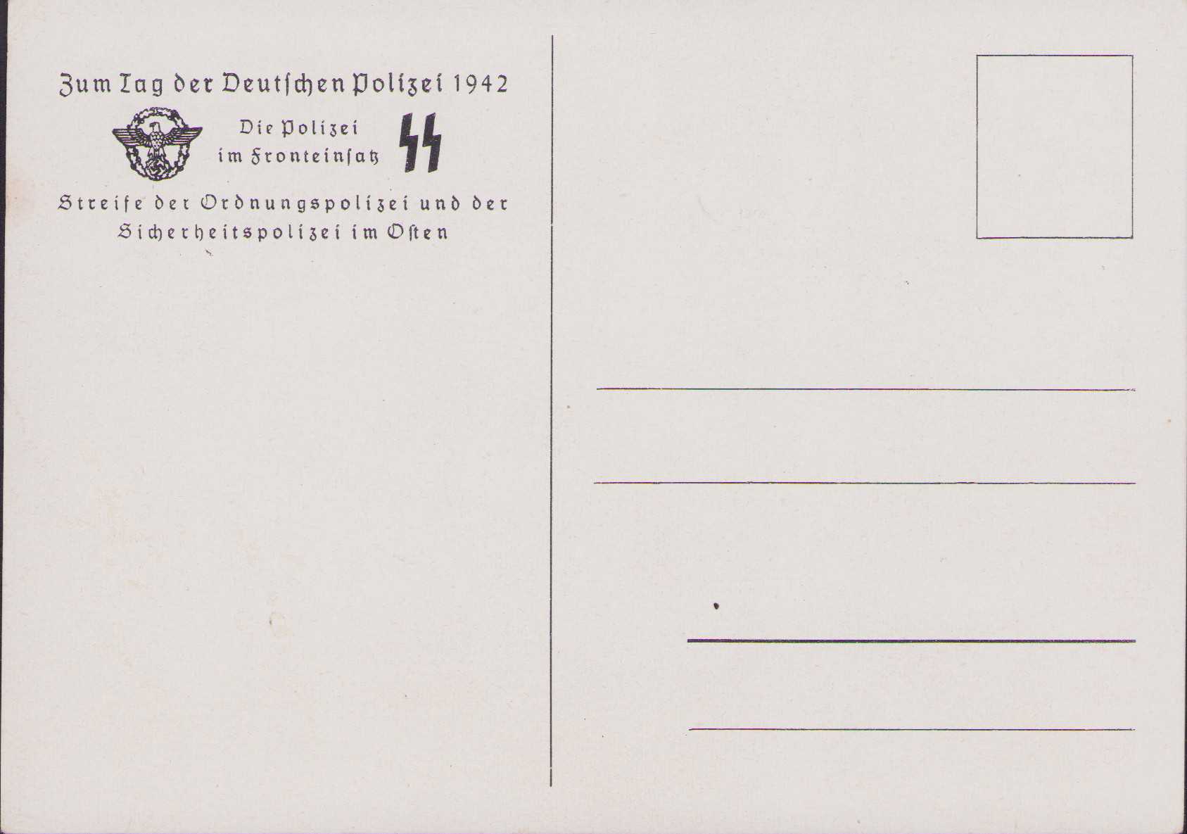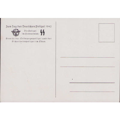 The postcard shows overall normal signs of storage wear. On the back nicely marked with the Polizei decal and SS runen. 'Zum Tag der Deutschen Polizei 1942'.