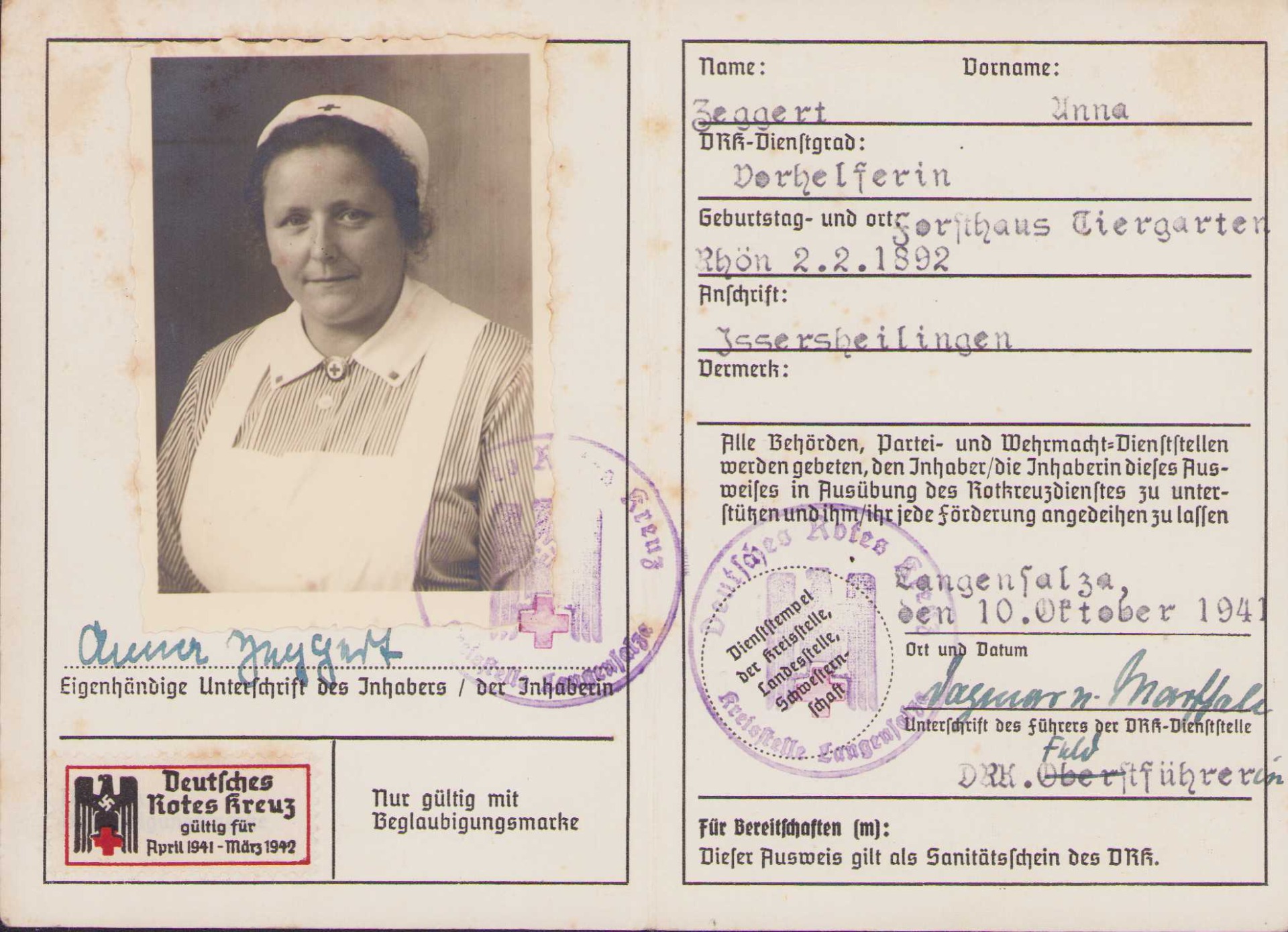 The card shows overall normal signs of wear. It's complete with poertrait photo of Anna Zeggert who was a Vorhelferin. The card is dated 10 October 1941.