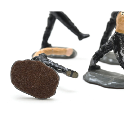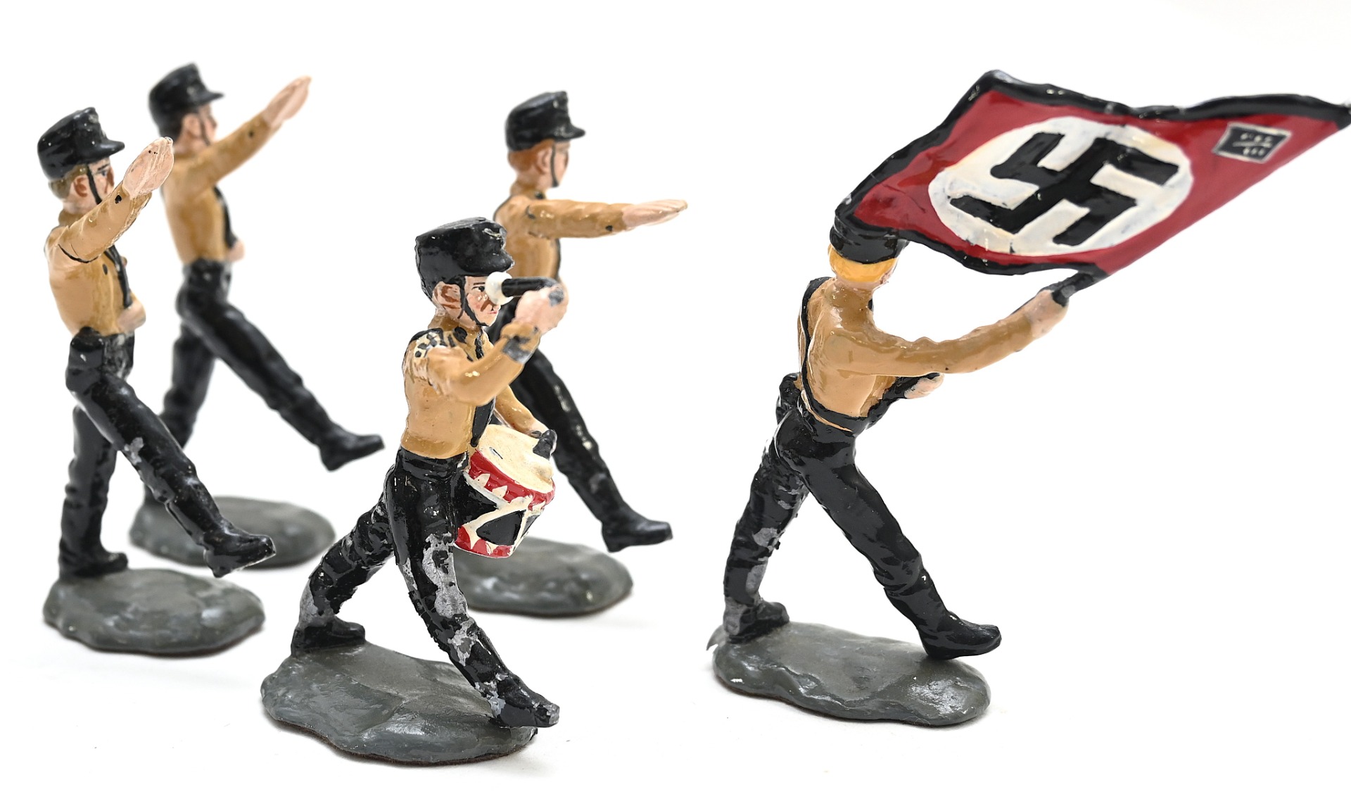 The soldiers show overall signs of wear. Consist out of 3 marching men, 1 with drums and a standard bearer.
