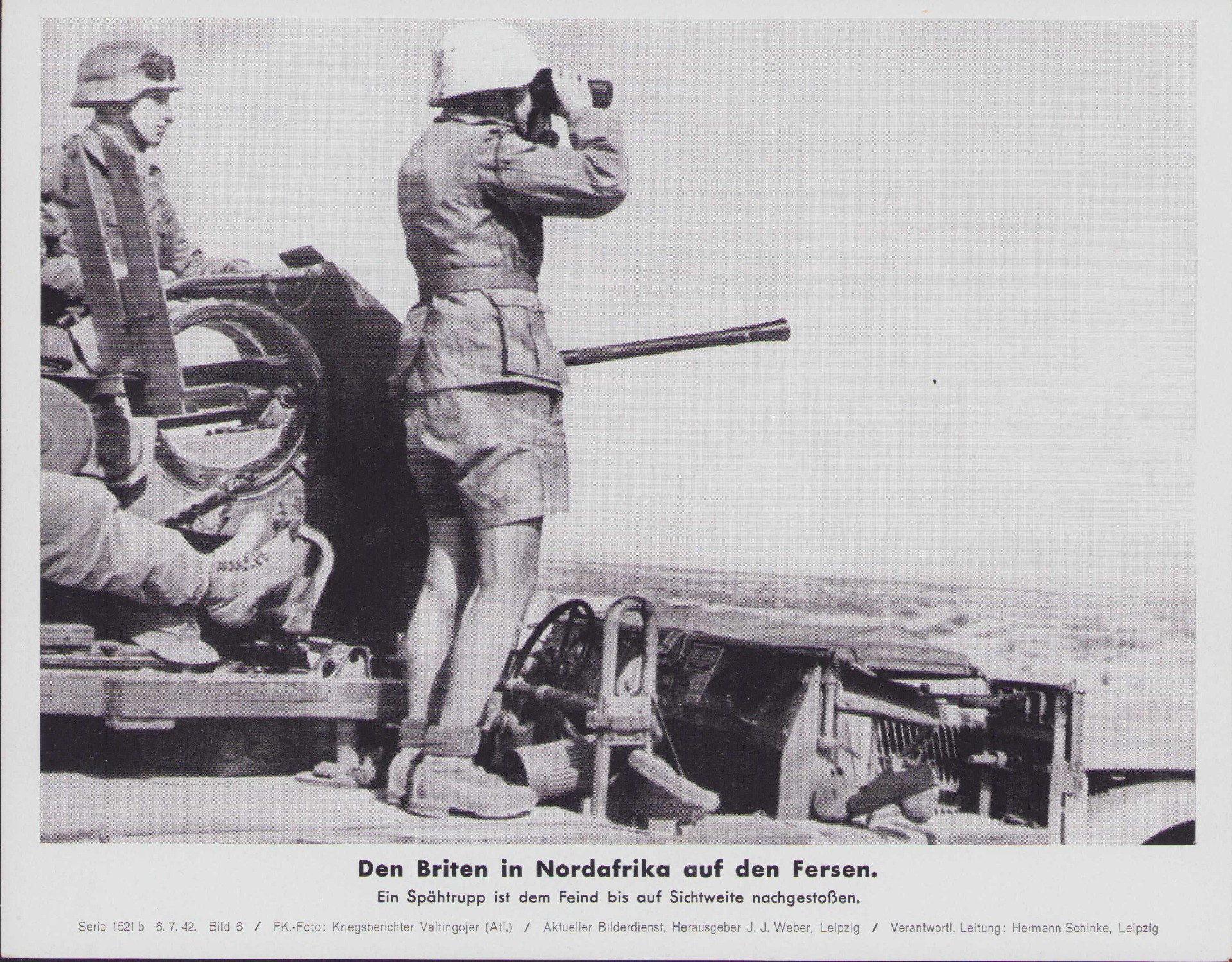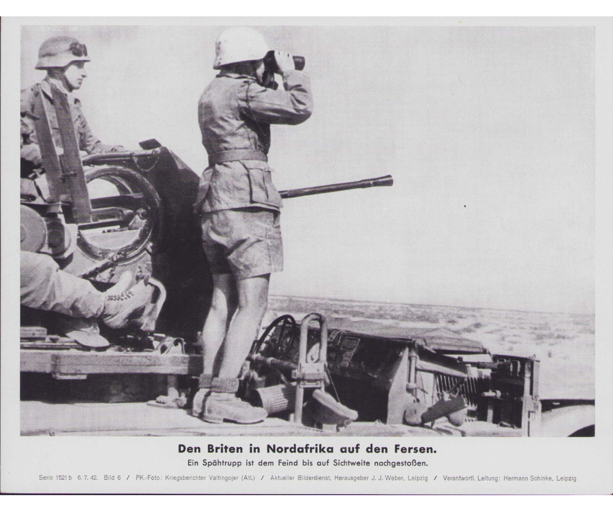 The photo shows overall normal signs of storage wear. It shows a 2cm Flak canon mounted on a halftrack. One soldier is looking through his binoculars. Note his camouflaged helmet.