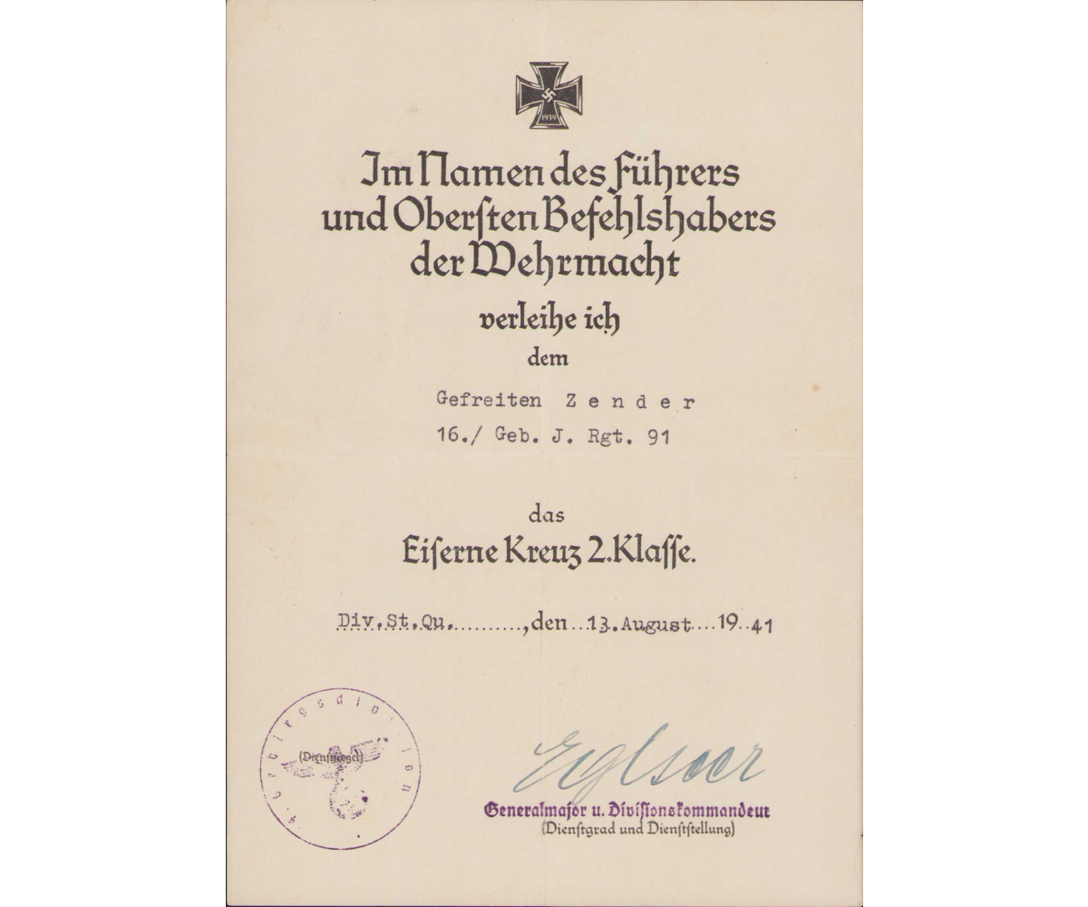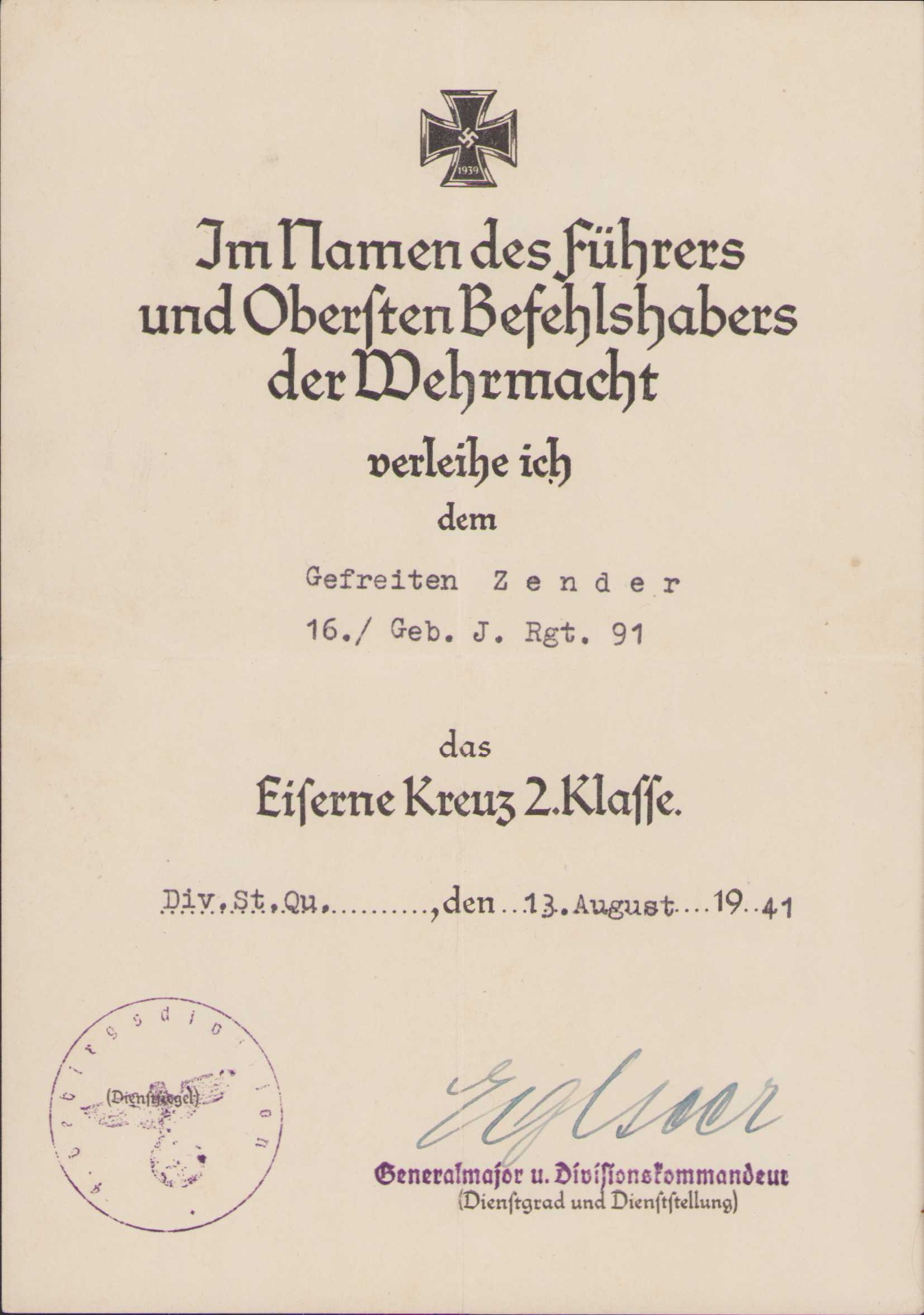 The document shows overall normal signs of wear. It's solid and free of damages. The medal was awarded to Gefreiten Zender who served in the 16.Kompanie Gebirgsjäger Regiment 91. This regiment was formed in 1940 and was part of the 4.Gebirgs-Division (Enzian). It operated in the Balkans and then mainly in Russia. The medal was awarded on the 13th of August 1941.
