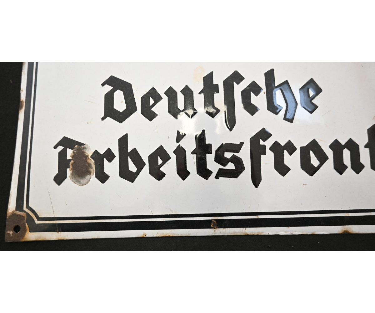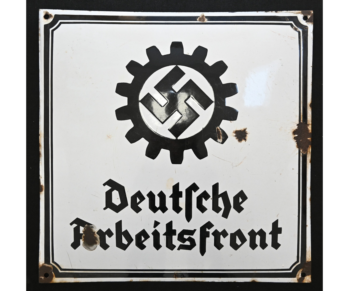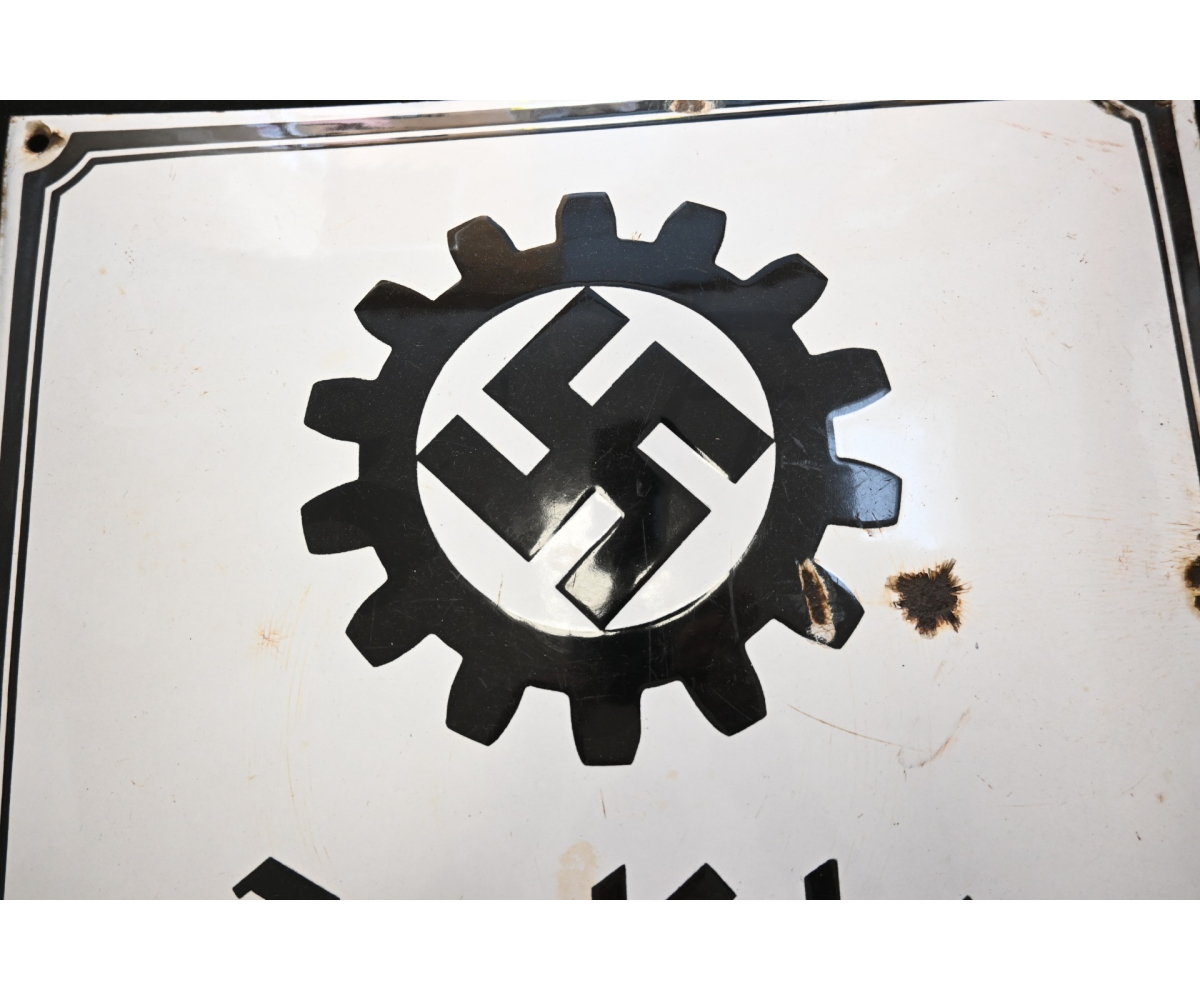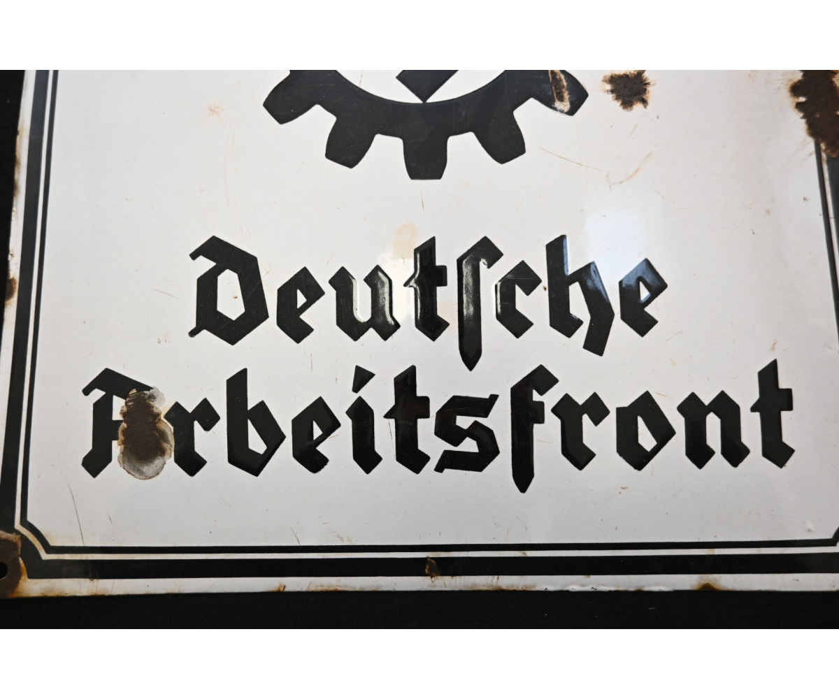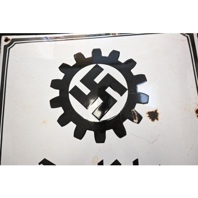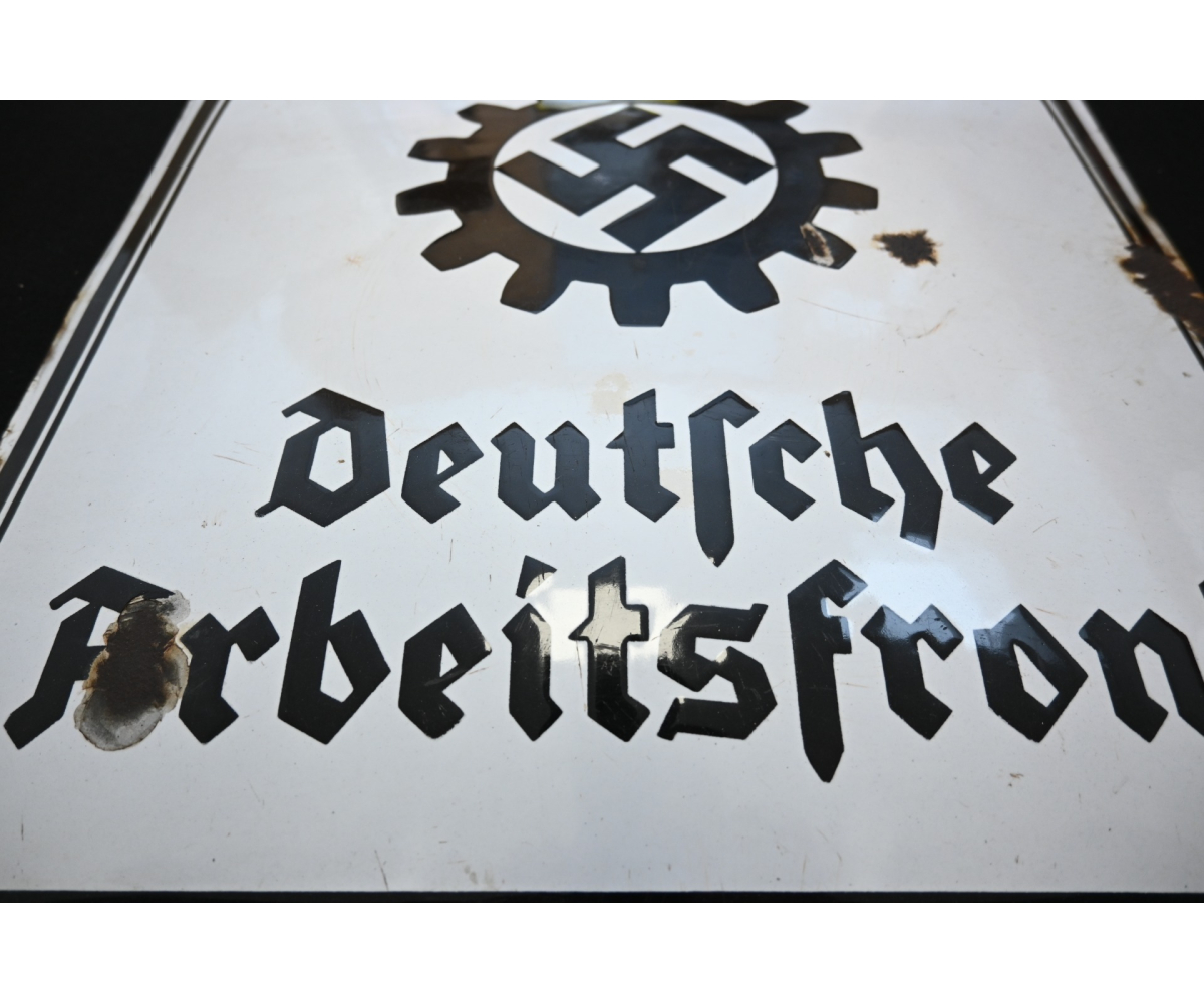 The sign shows overall normal signs of wear. The text 'Deutsche Arbeitsfront' and the Swastika are intact. Size of the sign is approx. 50cm*50cm.