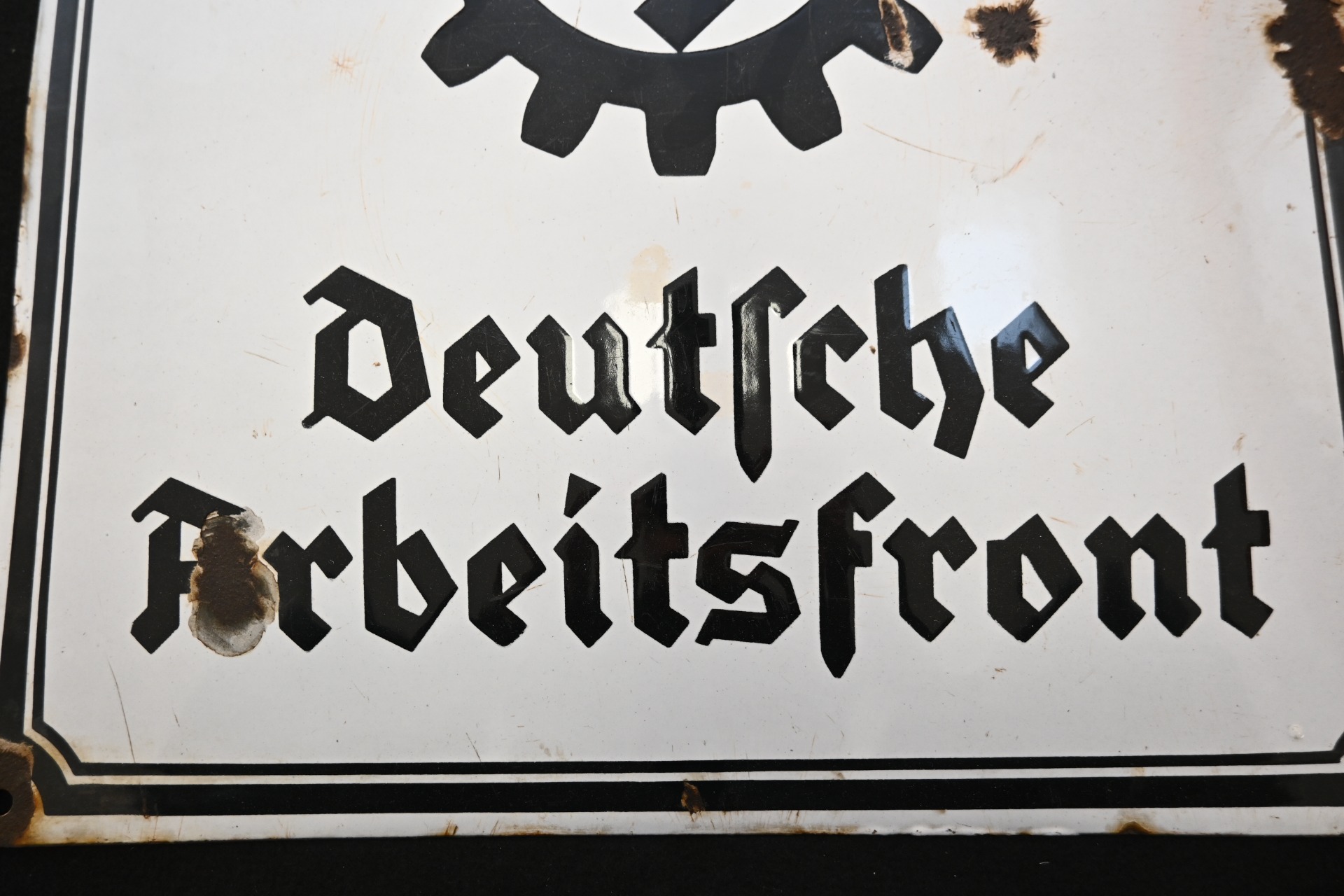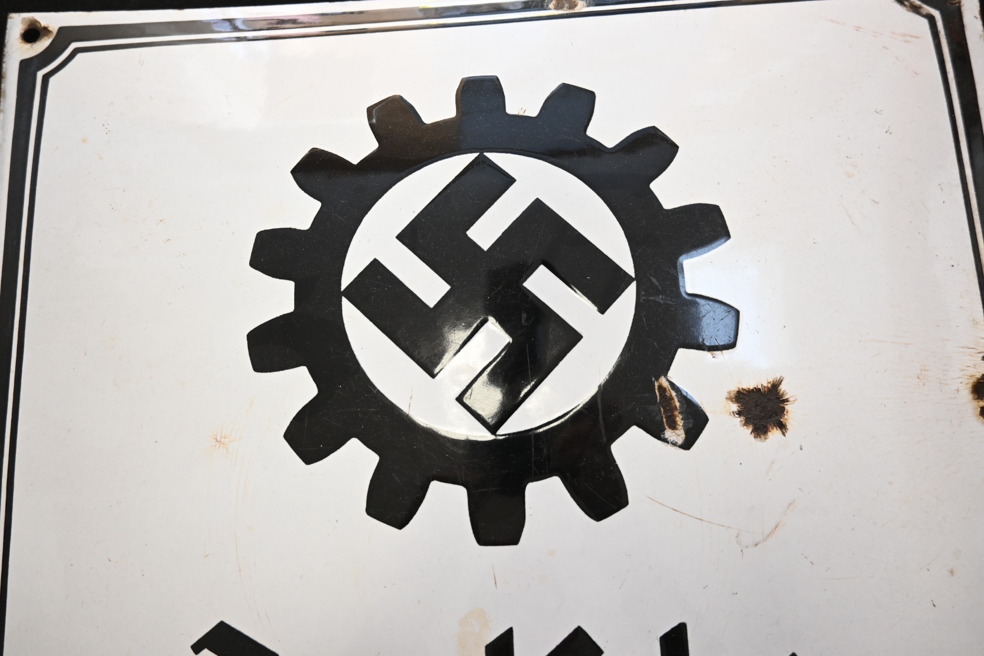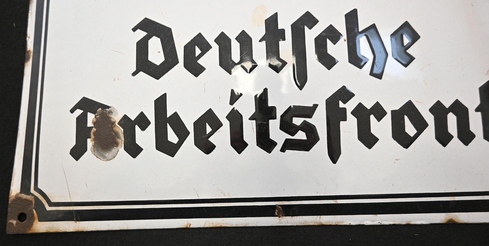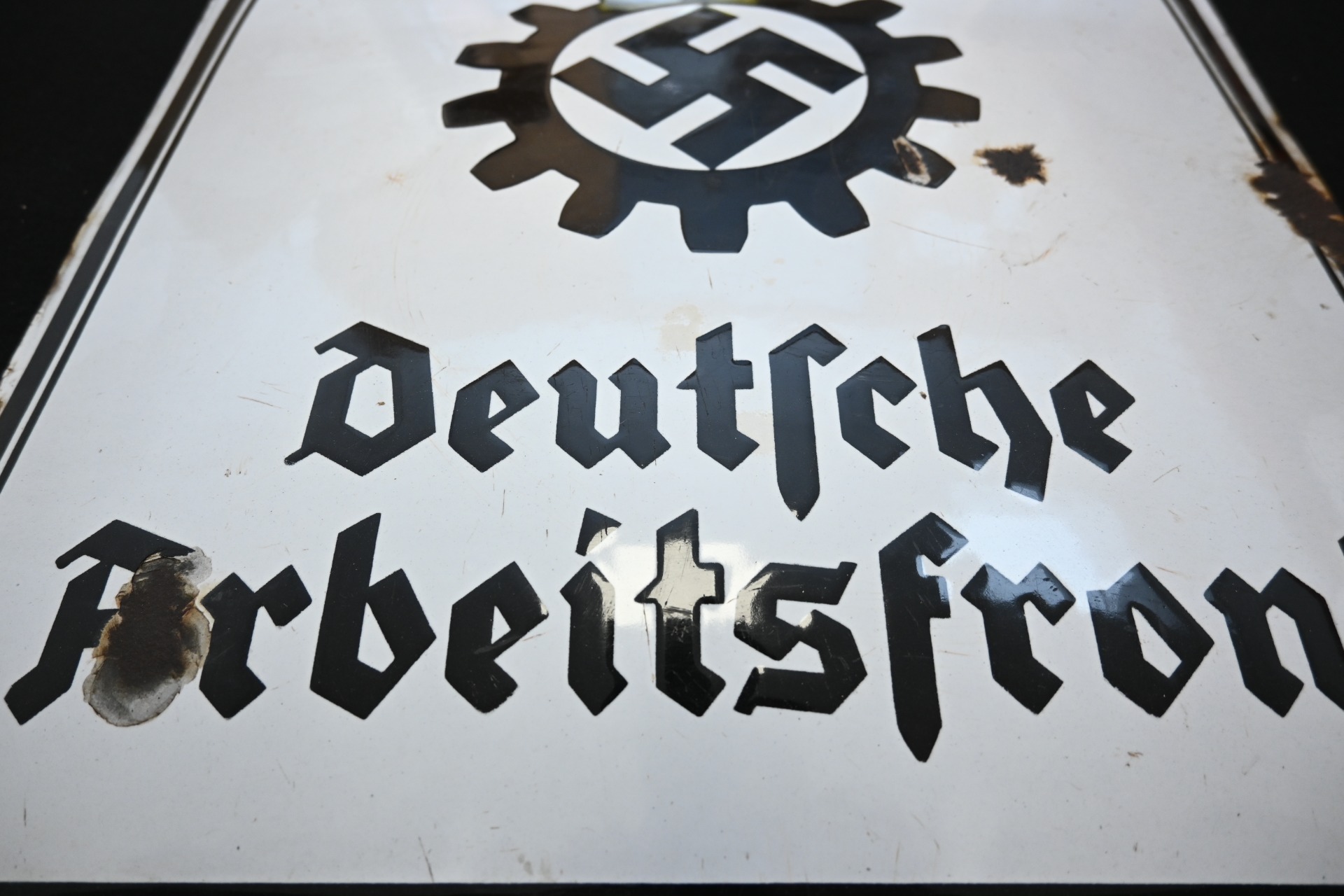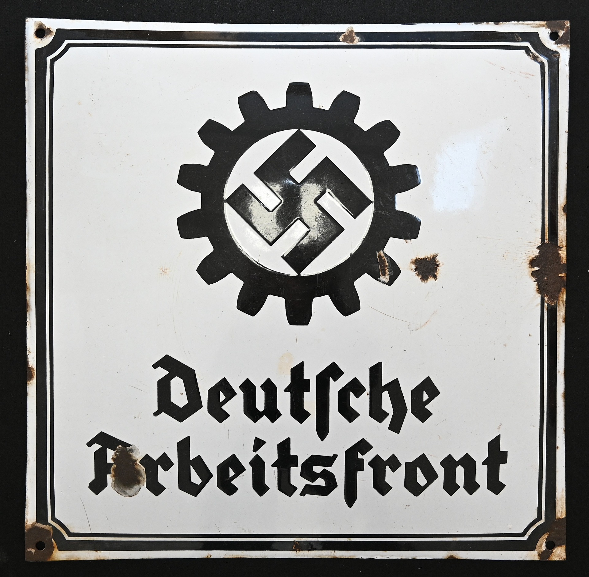 The sign shows overall normal signs of wear. The text 'Deutsche Arbeitsfront' and the Swastika are intact. Size of the sign is approx. 50cm*50cm.