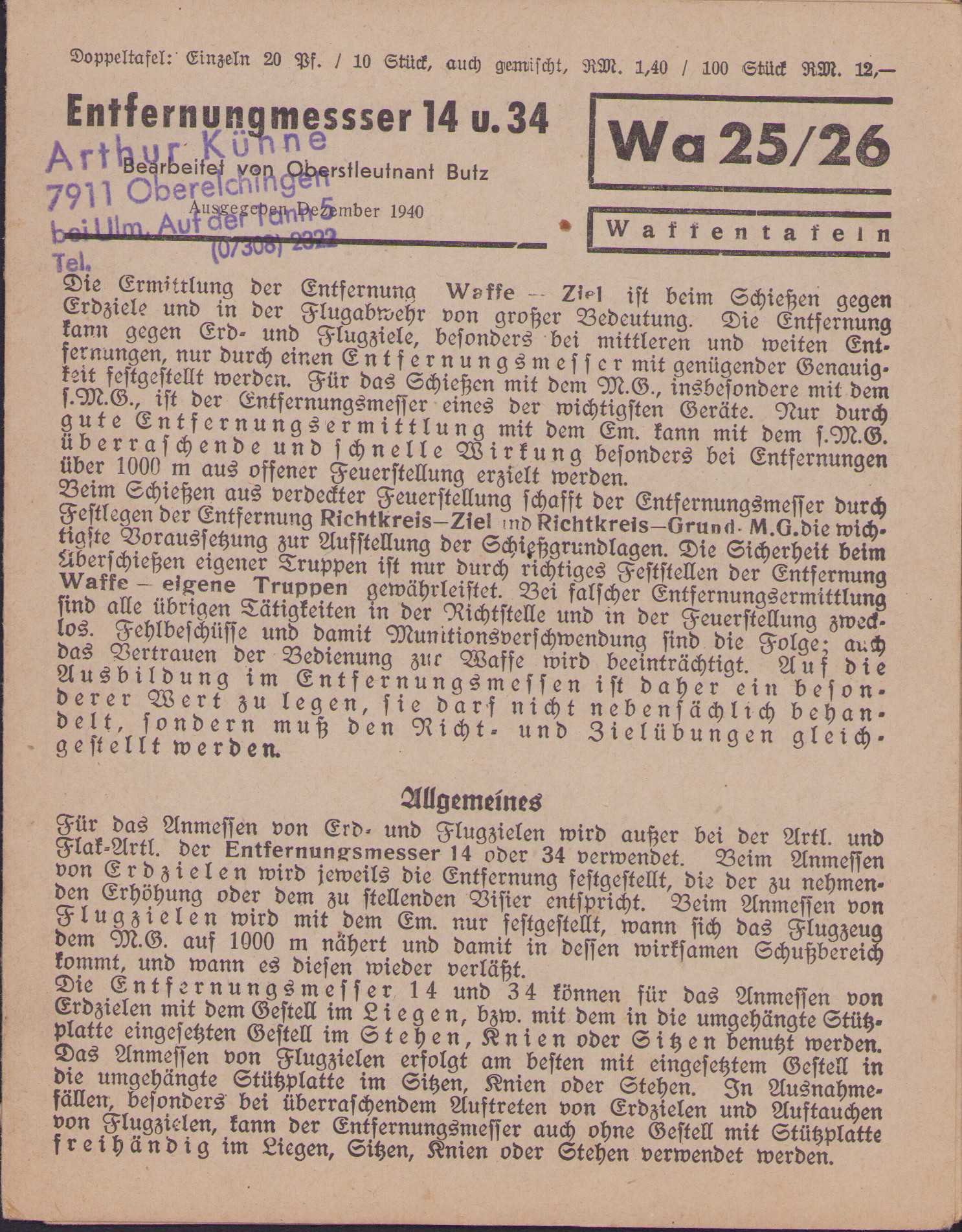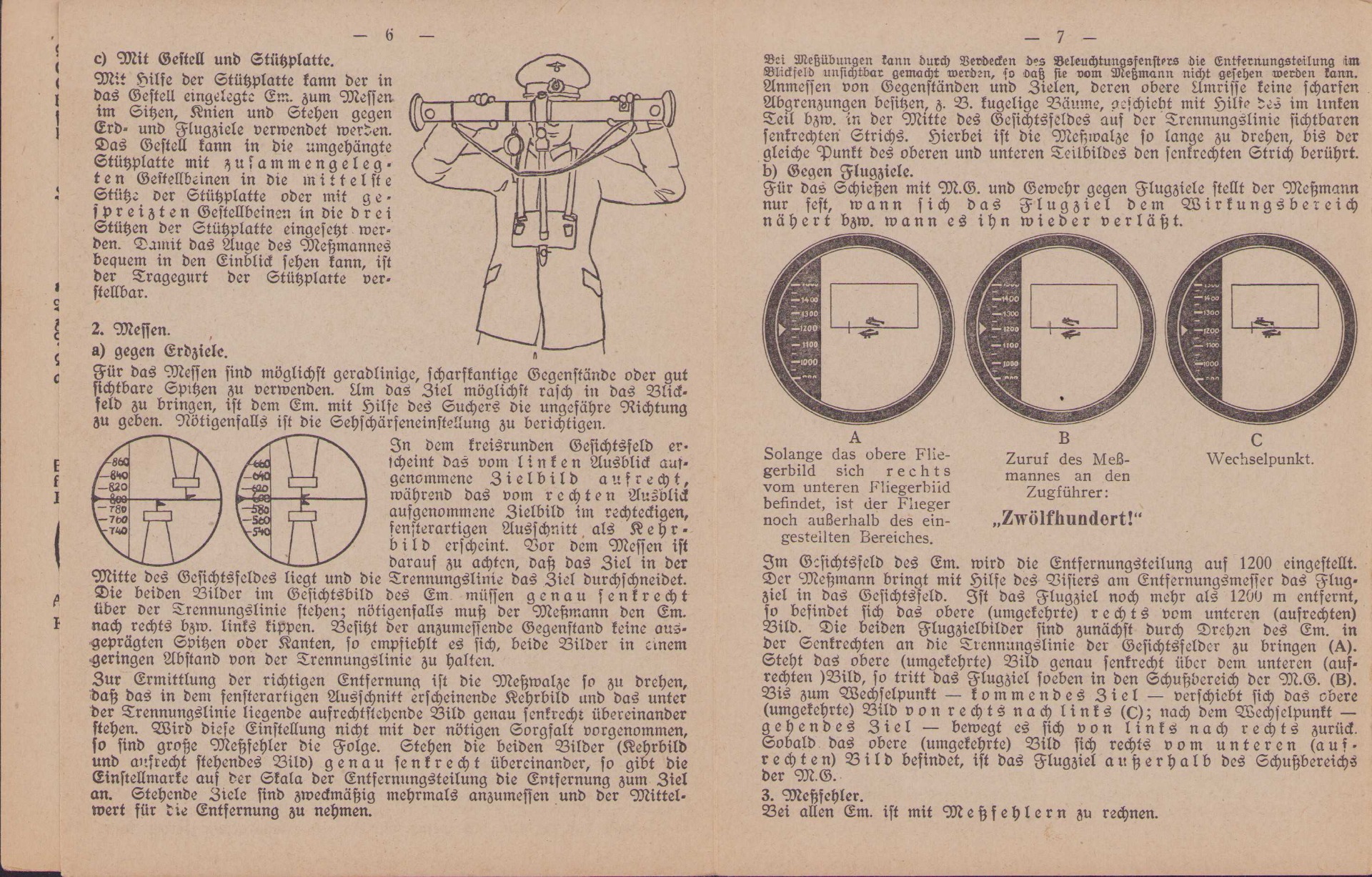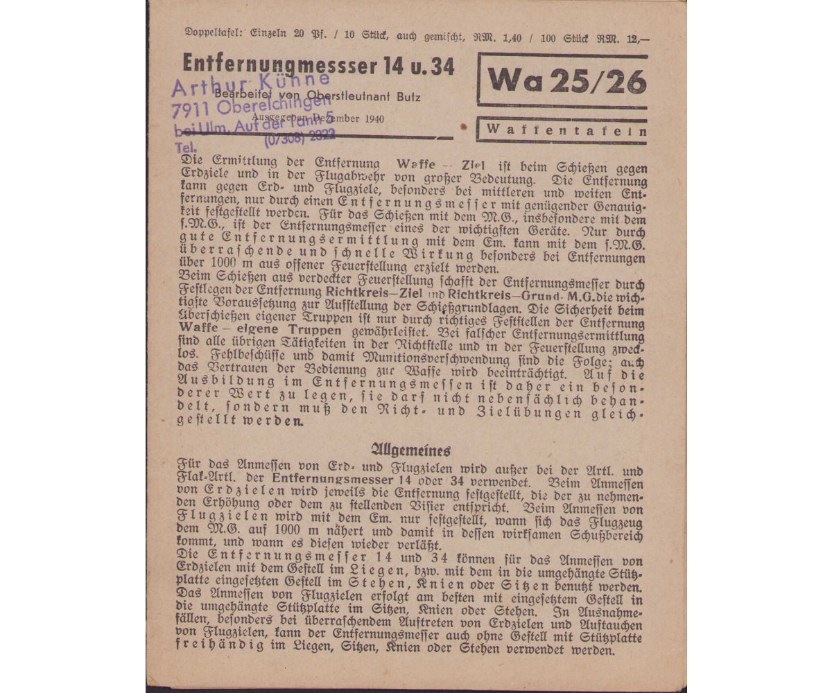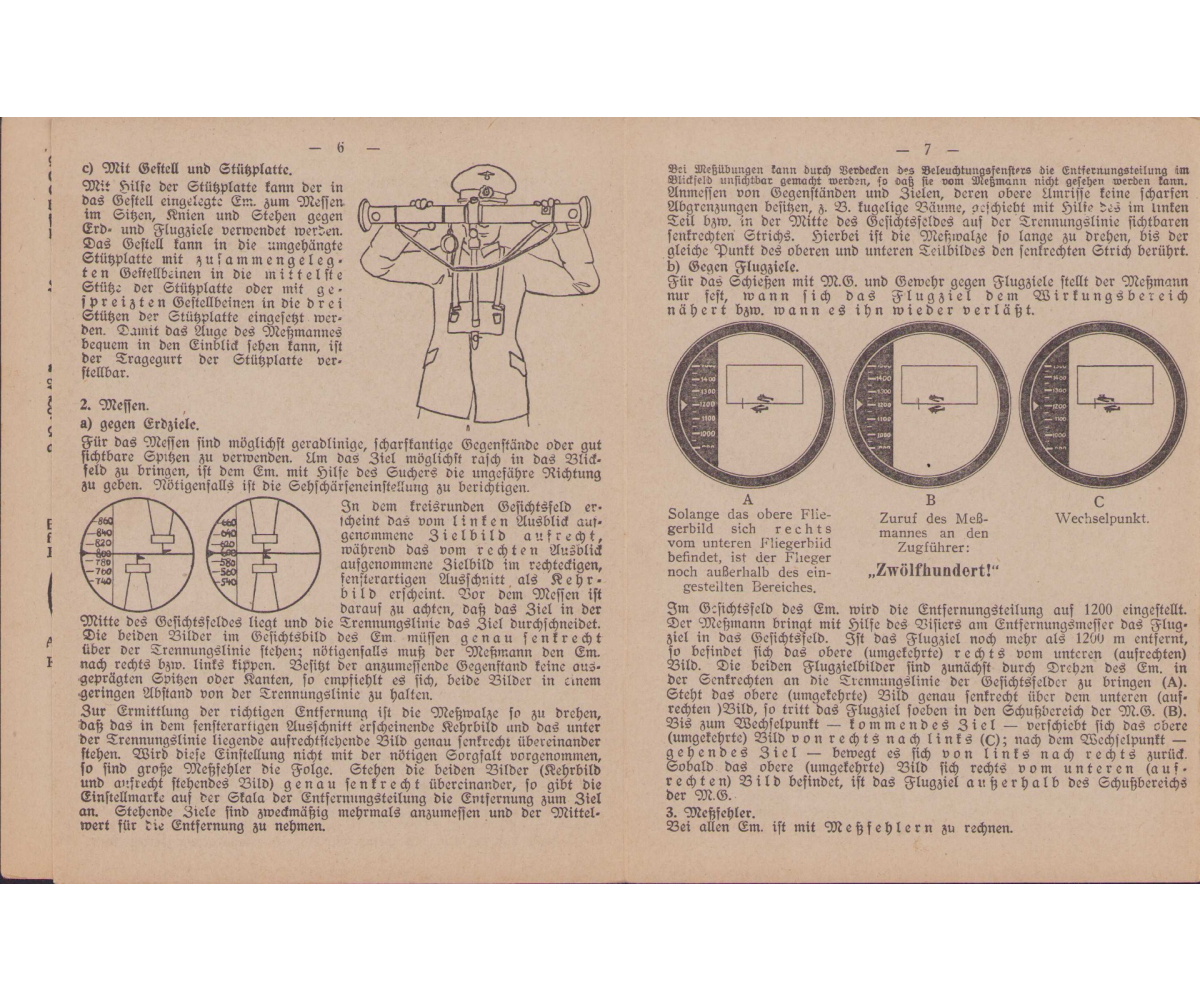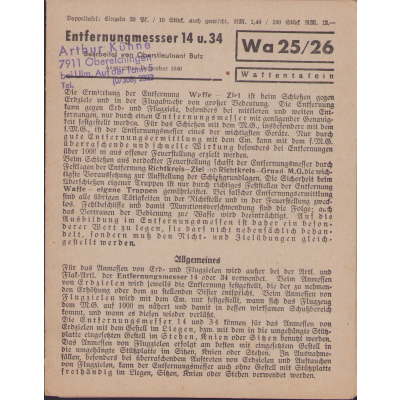 Very nice Entfernungsmesser instruction flyer or 'Waffentafeln' in excellent condition.