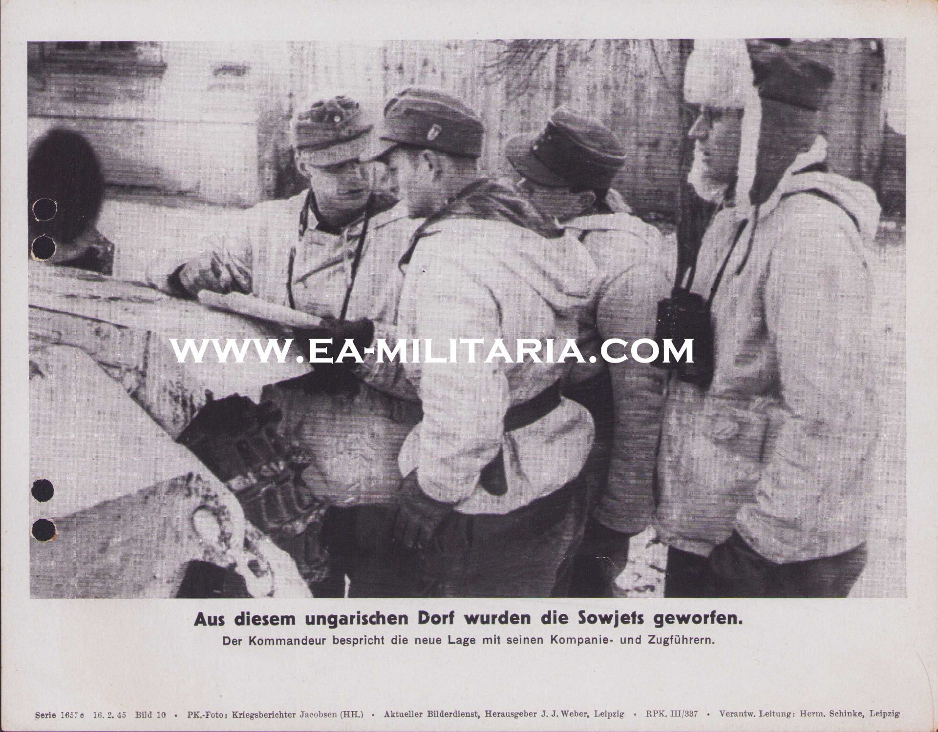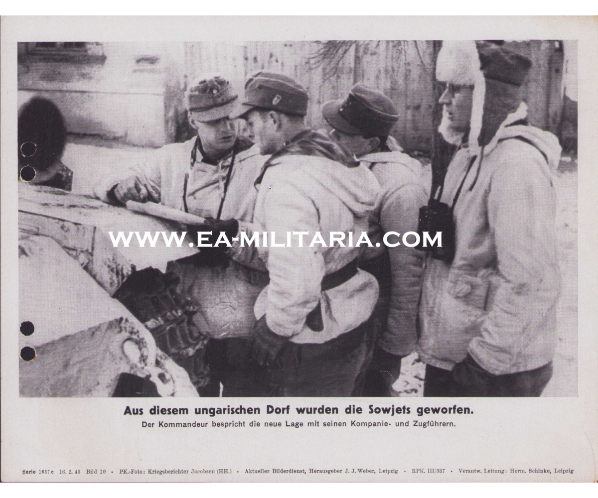 The photo shows overall normal signs of storage wear. Photo is taken somewhere on the Hungarian front. Gebirgsjäger soldiers are getting instructions from their commander. Note the cap badge on the Bergmütze which tells us the soldier(s) served in the 4.(Enzian) Gebirgs-Division.