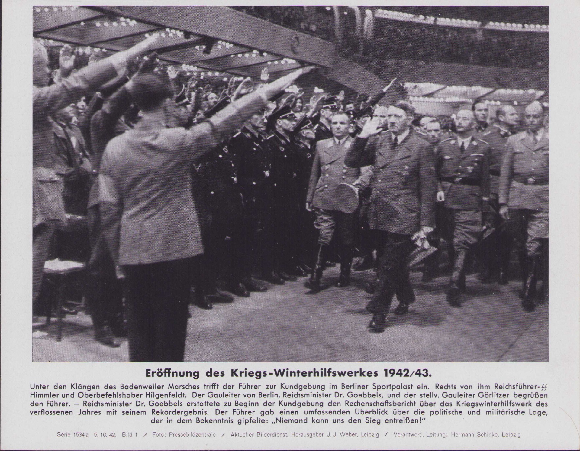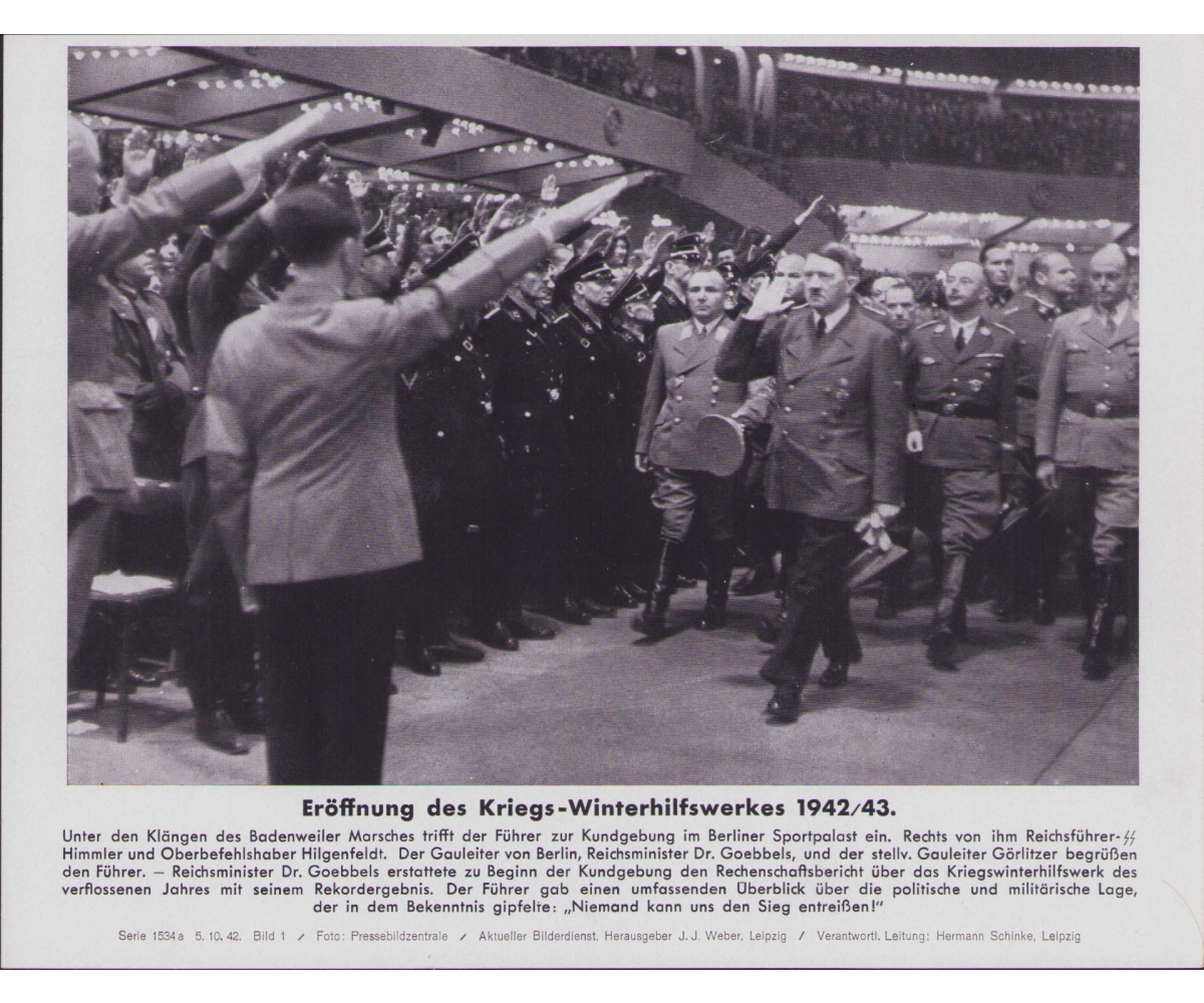 The photo shows overall normal signs of storage wear. This photo was taken during the Kries-Winterhilfswerkes of 1942/43 in the Berliner Sportpalast.