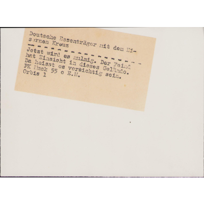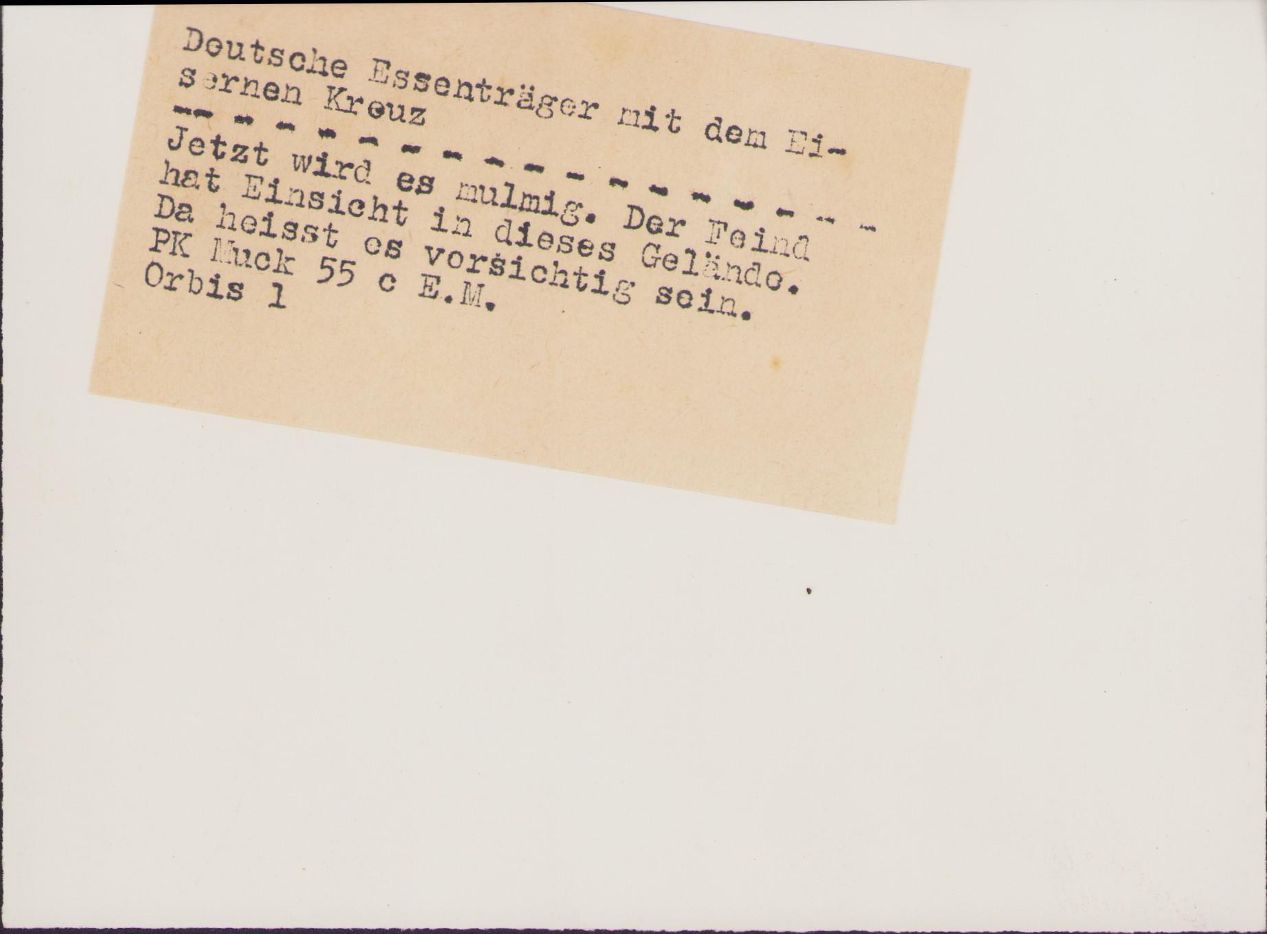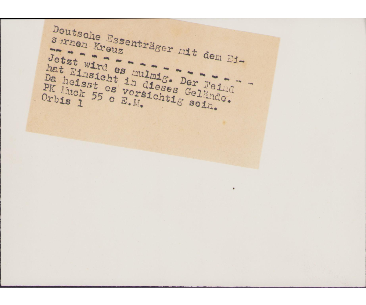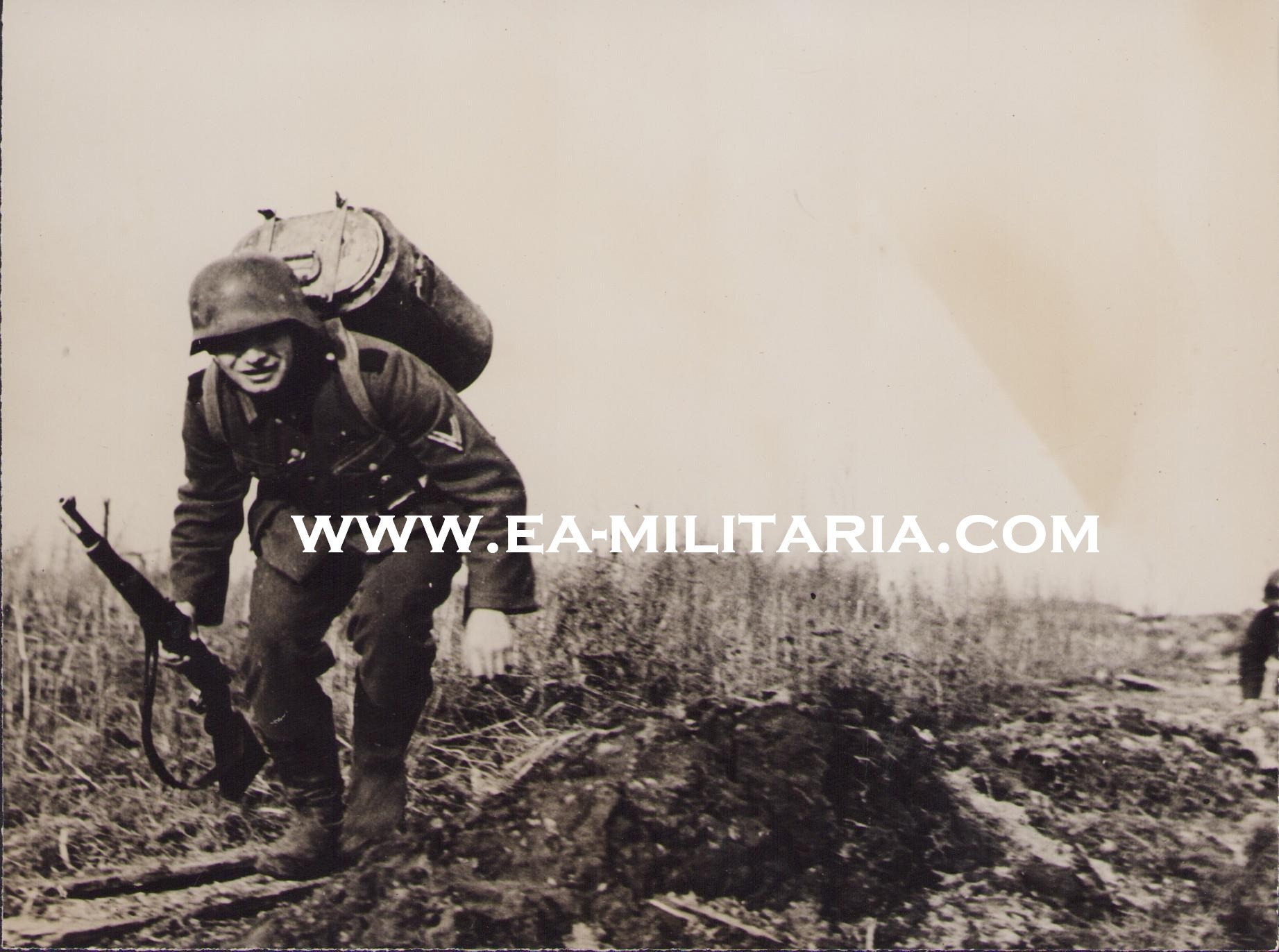 The photograph shows overall normal signs of storage wear. It's complete with paper caption on the back. Here a German soldier with a Essenträger on his back is carefully moving forward.
