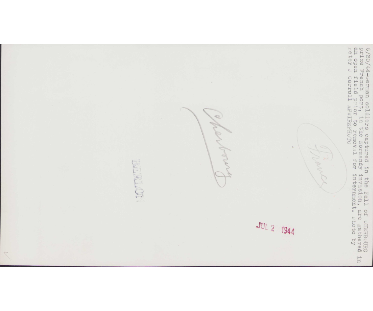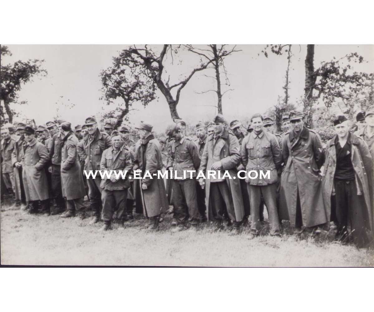 The photograph shows overall normal signs of storage wear. The typed description on the back says 'German soldiers captured in the fall of Cherbourg'. The large row of Germans are waiting to get an order. Note the Panzer soldier on the far left and far right.