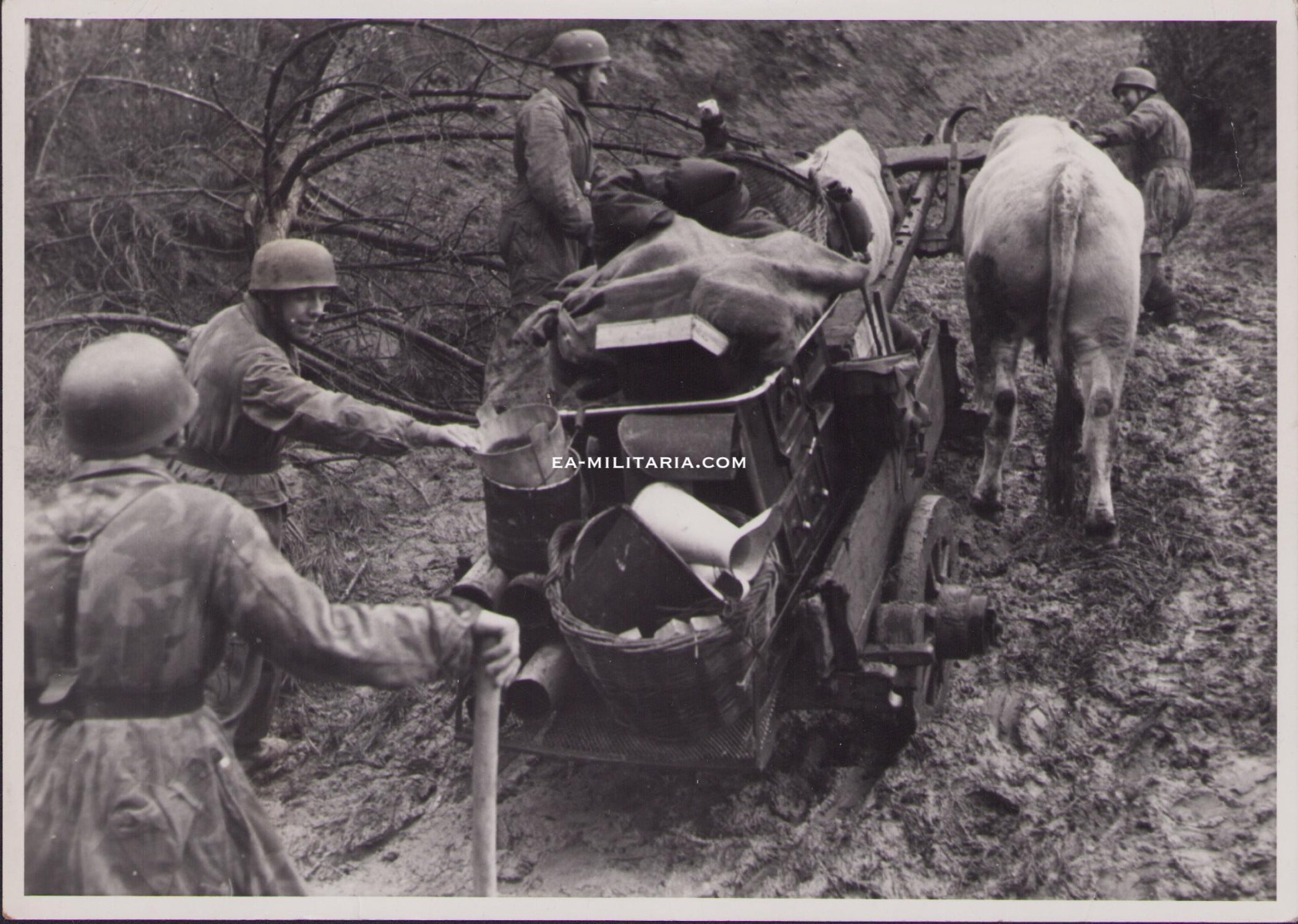 The photograph shows overall normal signs of storage wear. Complete with caption on the back that reads, 'Kuchenherd auf Wanderschaft' or Kitchen on the move. The 4 soldier bringing the kitchen to the front troops. Note that they all wear their jumpsmocks and paratrooper helmet. The decal on the soldier's helmet far right can be see. The photograph was taken on the 16.12.1944 in the area of Bologna, Italy. The paratroopers are member of Fallschirmjager Regiment 11. This regiment was formed in October 1943 from the II.Bataillon Fallschirmjager Regiment 6.