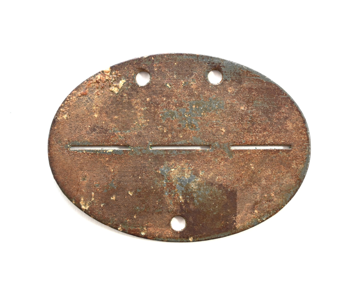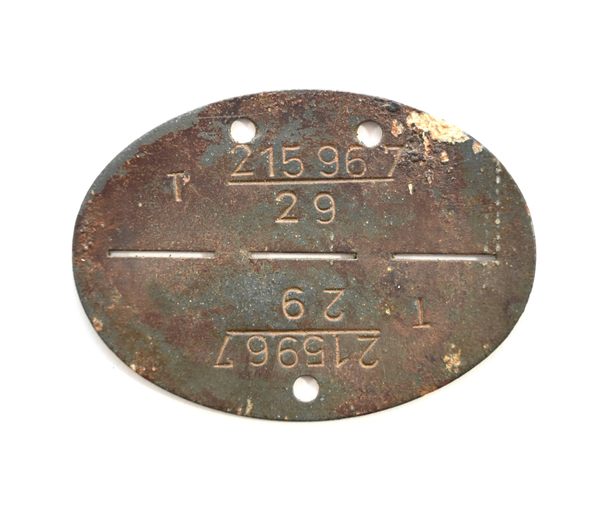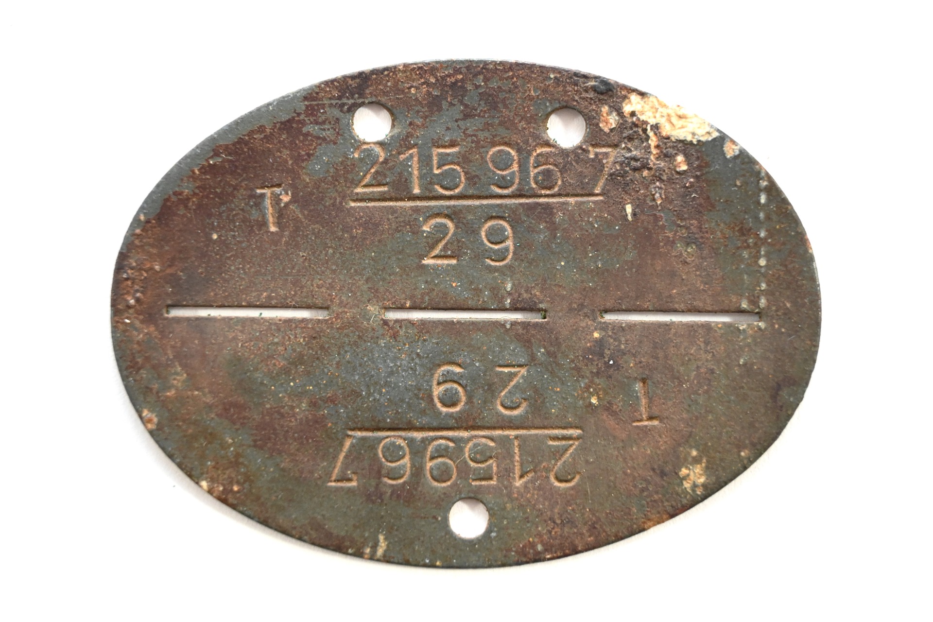 The tag or 'Erkennungsmarke' shows overall normal signs of wear. It belonged to a soldier who served or was drafted in the Fallschirmschule II Wittstock. The nummer '215967' refers to different kompanies within the Fallschirmschule such as the Stab/Fallschirmschule II, 2,3,4,5.Kompanie, but also the Luftwaffen Sanitäts-Gruppe b.I./Fallschirmjäger Ausbildungs Regiment 2. The 'T' on both parts of the tag means that the soldier got a Tetanus shot.