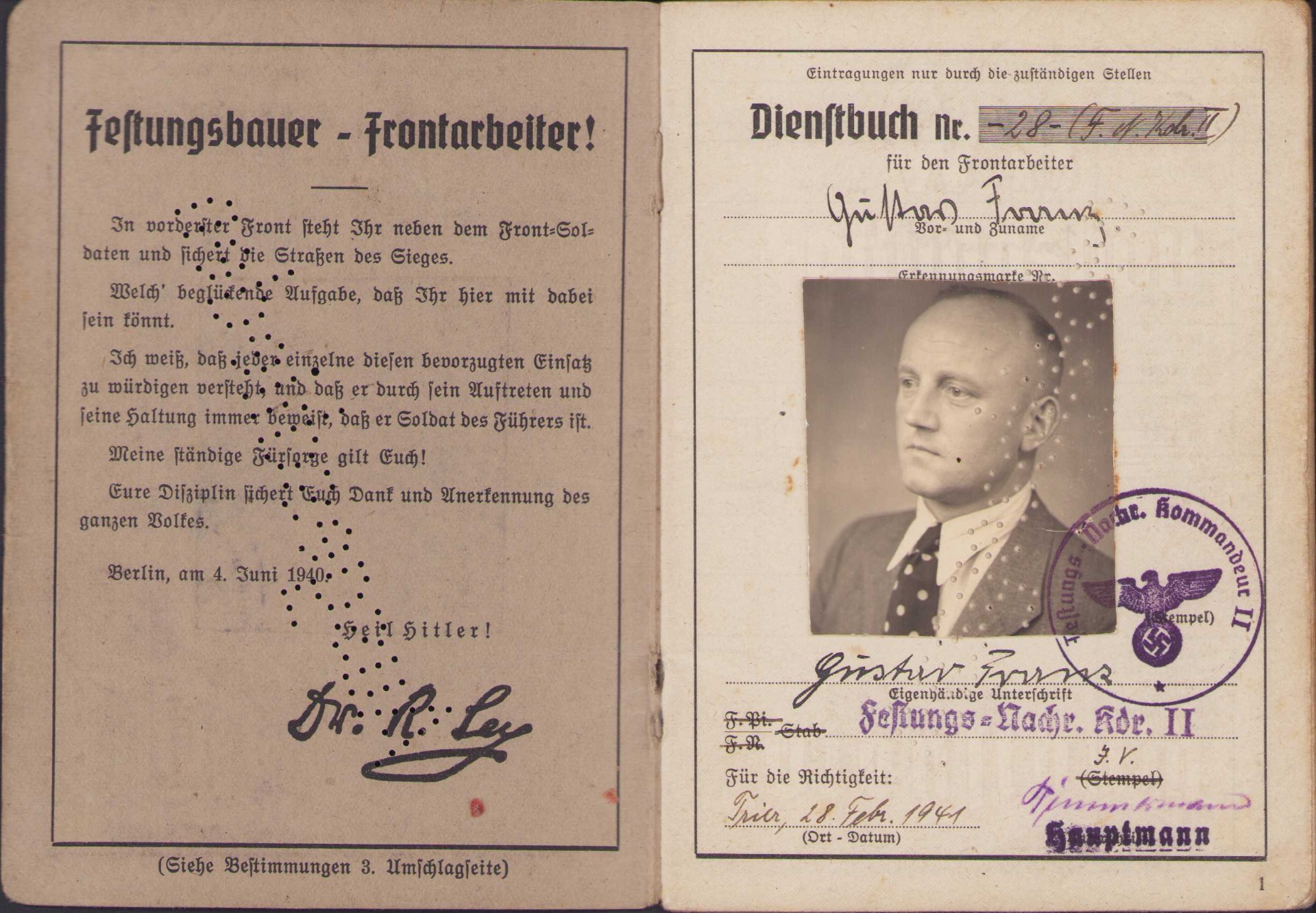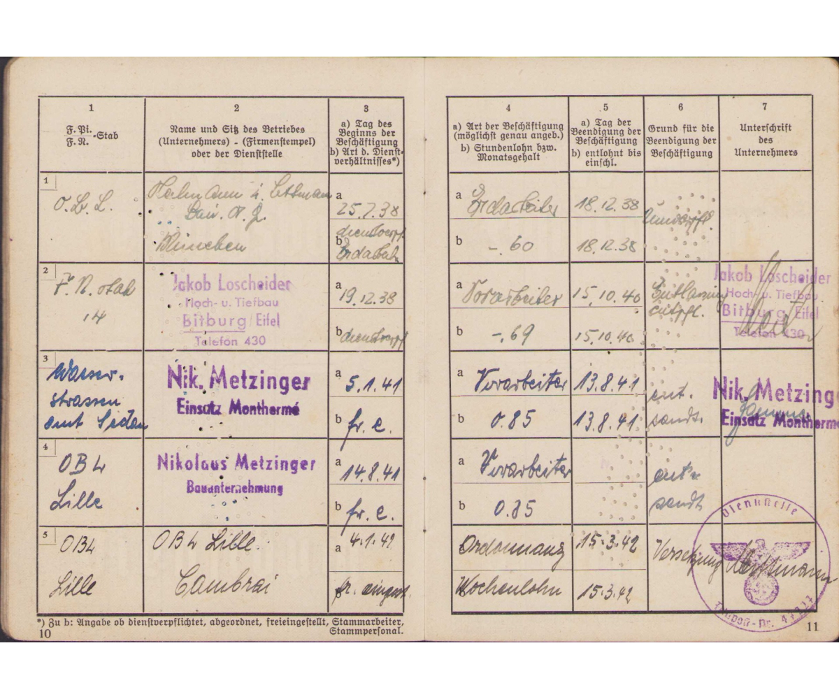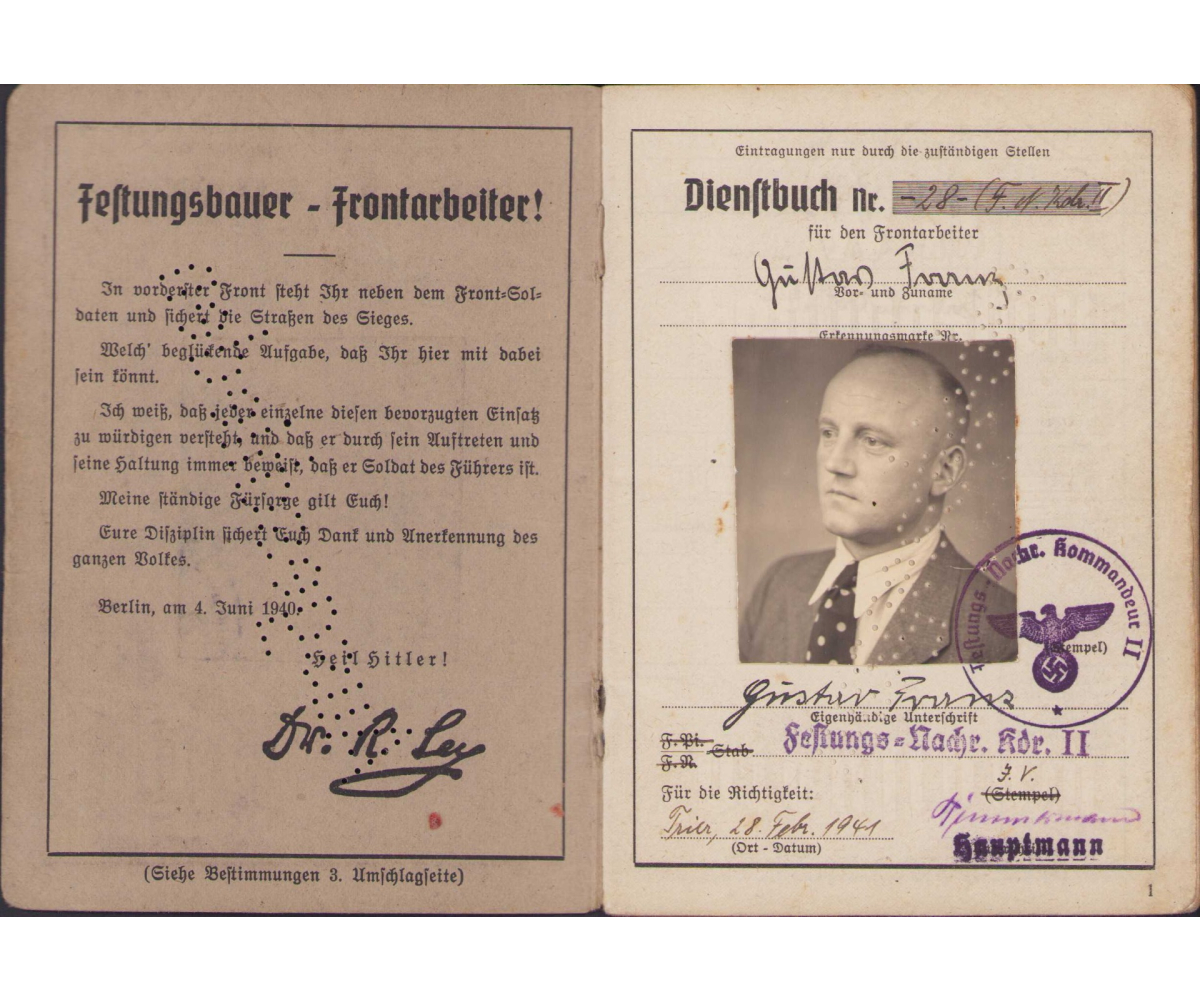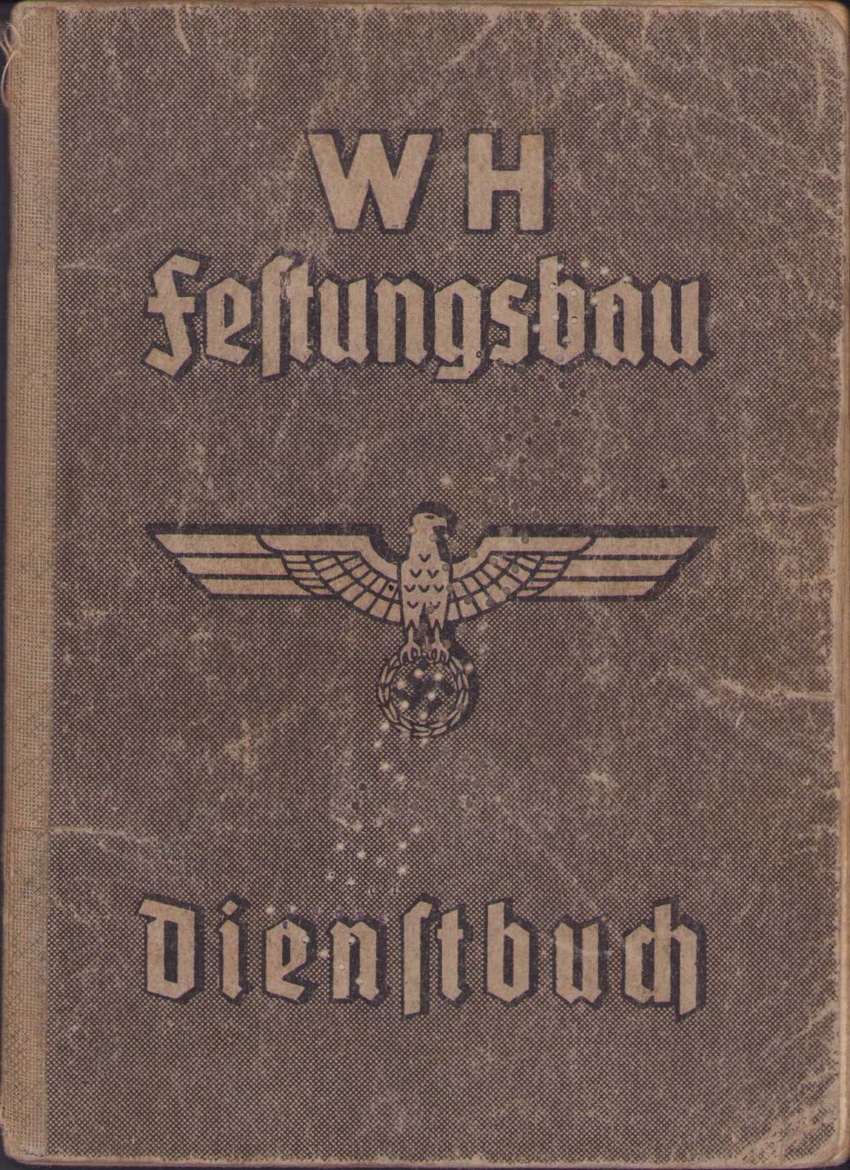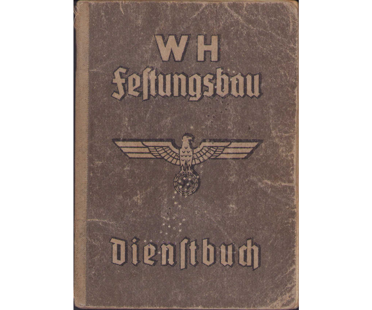 The booklet shows overall normal signs of wear. Allthough the cover on the lower part is not attached any more to the staple, it's still in solid and complete condition. The Dienstbuch belonged to Franz Gústav who worked for different construction companies commissioned by the Organisation Todt. He not only worked for a company in the Eifel area, but also for companies that operated in France, Monthermé and Cambrai/Lille.