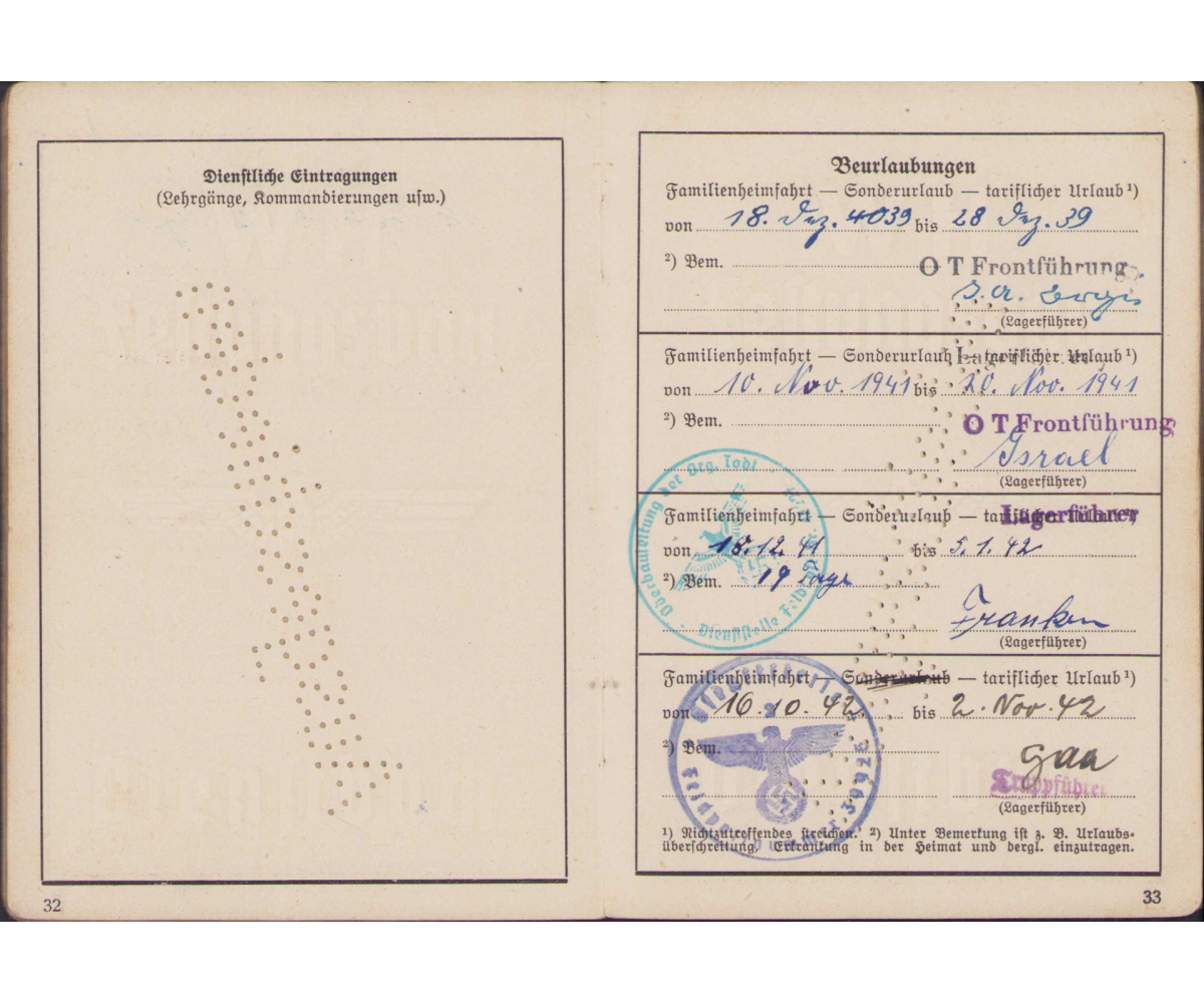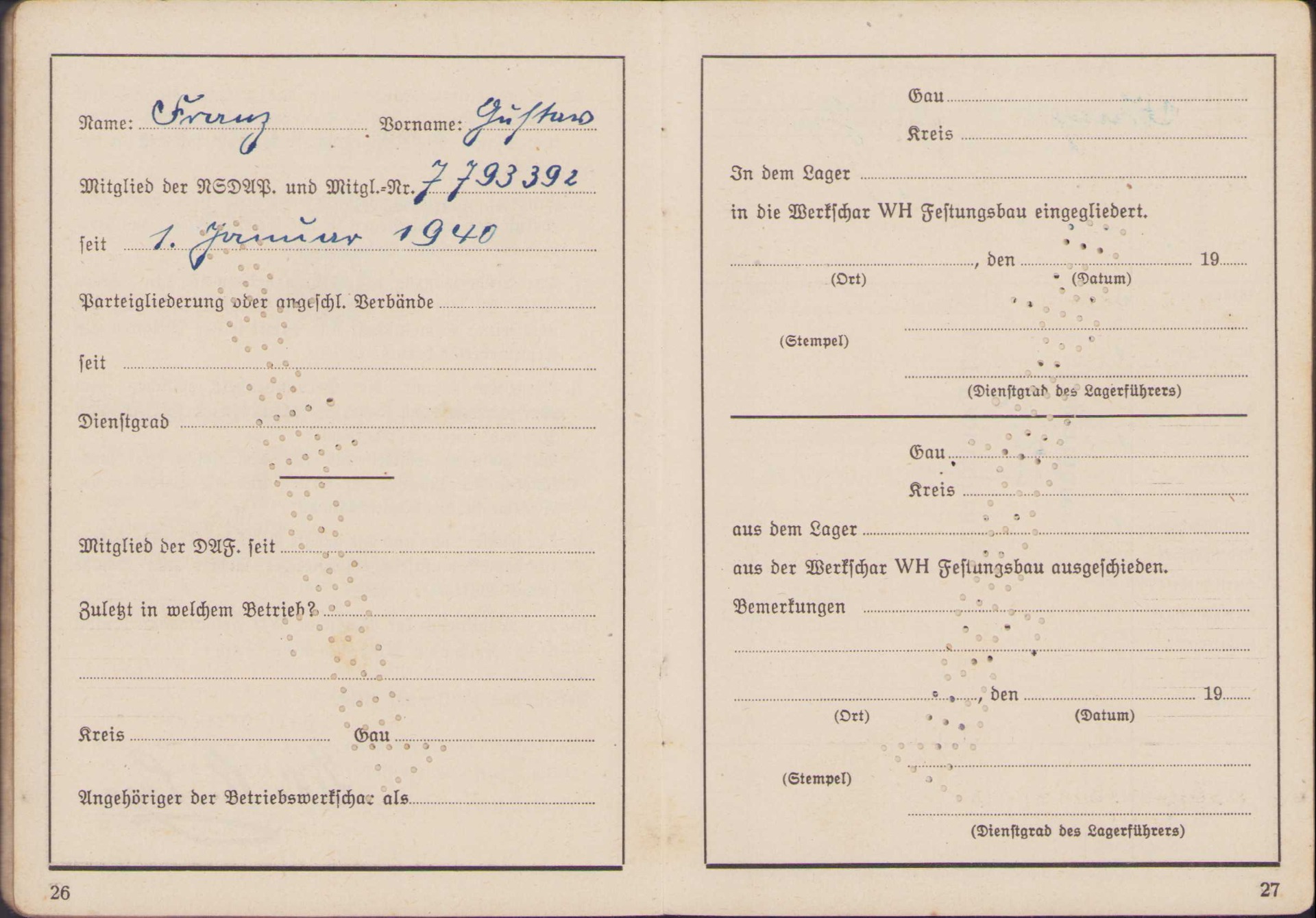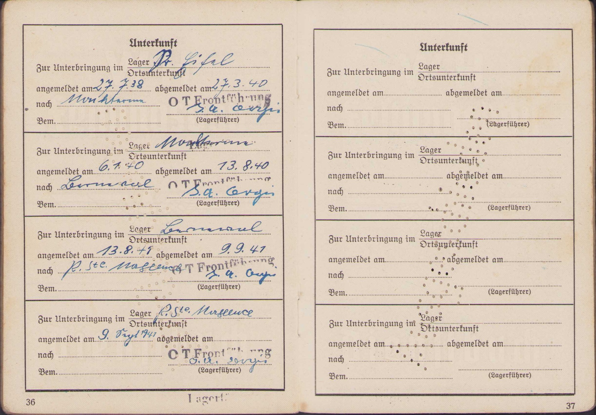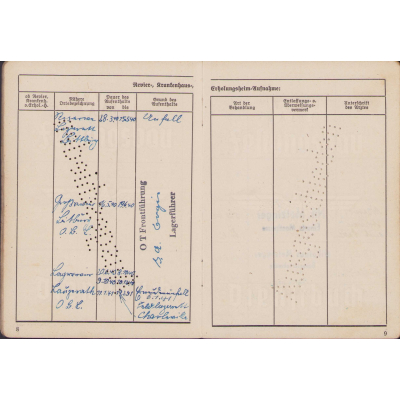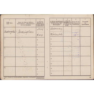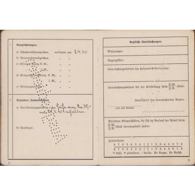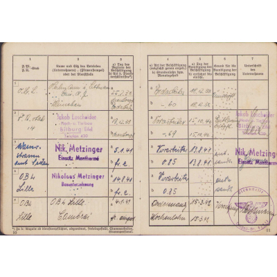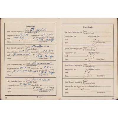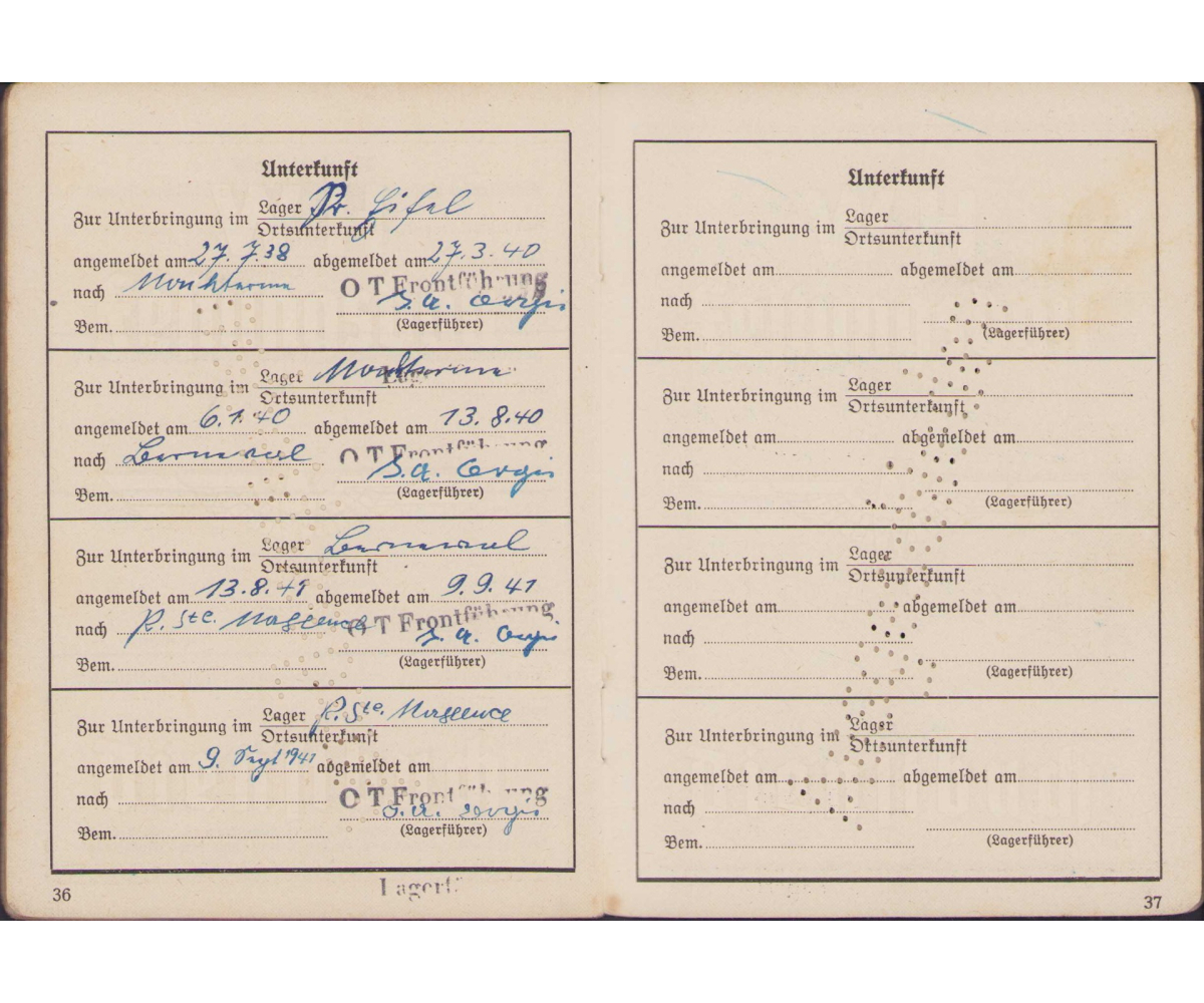 The booklet shows overall normal signs of wear. Allthough the cover on the lower part is not attached any more to the staple, it's still in solid and complete condition. The Dienstbuch belonged to Franz Gústav who worked for different construction companies commissioned by the Organisation Todt. He not only worked for a company in the Eifel area, but also for companies that operated in France, Monthermé and Cambrai/Lille.