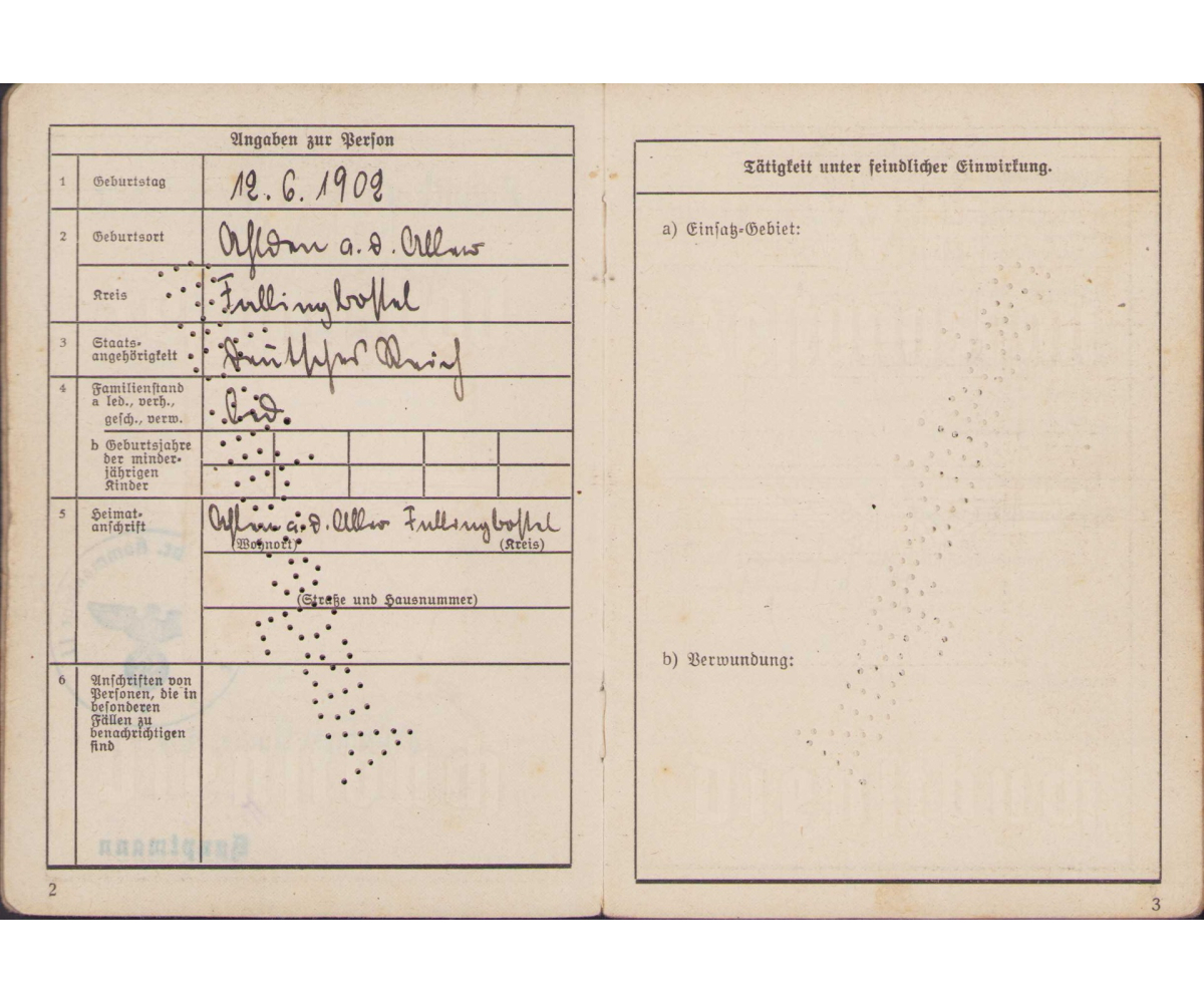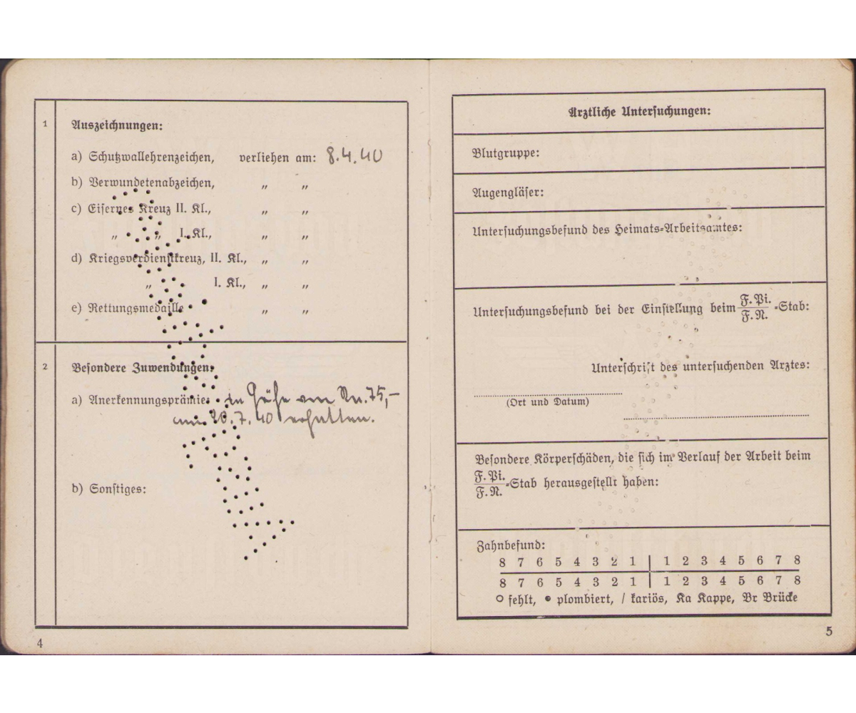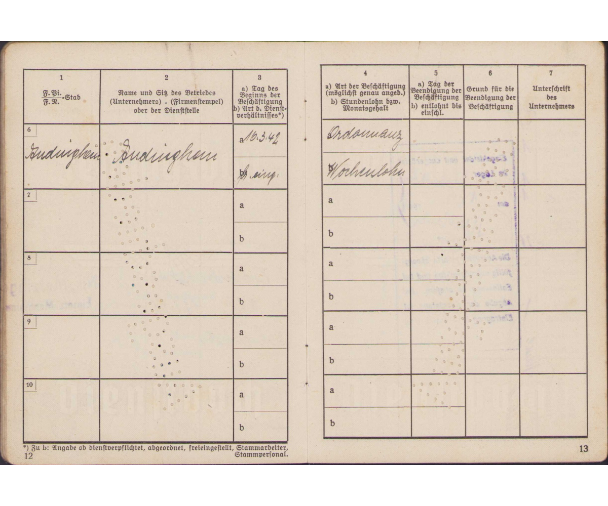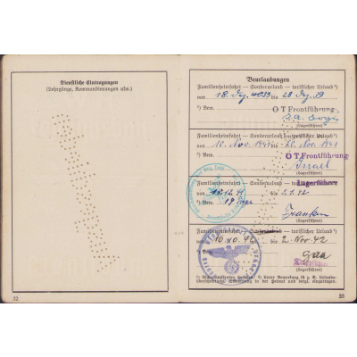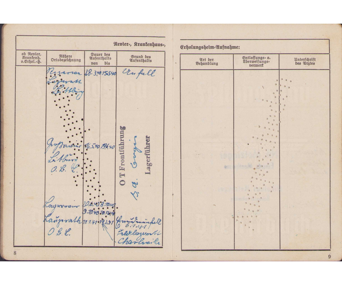 The booklet shows overall normal signs of wear. Allthough the cover on the lower part is not attached any more to the staple, it's still in solid and complete condition. The Dienstbuch belonged to Franz Gústav who worked for different construction companies commissioned by the Organisation Todt. He not only worked for a company in the Eifel area, but also for companies that operated in France, Monthermé and Cambrai/Lille.