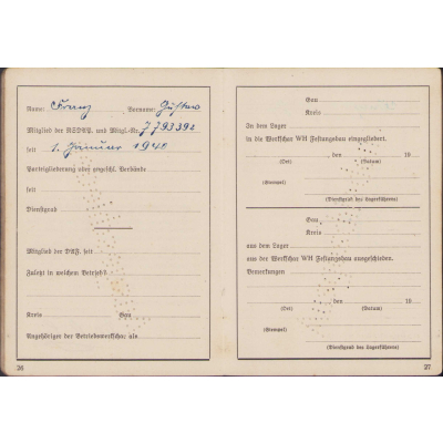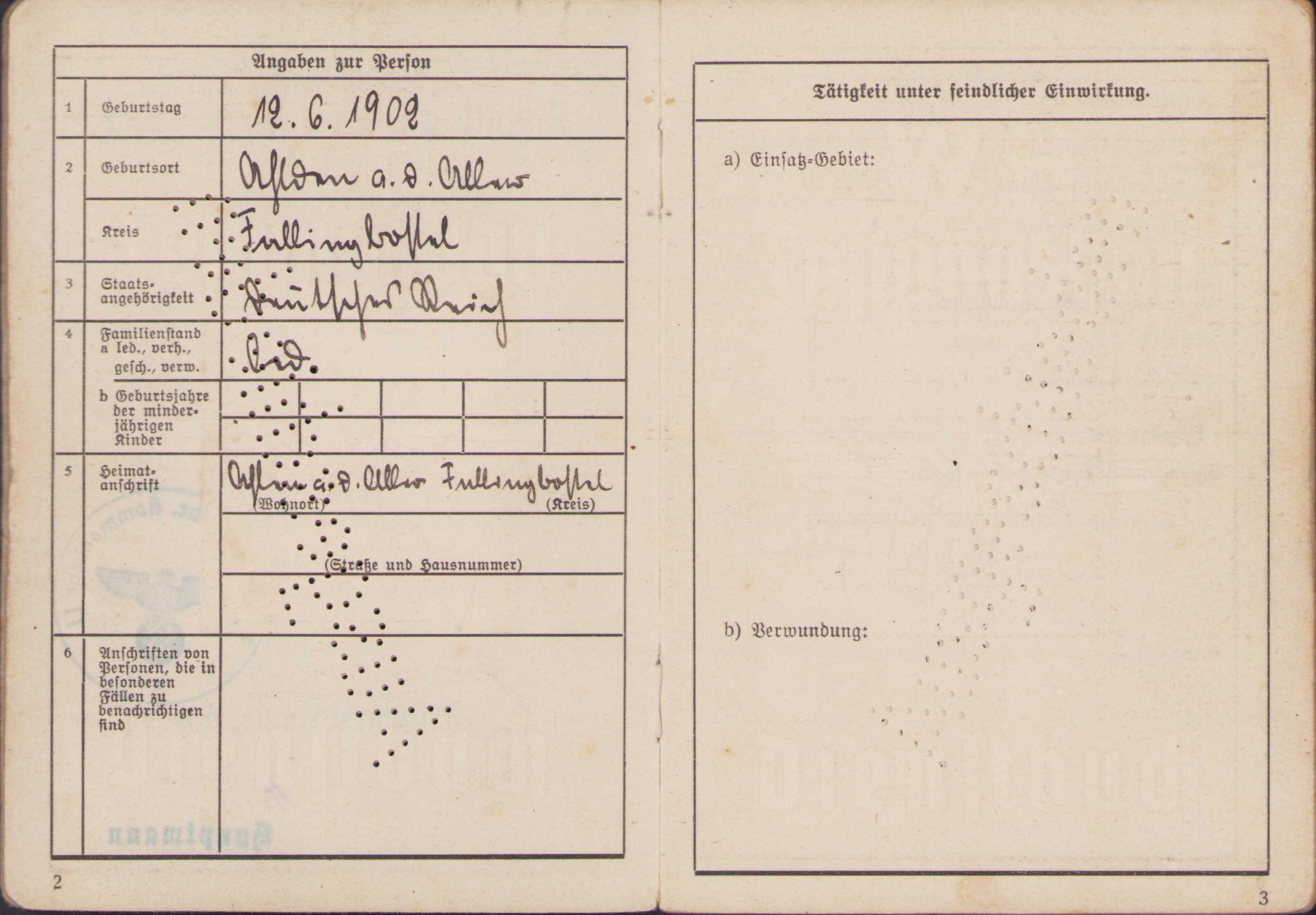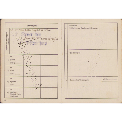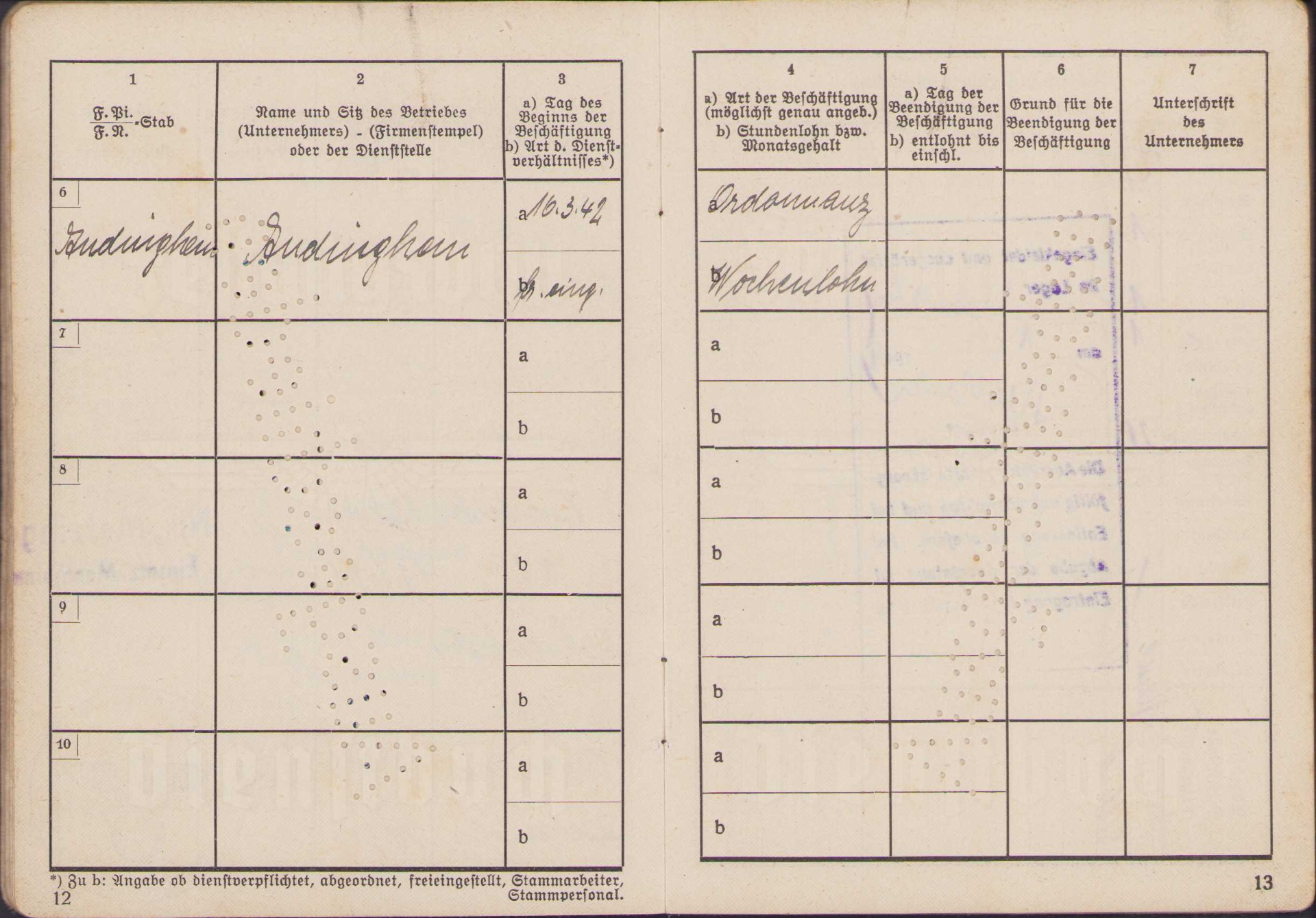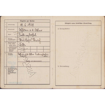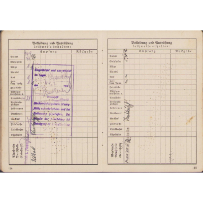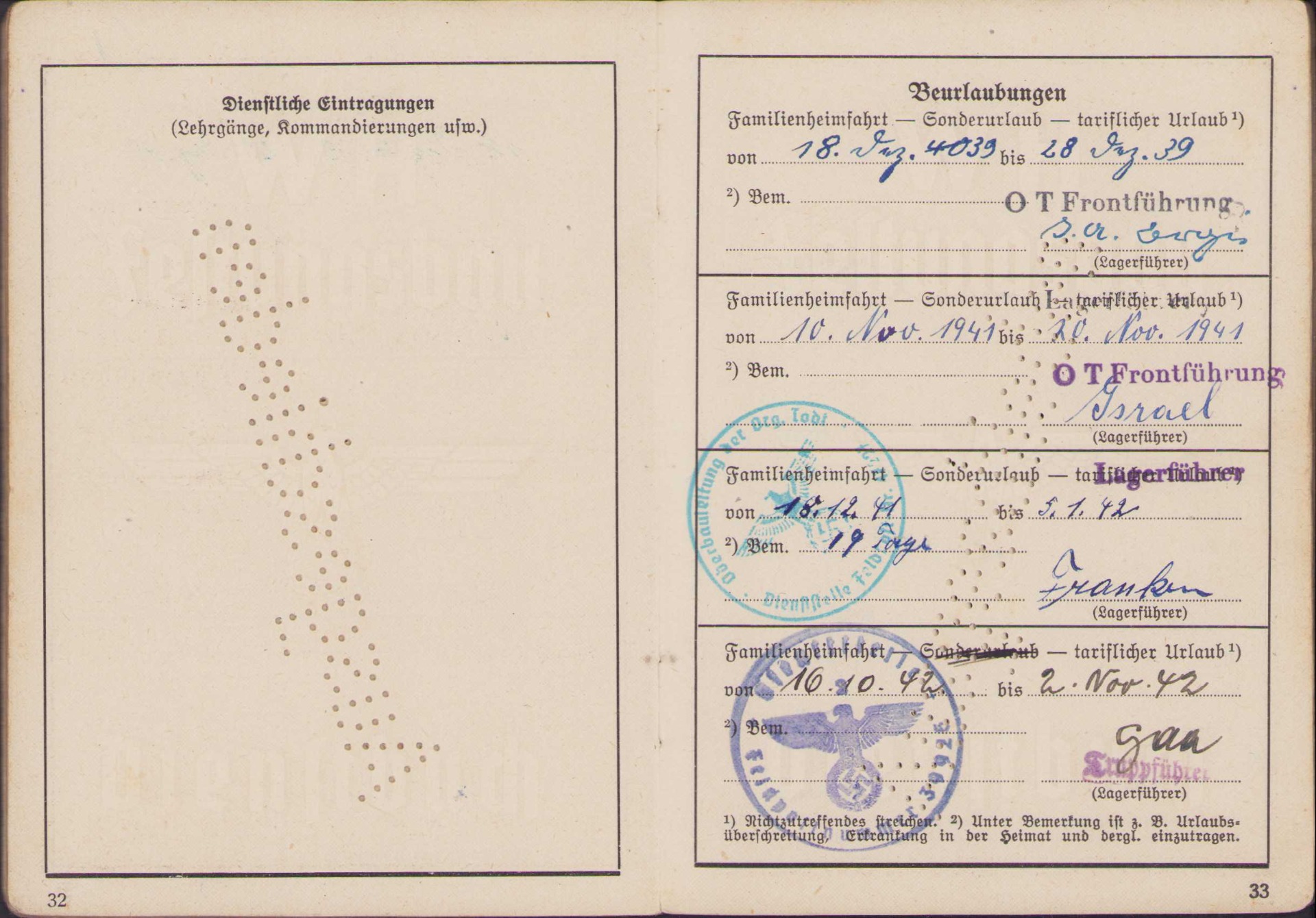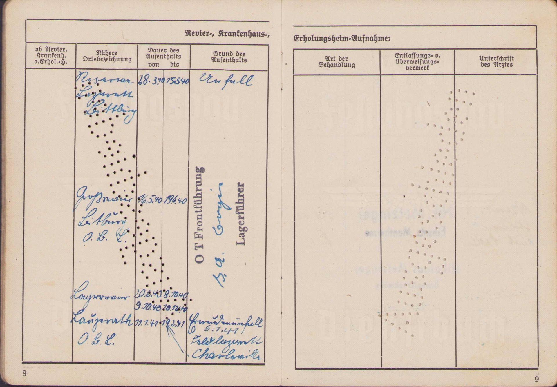 The booklet shows overall normal signs of wear. Allthough the cover on the lower part is not attached any more to the staple, it's still in solid and complete condition. The Dienstbuch belonged to Franz Gústav who worked for different construction companies commissioned by the Organisation Todt. He not only worked for a company in the Eifel area, but also for companies that operated in France, Monthermé and Cambrai/Lille.