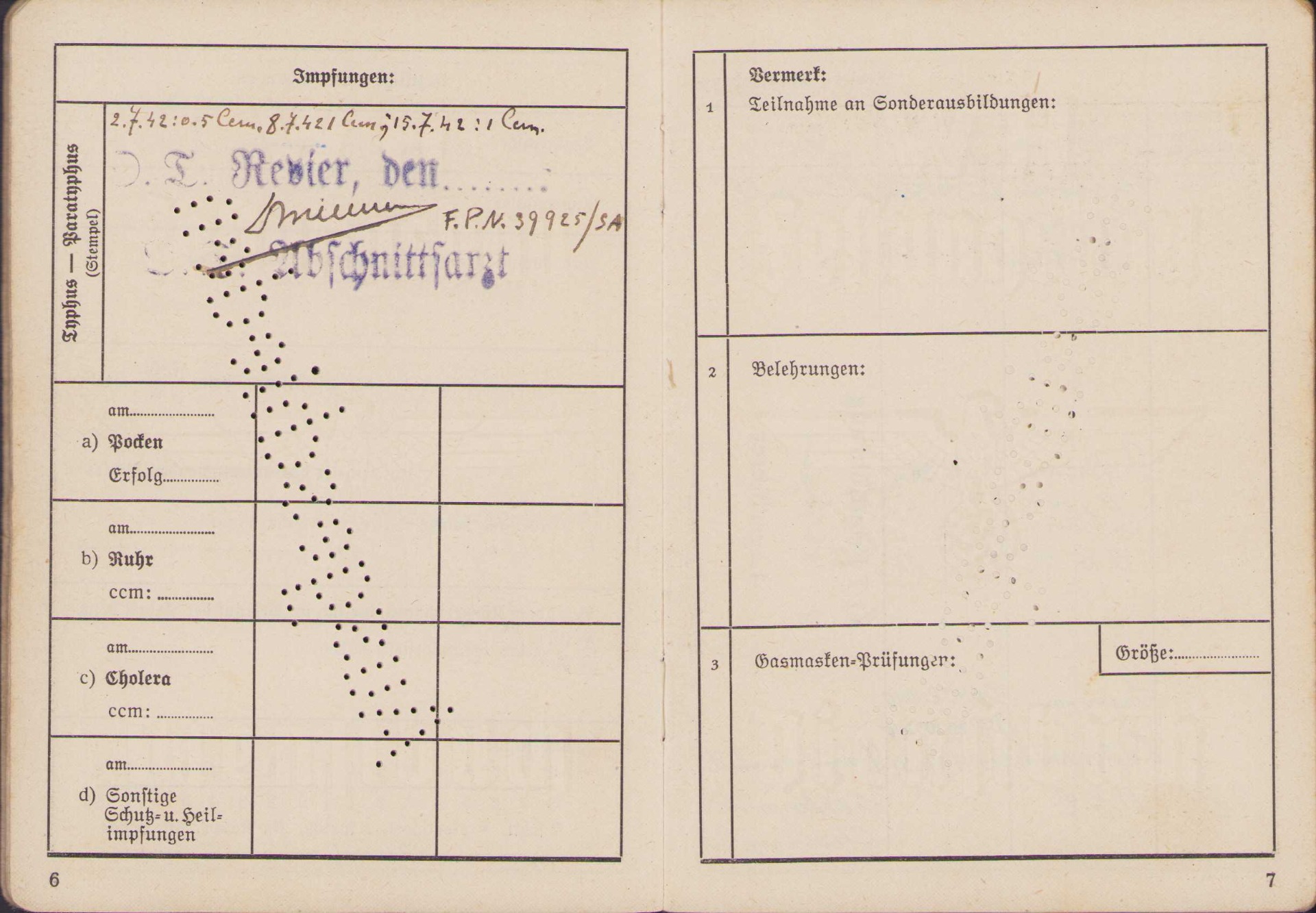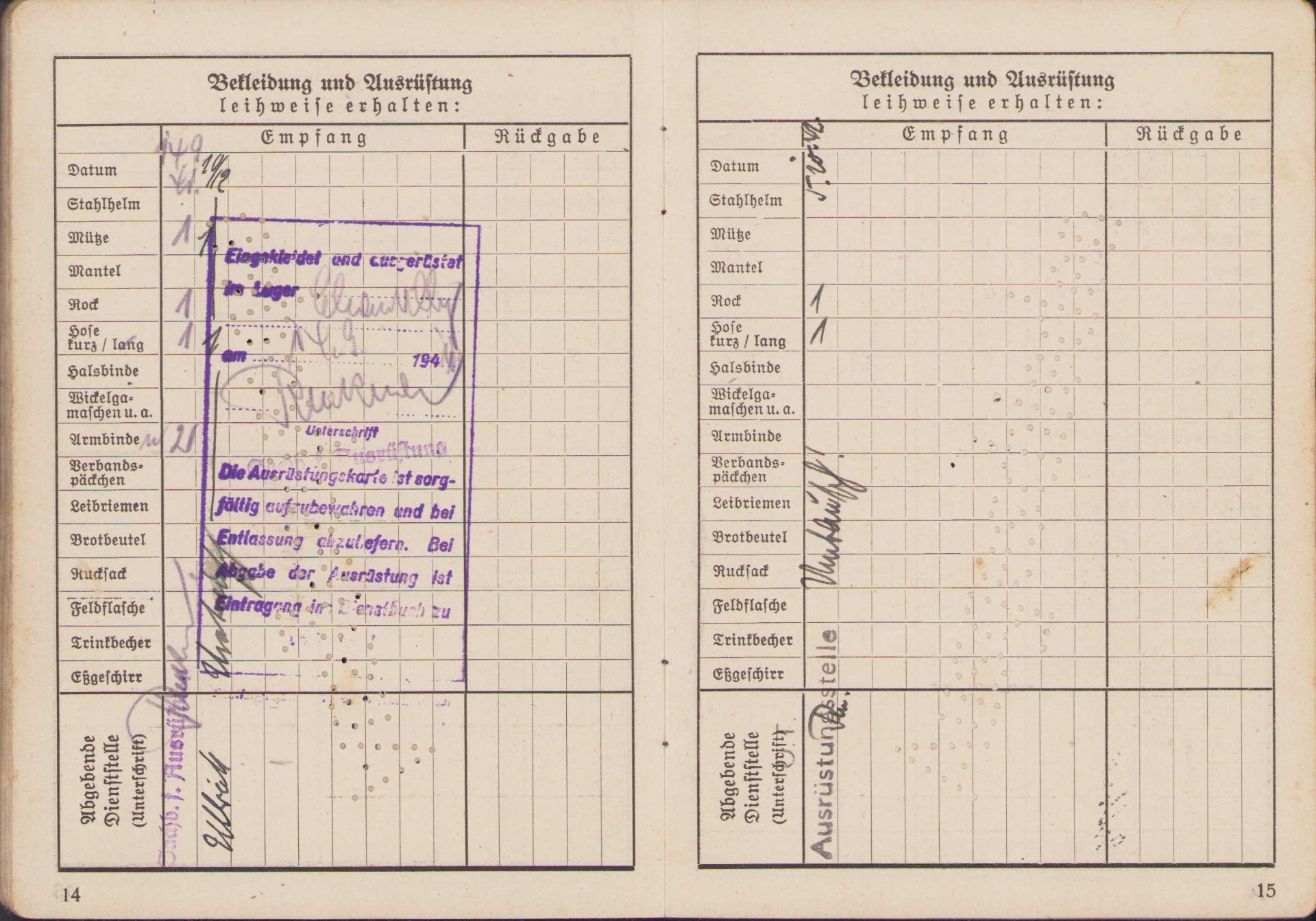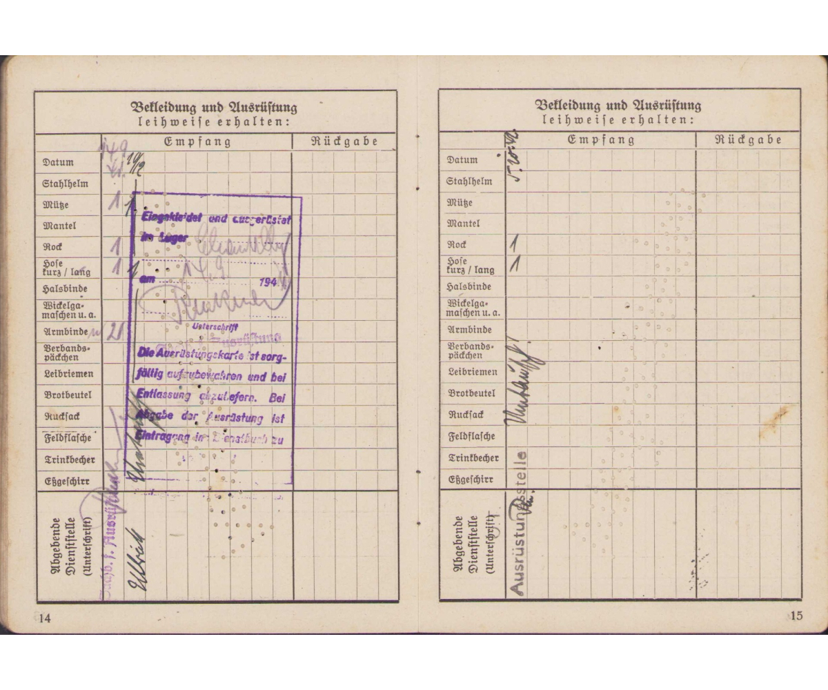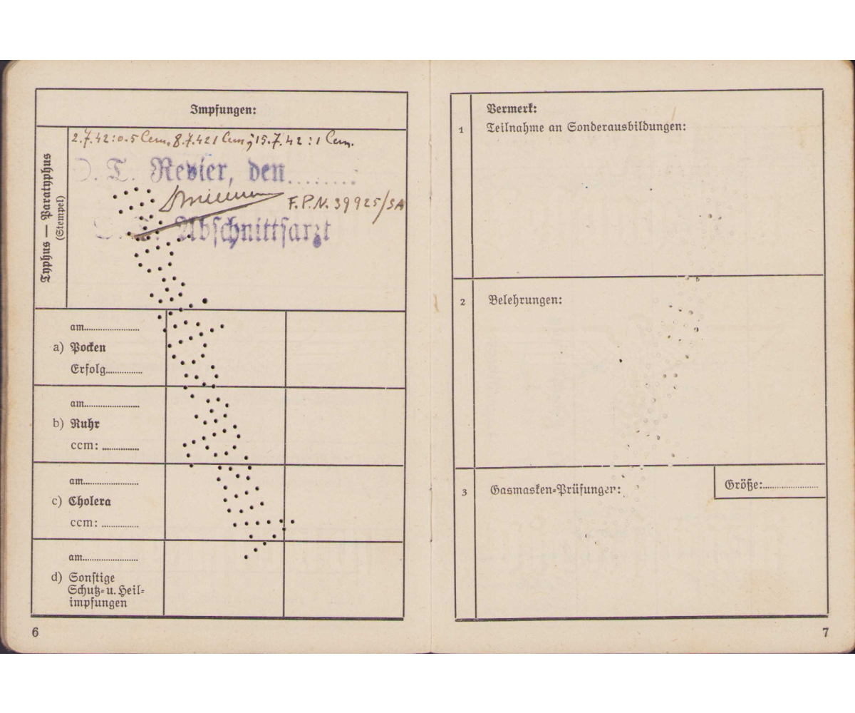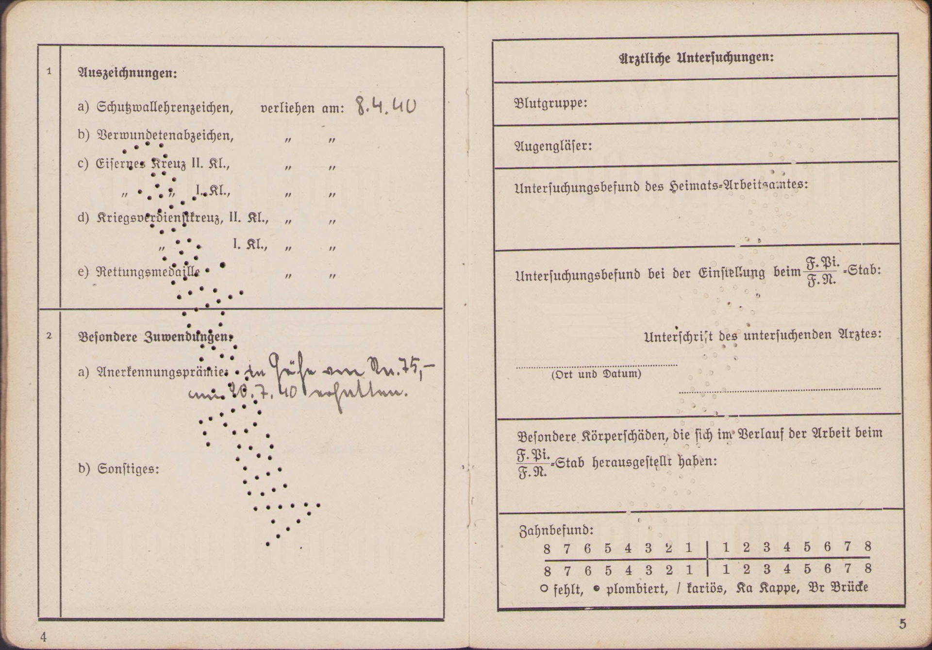 The booklet shows overall normal signs of wear. Allthough the cover on the lower part is not attached any more to the staple, it's still in solid and complete condition. The Dienstbuch belonged to Franz Gústav who worked for different construction companies commissioned by the Organisation Todt. He not only worked for a company in the Eifel area, but also for companies that operated in France, Monthermé and Cambrai/Lille.