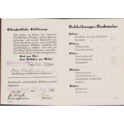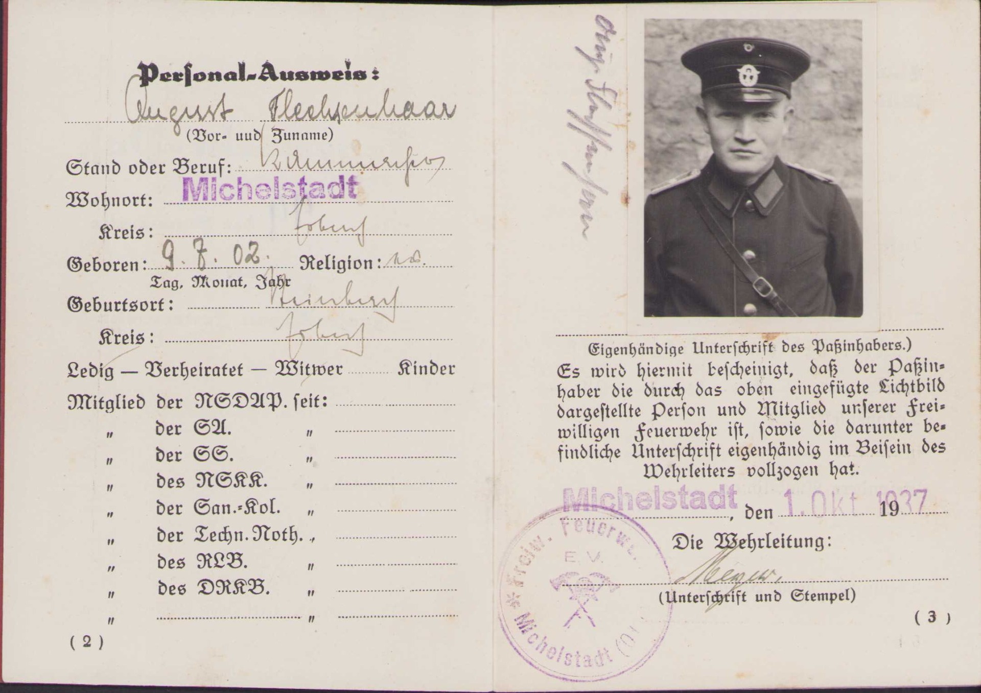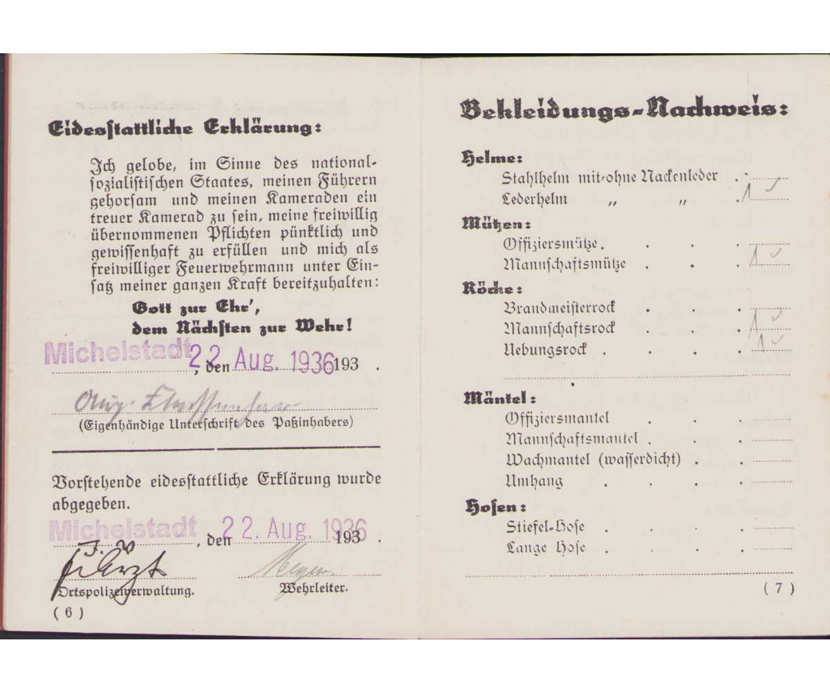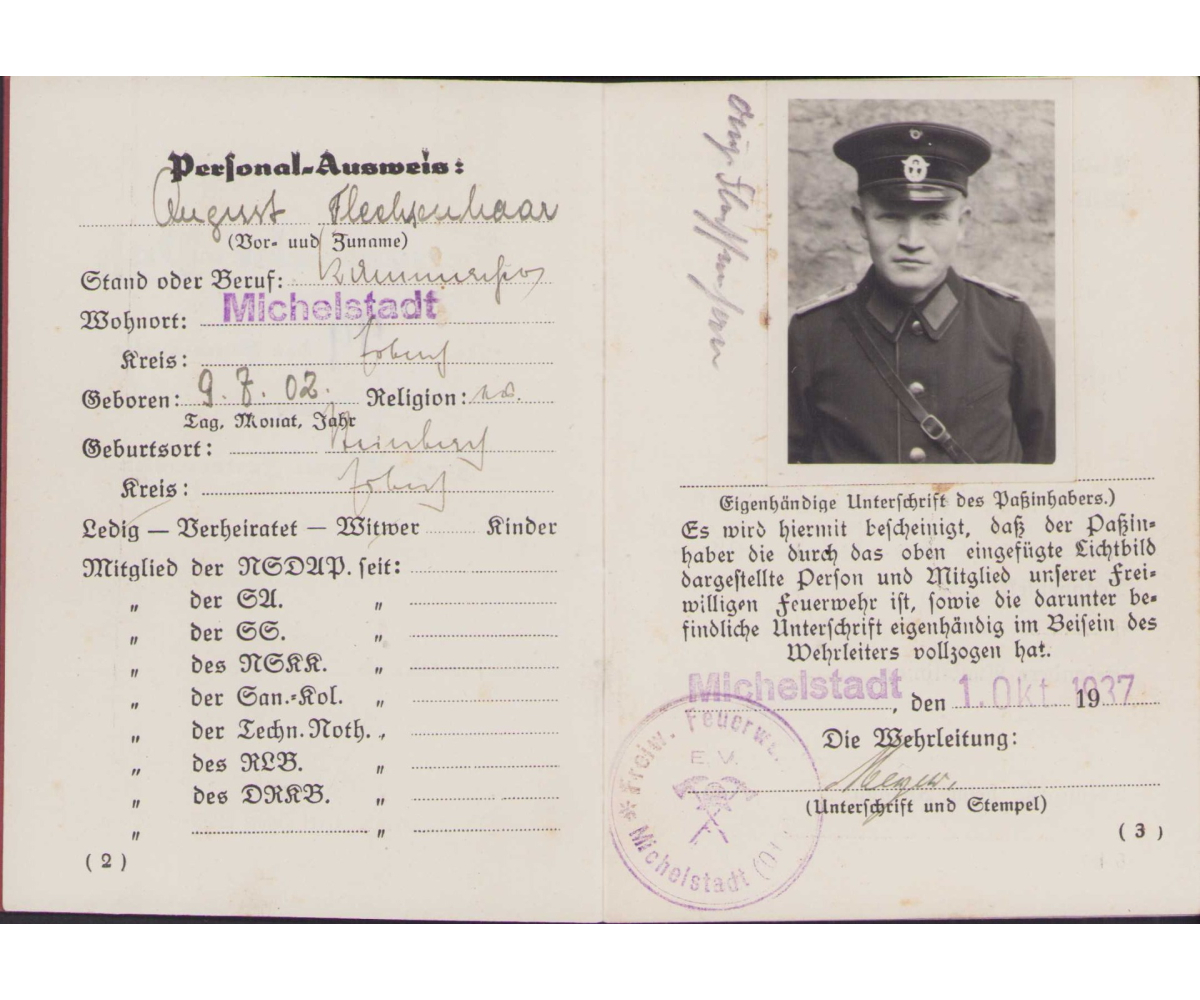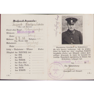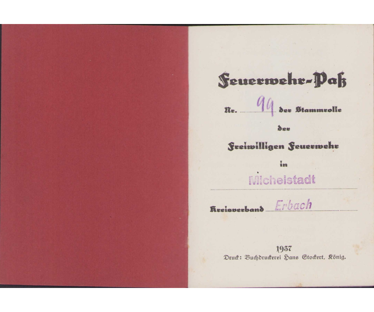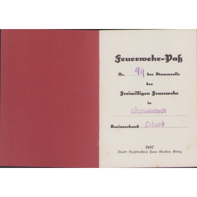 The pass shows overall normal signs of wear. It's solid and complete with all 31 pages. It belonged to August who served within the Freiwillige Feuerwehr in the town of Michelstadt. It's complete with portrait of August. All pages with entries have been scanned by us.