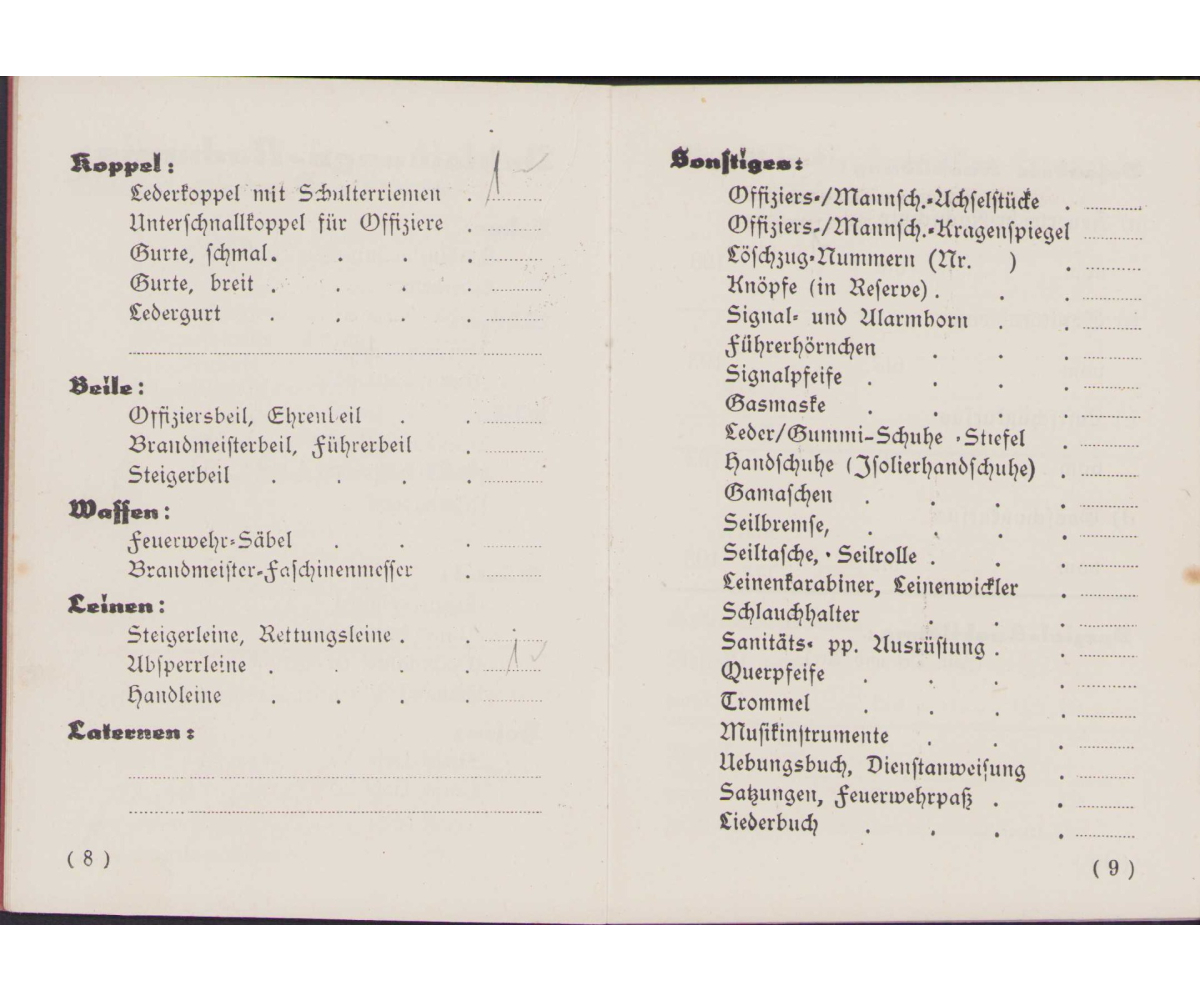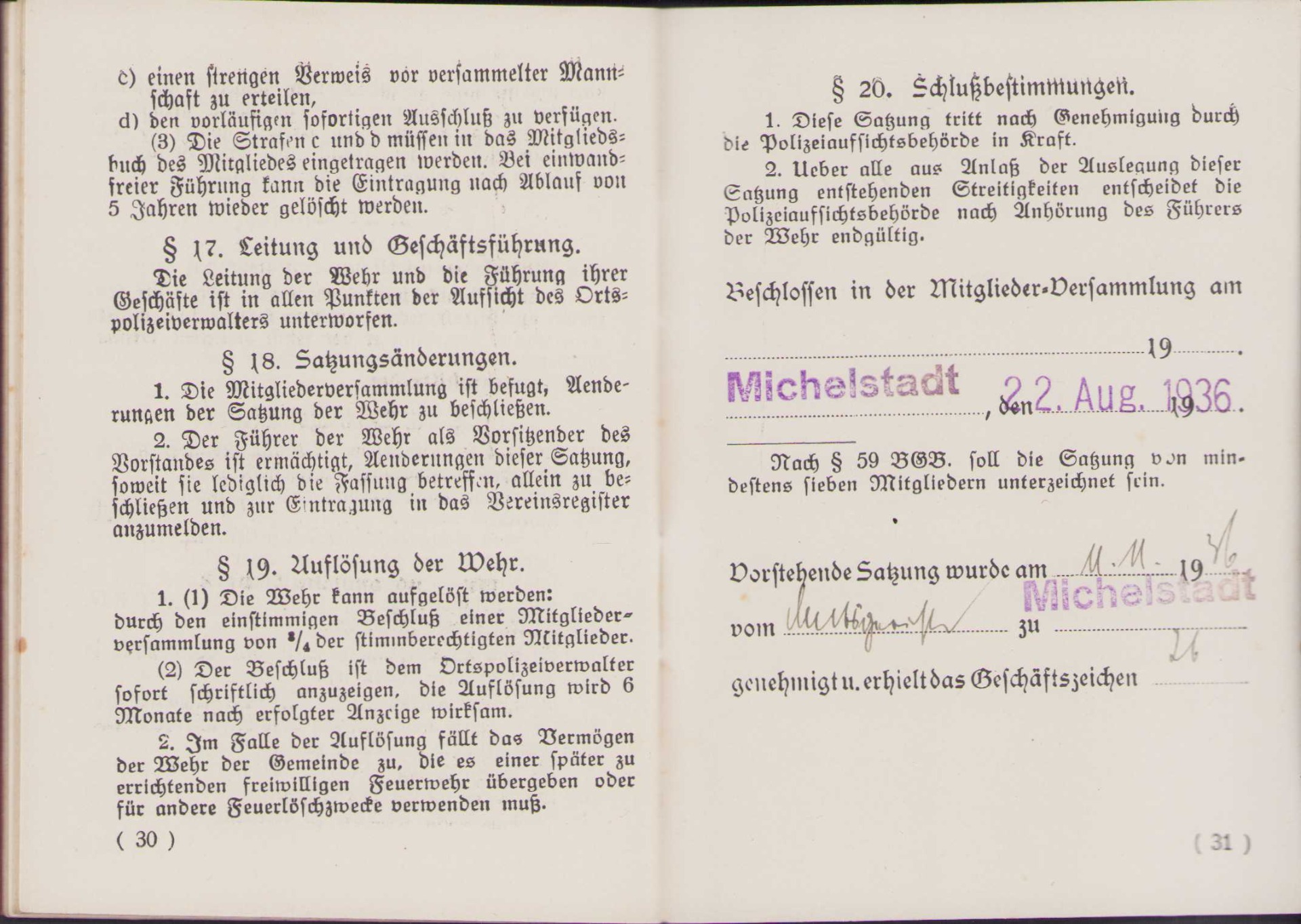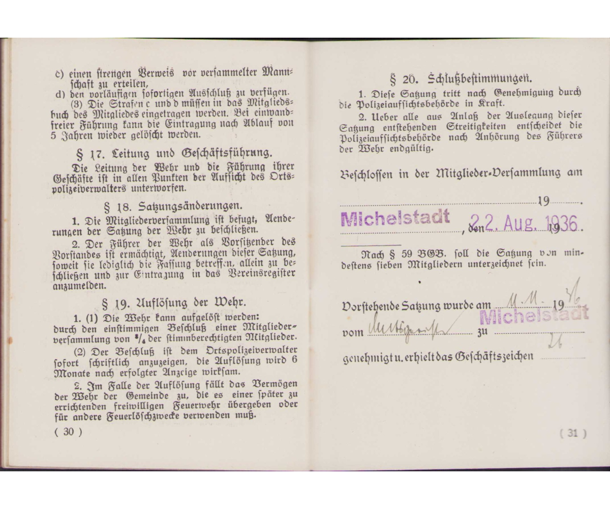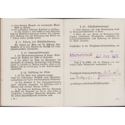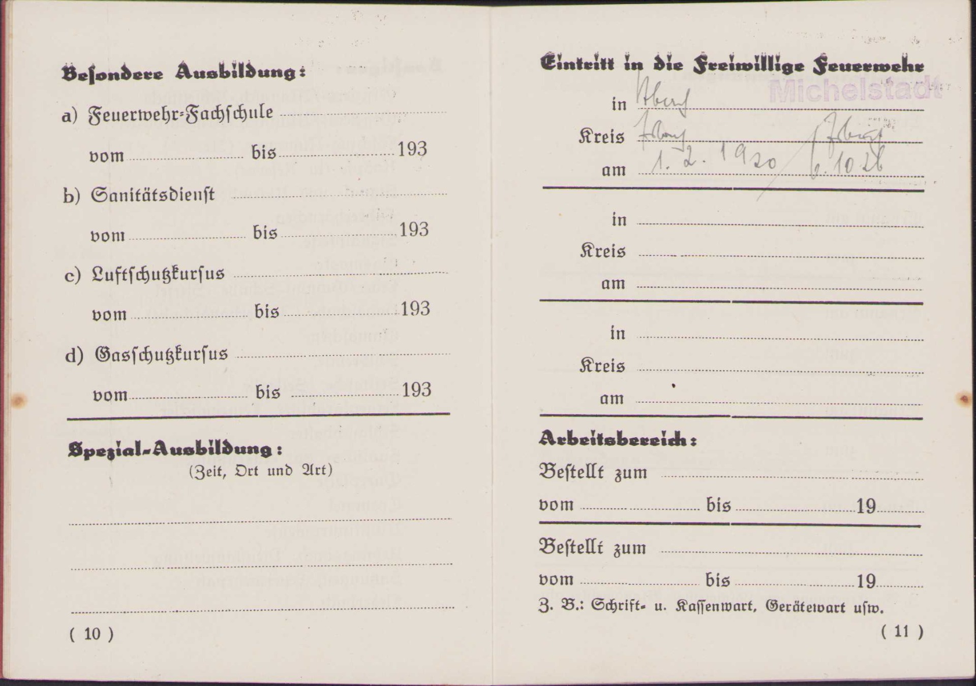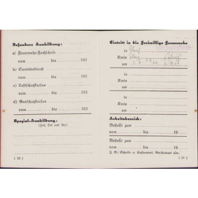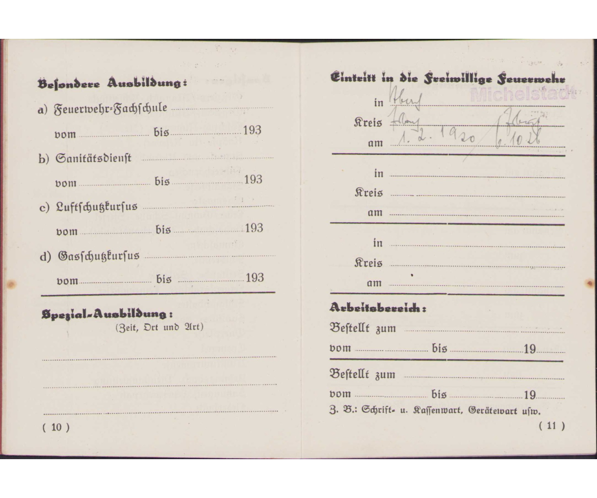 The pass shows overall normal signs of wear. It's solid and complete with all 31 pages. It belonged to August who served within the Freiwillige Feuerwehr in the town of Michelstadt. It's complete with portrait of August. All pages with entries have been scanned by us.