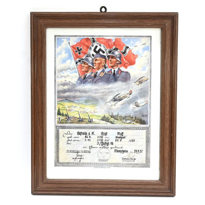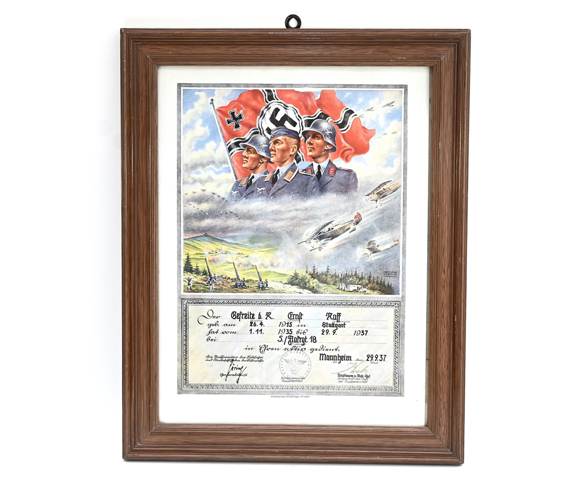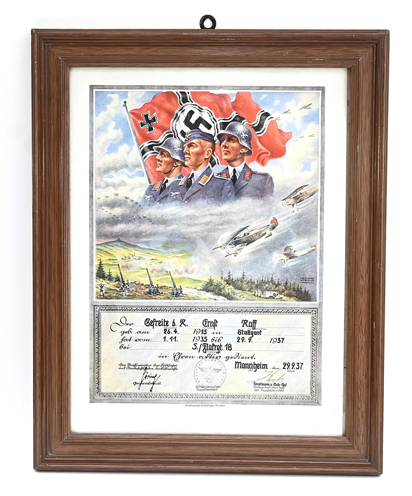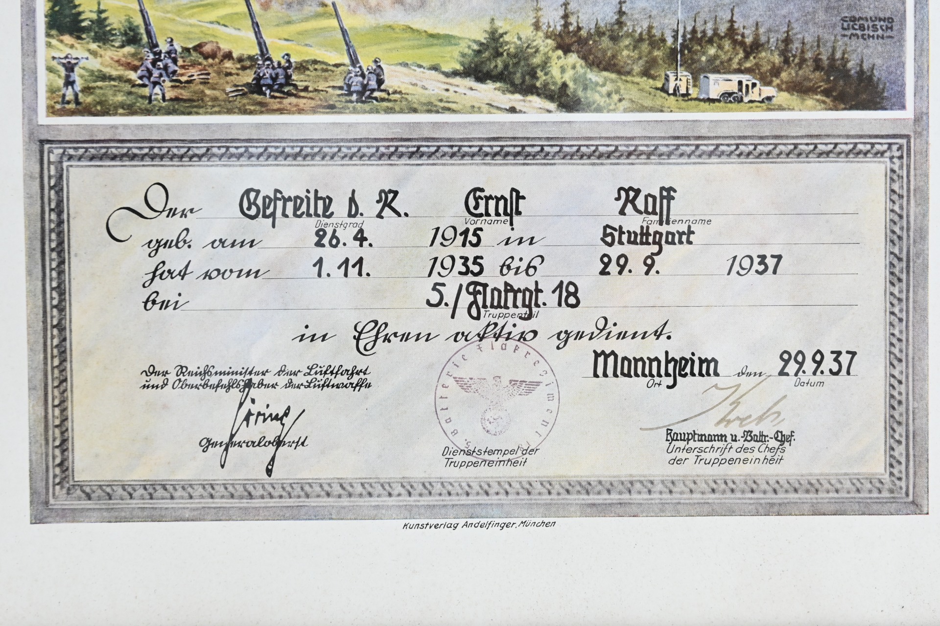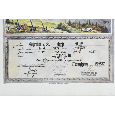 The piece shows overall normal signs of storage wear. The document was issued to Gefreiten der Reserve Ernst Raff who served from 01.11.1936 - 29.09.1937 in the 5.batterie Flak Regiment 18. This unit was formed in early October 1936. The size of the piece is 48cms*37cms.