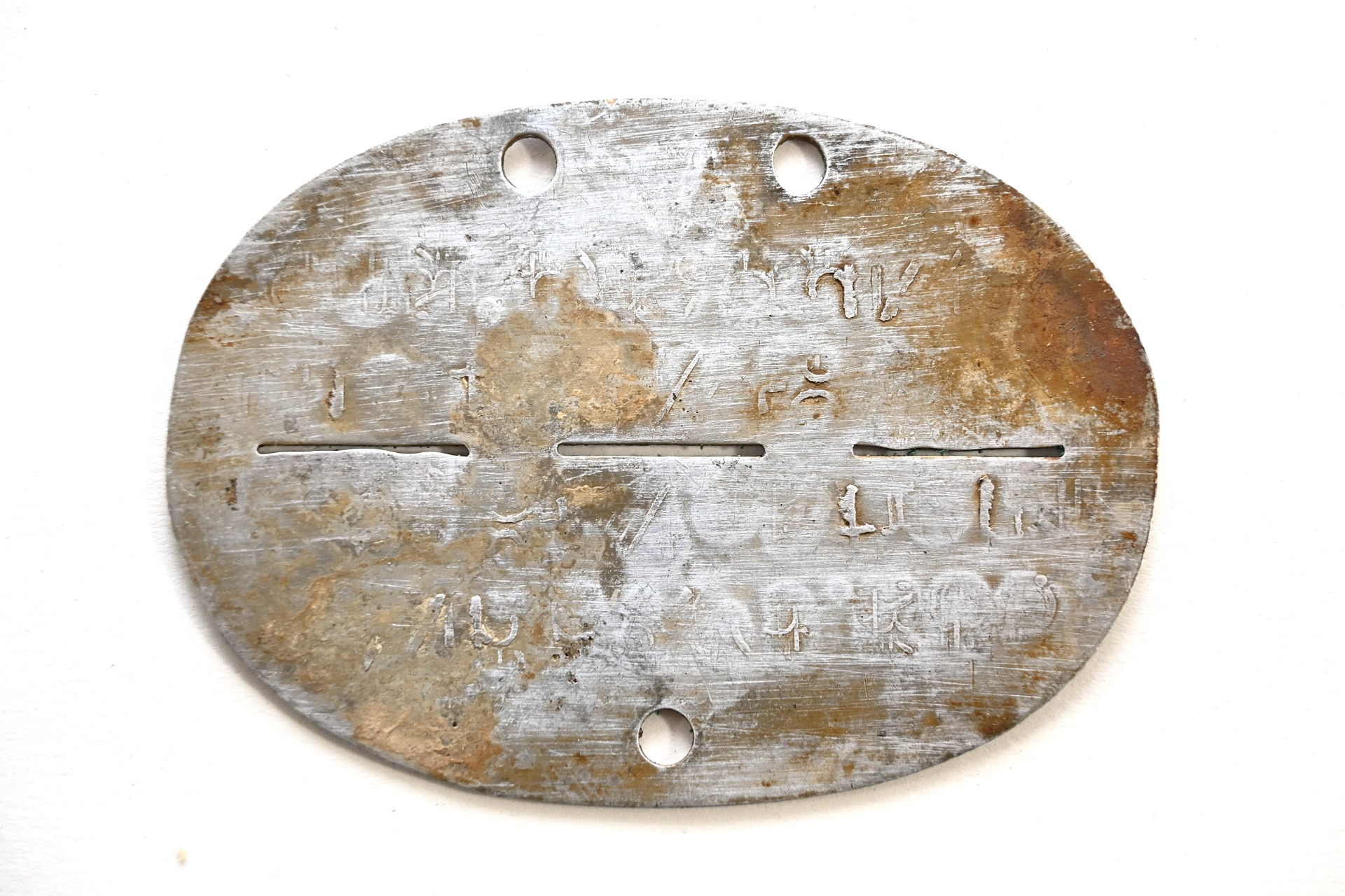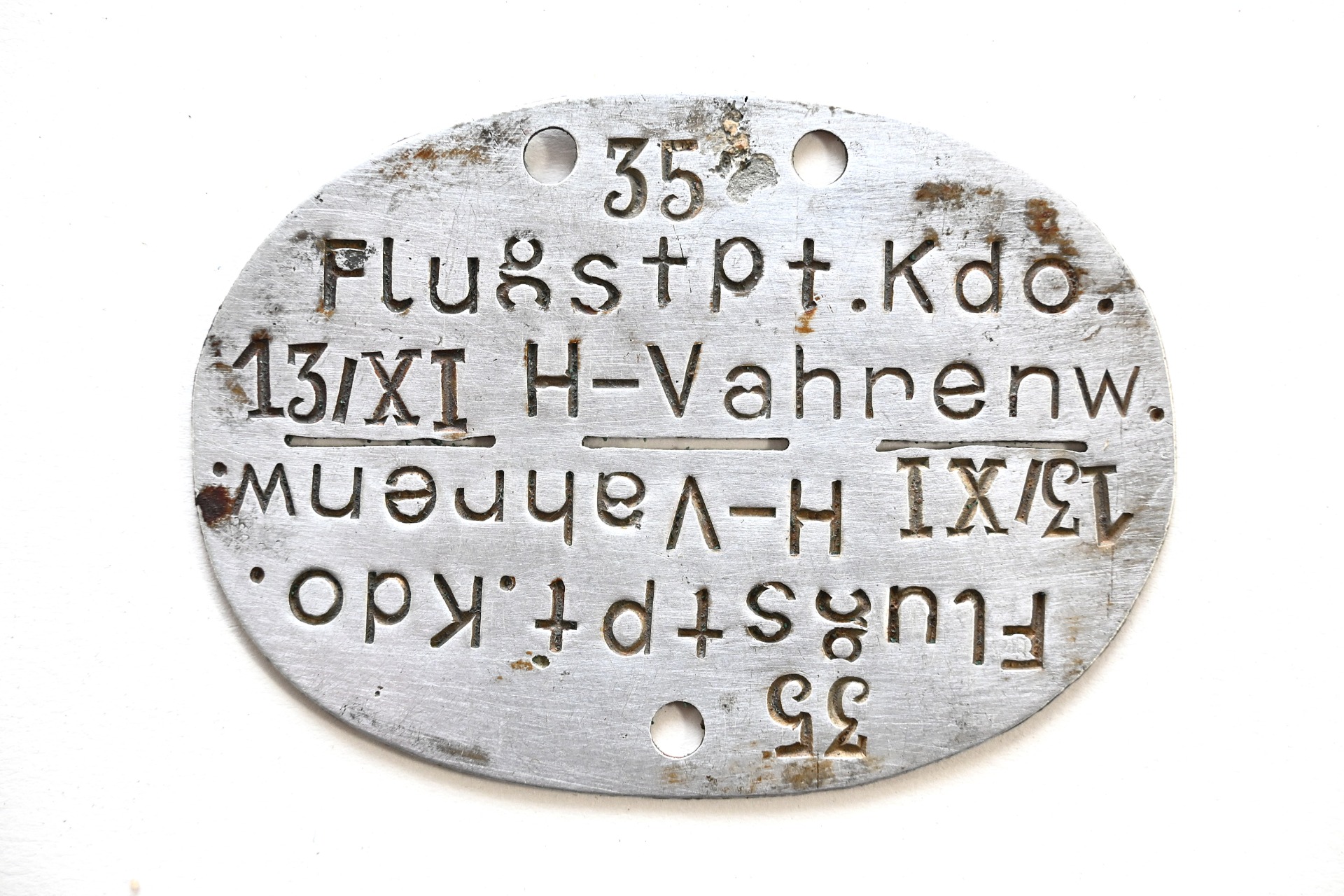 The tag or 'Erkennungsmarke' shows overall normal signs of wear. It belonged to a soldier who served in the Flugstützpunkt Kommando 13/XI Hannover-Vahrenwald. Formed in August 1939 Fliegerhorst-Kommandantur E Hannover-Vahrenwald, but renamed in early 1940. From June 1940 - April 1944 it operated in Laon, France.