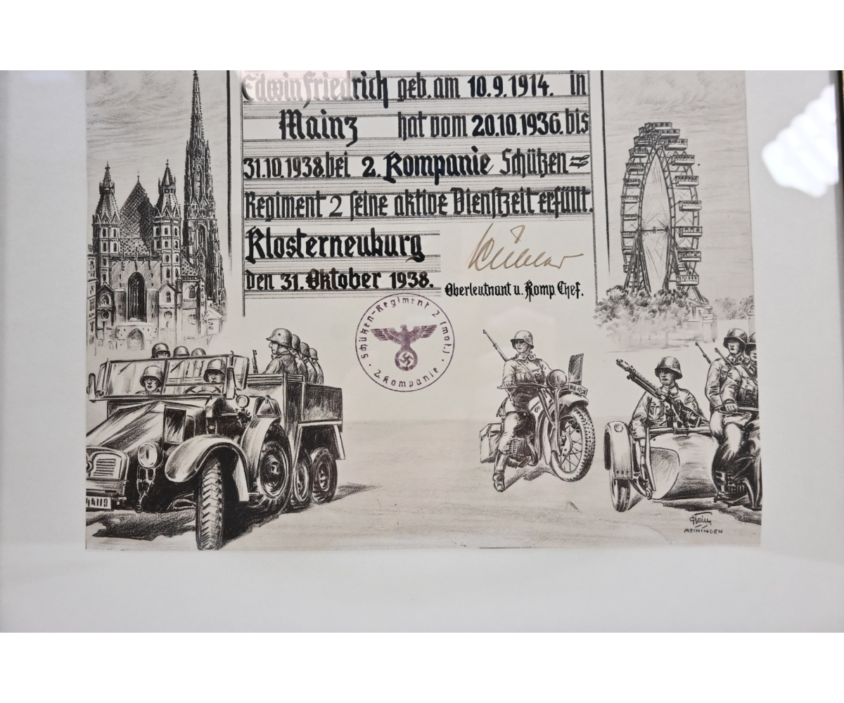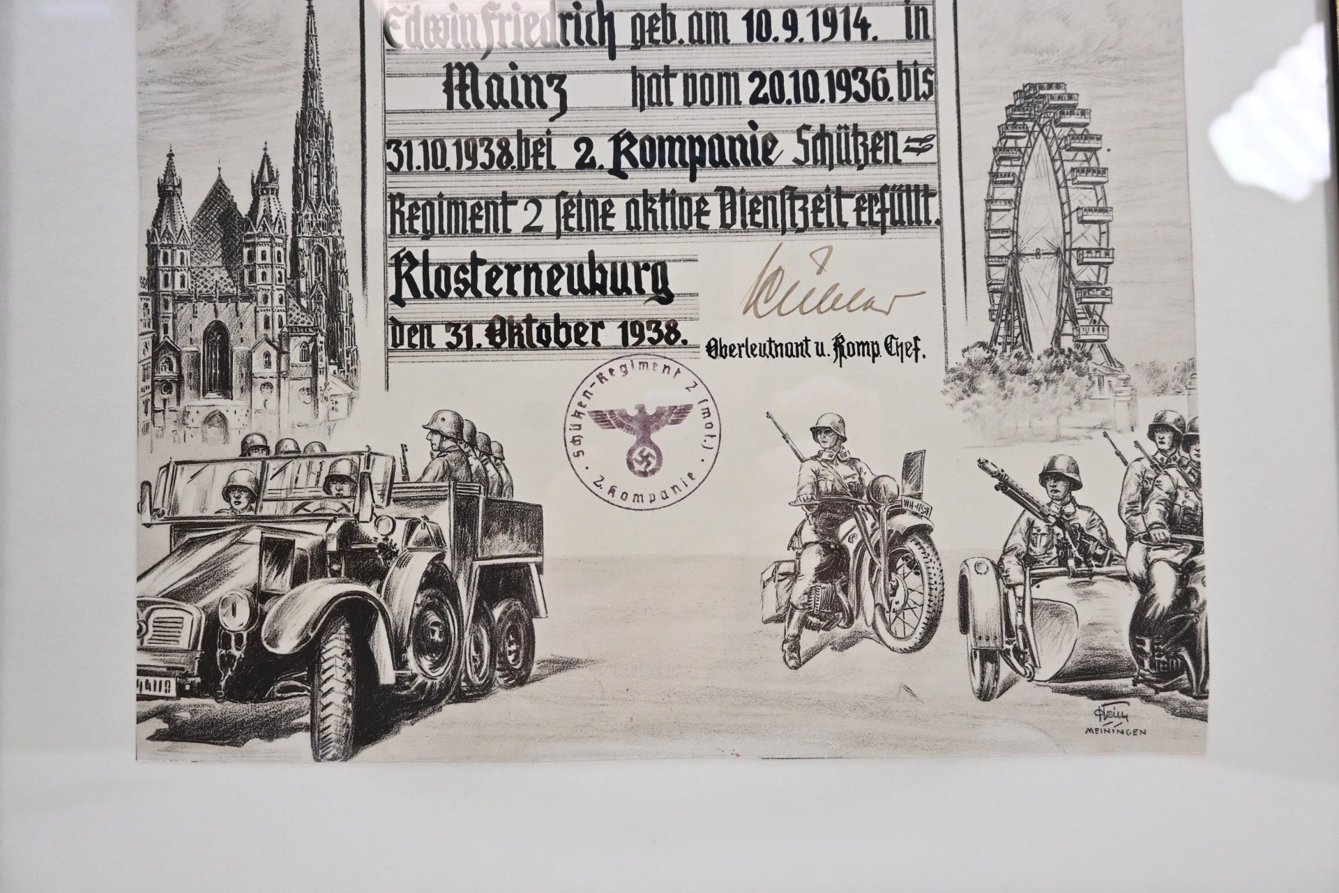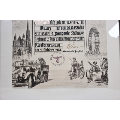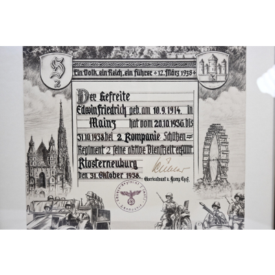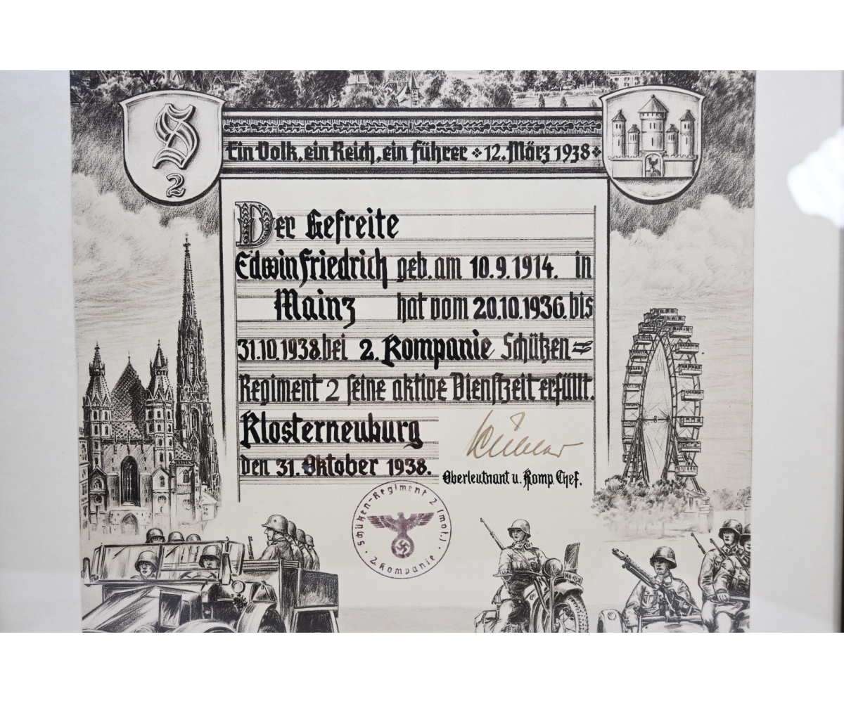 The piece shows overall normal signs of storage wear. The document was issued to Gefreite Edwin Friedrich who served from 20.10.1936 - 31.09.1938 in the 2.Kompanie Schützen Regiment 2. This unit was formed in mid-October 1934. The size of the piece is 38,5cms*34cms. The document itself has been trimmed (problably framed before) and it was framed by the previous owner.