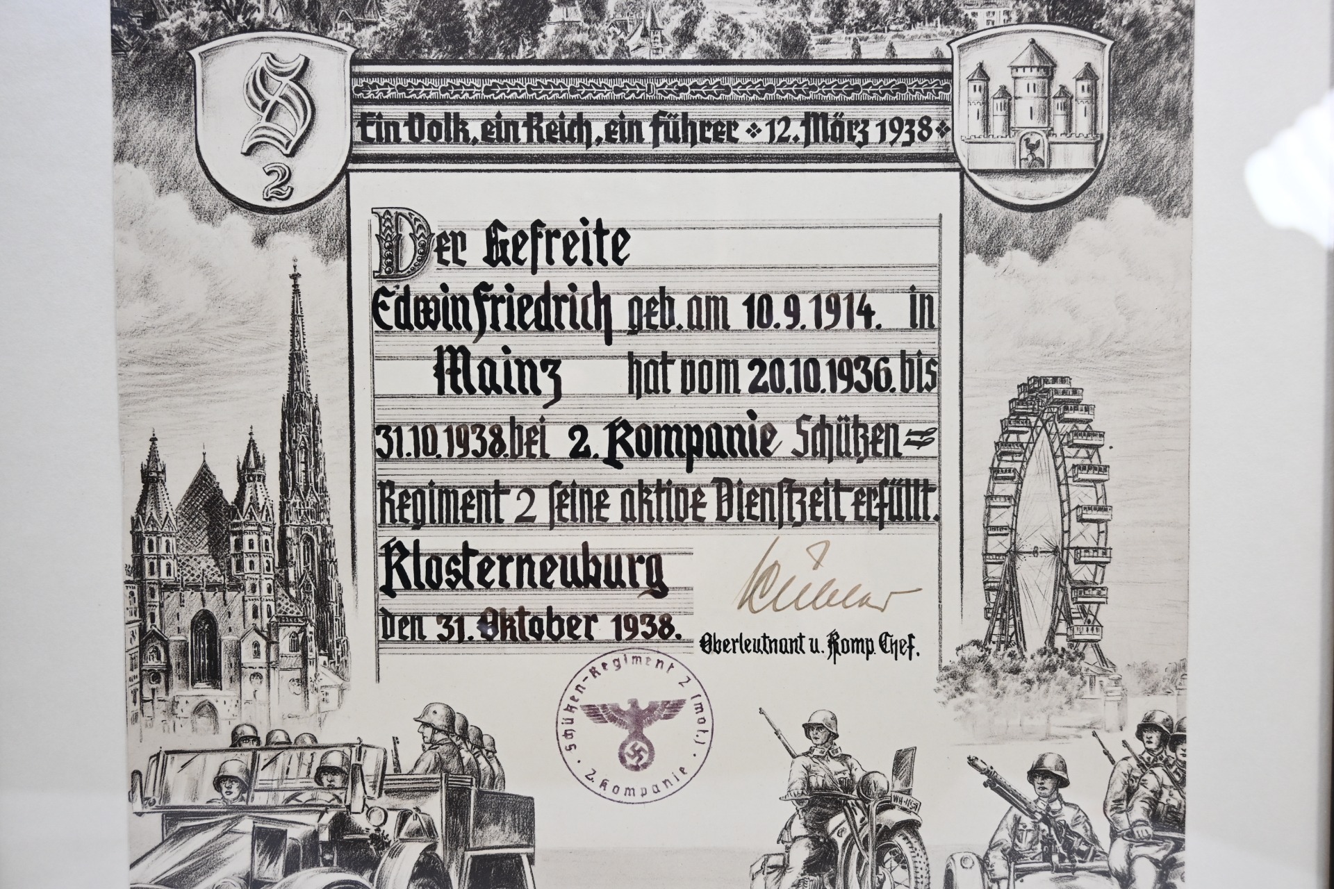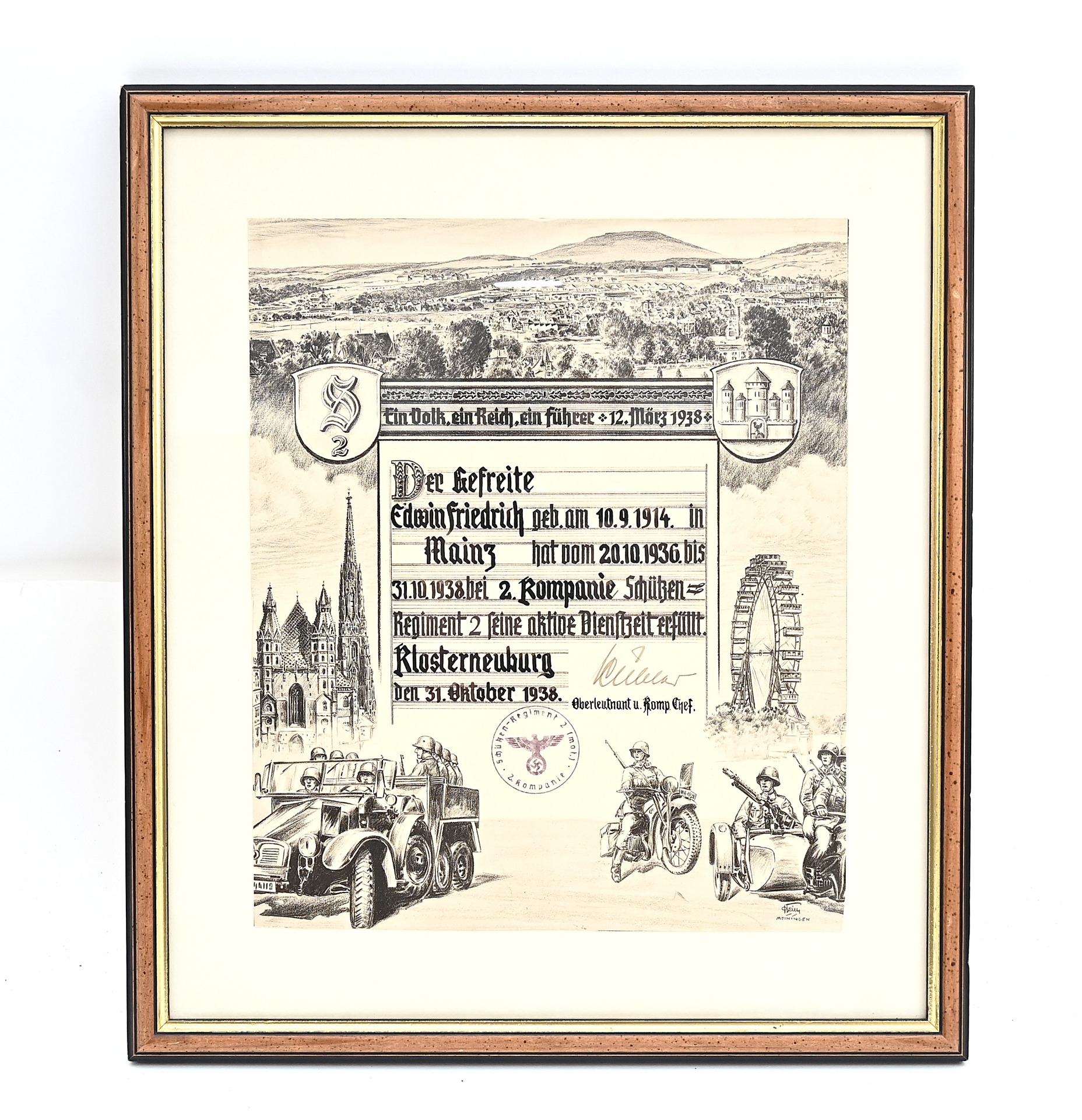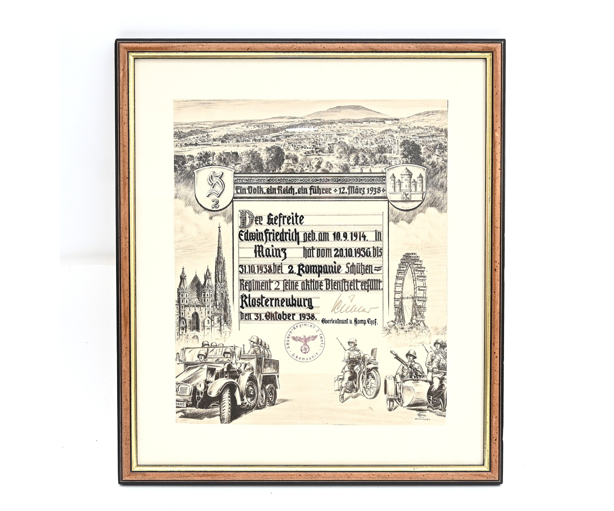 The piece shows overall normal signs of storage wear. The document was issued to Gefreite Edwin Friedrich who served from 20.10.1936 - 31.09.1938 in the 2.Kompanie Schützen Regiment 2. This unit was formed in mid-October 1934. The size of the piece is 38,5cms*34cms. The document itself has been trimmed (problably framed before) and it was framed by the previous owner.
