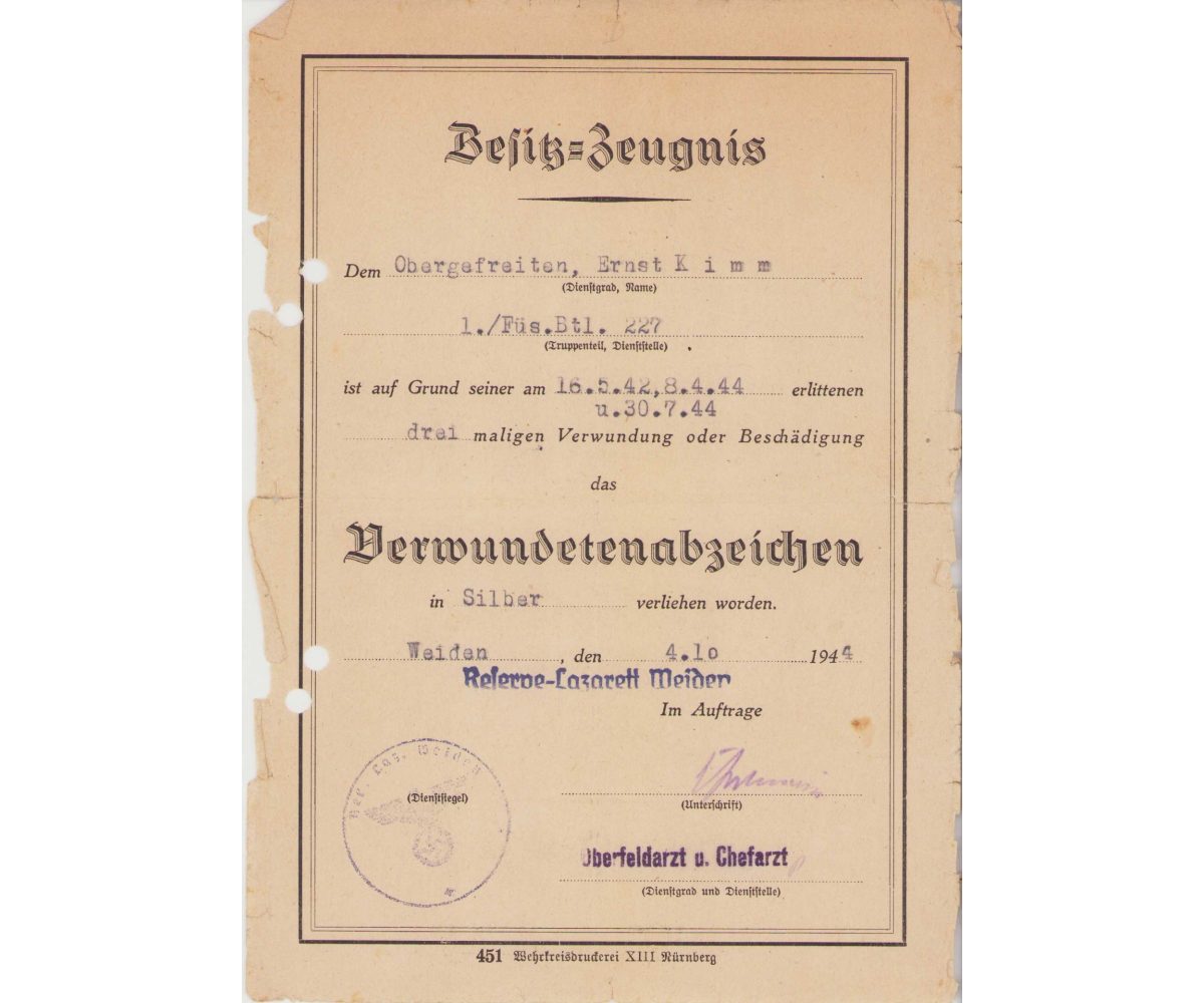 The document shows overall signs of wear. Mainly on the edges. The medal was awarded to Obergefreiten Ernst Kimm who served within the 1.Kompanie Füsilier Bataillon 227. This unit was formed in June 1943 in North Russia and part of the 227.Infanterie-Division. Ernst was wounded a total of 3 times.