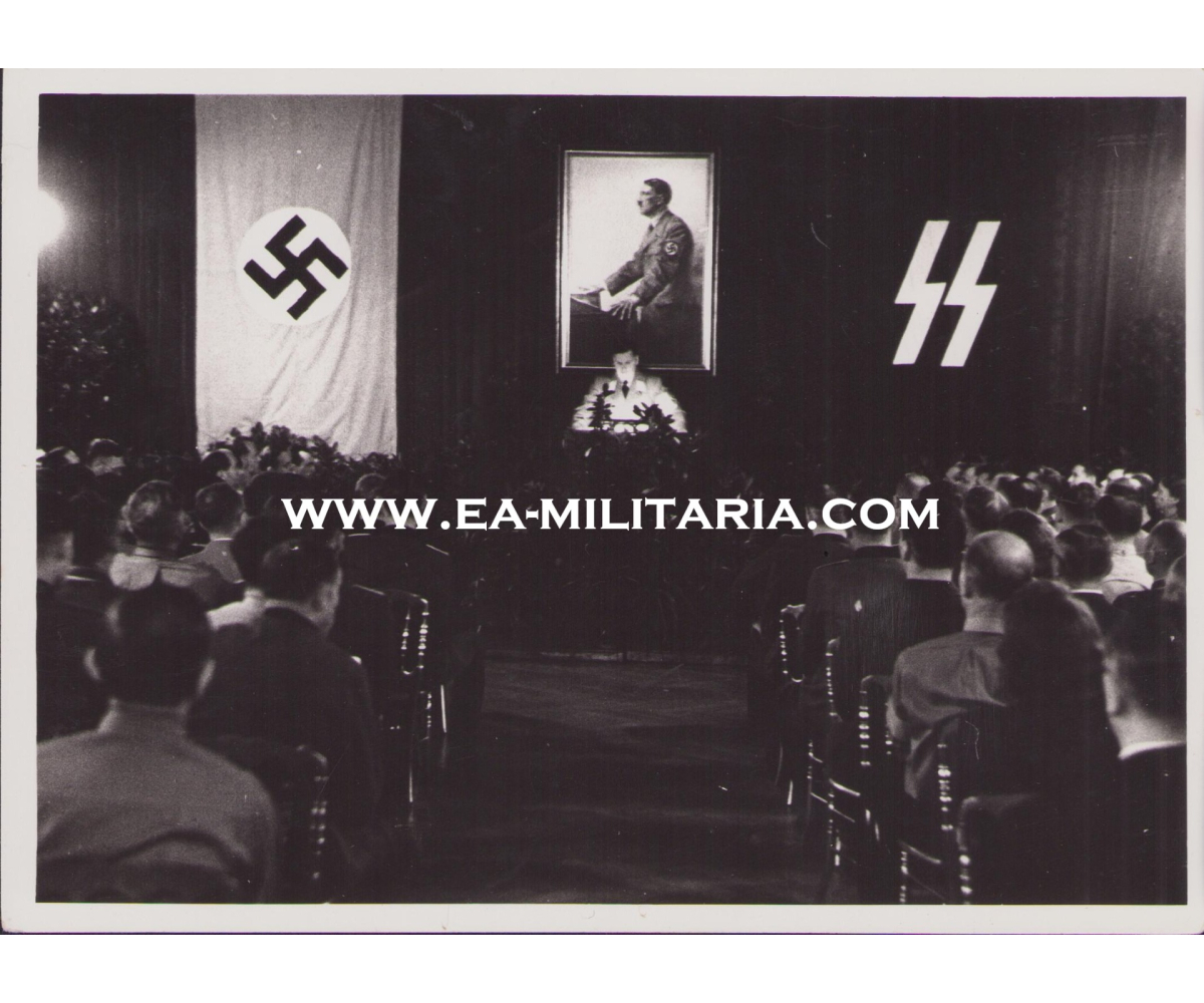 The photograph shows overall normal signs of storage wear. No caption on the back, bu it appears it never had one. It seems that a Gauleiter is holding a speech. Note the large painting of Adolf Hitler behind the Gauleiter and the large banners.