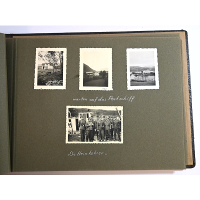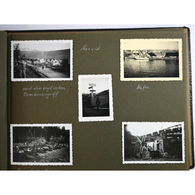 The album shows overall normal signs of wear (1 page is loose). The album contains a total of 239! photographs (among else 2 photos from Generalleutnant Valentin Feurstein), a (bevo) edelweiss sleeve patch and an coloured sketch of Norway. The photos where taken in Norway (among else in Narvik, Steinkjer, Oslo, Fauske,). No easy to find!