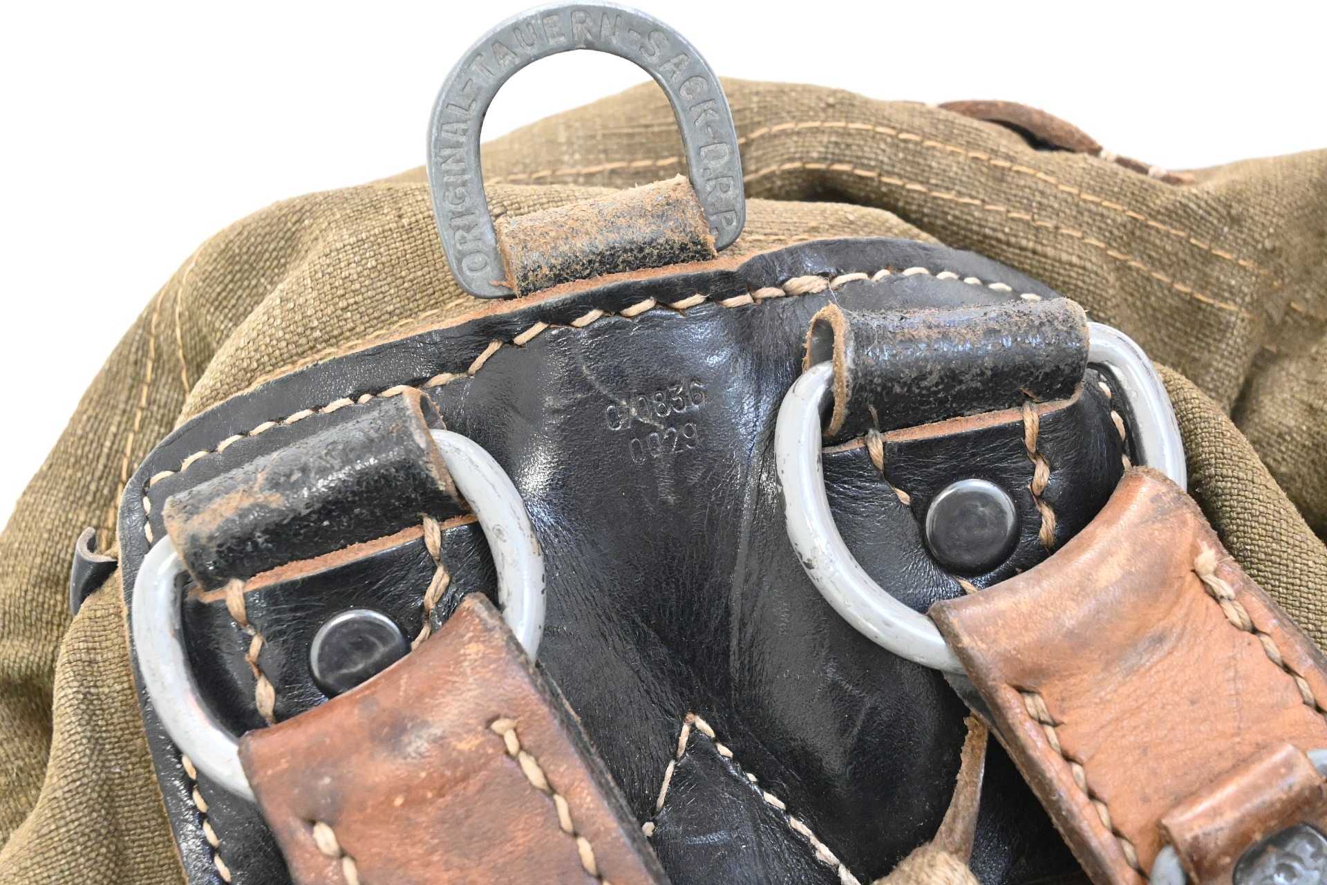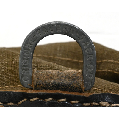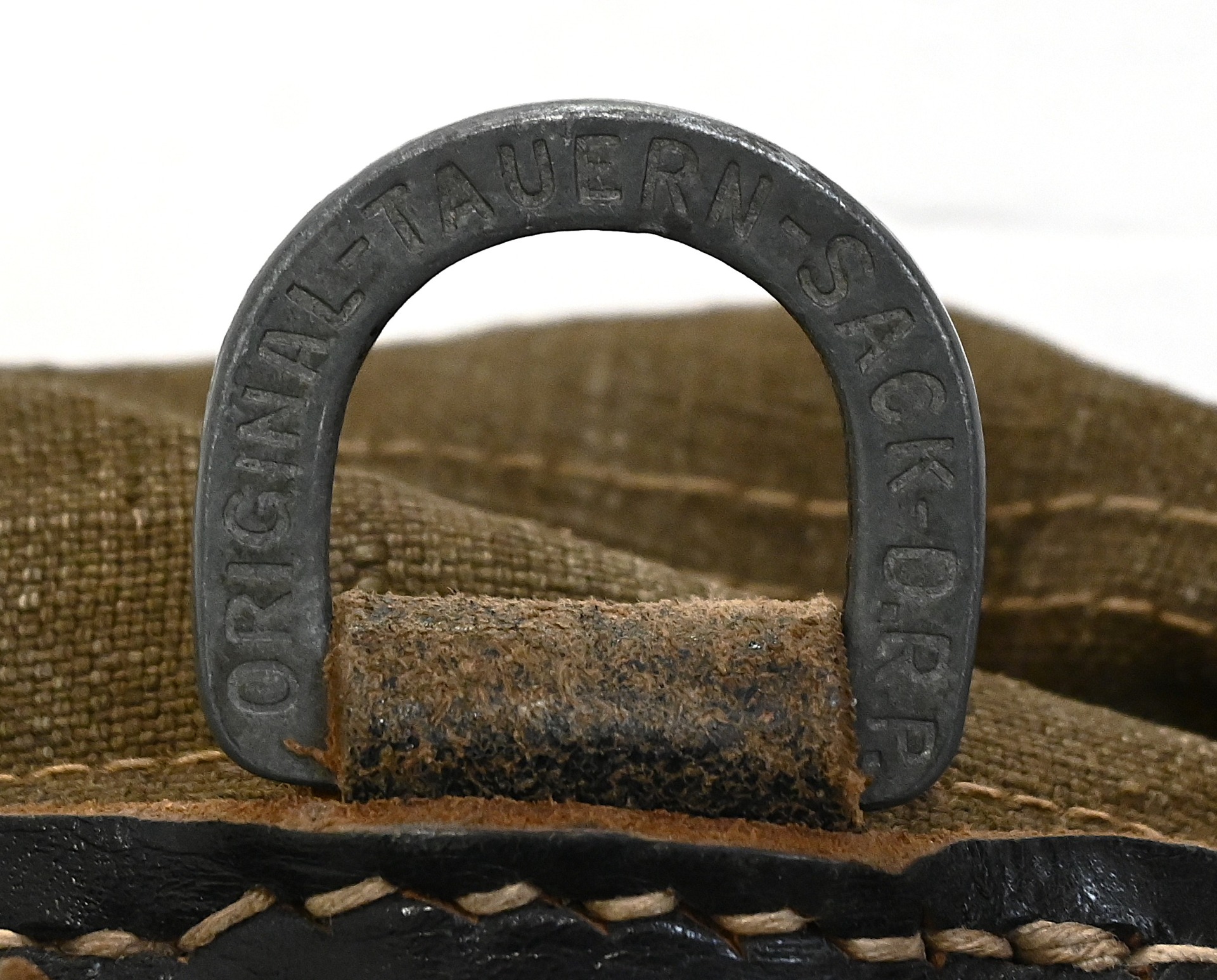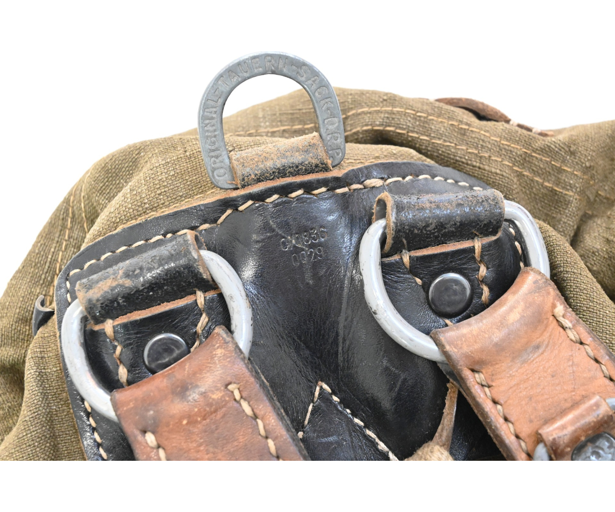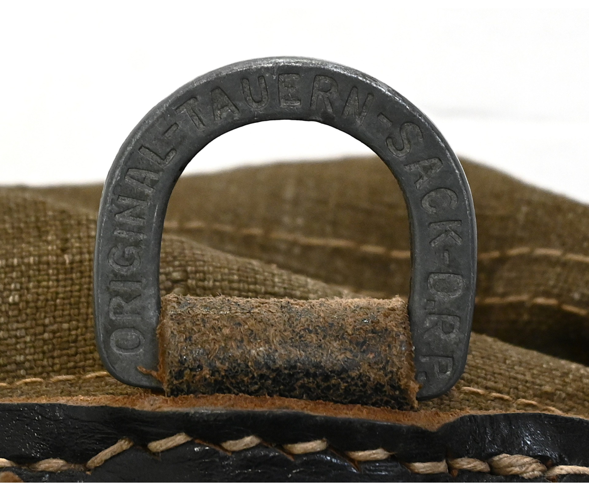 The backpack shows overall normal signs of wear. All leather straps/parts are present and supple. Marked on the back with 0/0836/0029. which indicates it was produced by Hans Deuter from Augsburg. This type of backpack has a webbing frame on the back for comfort. The d-ring is marked 'Original-Tauern-Sack-D.R.P.'.
