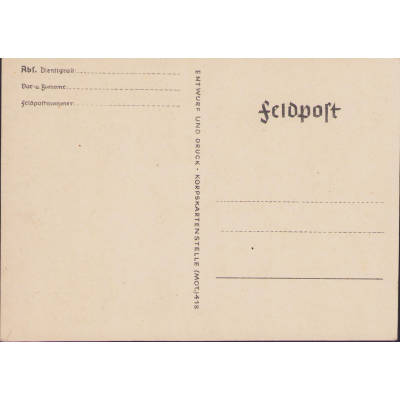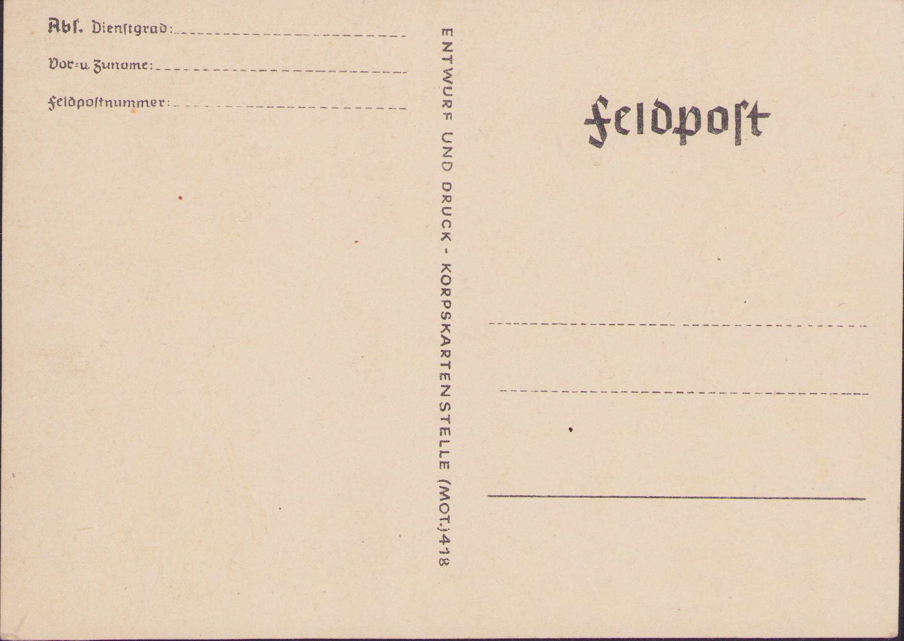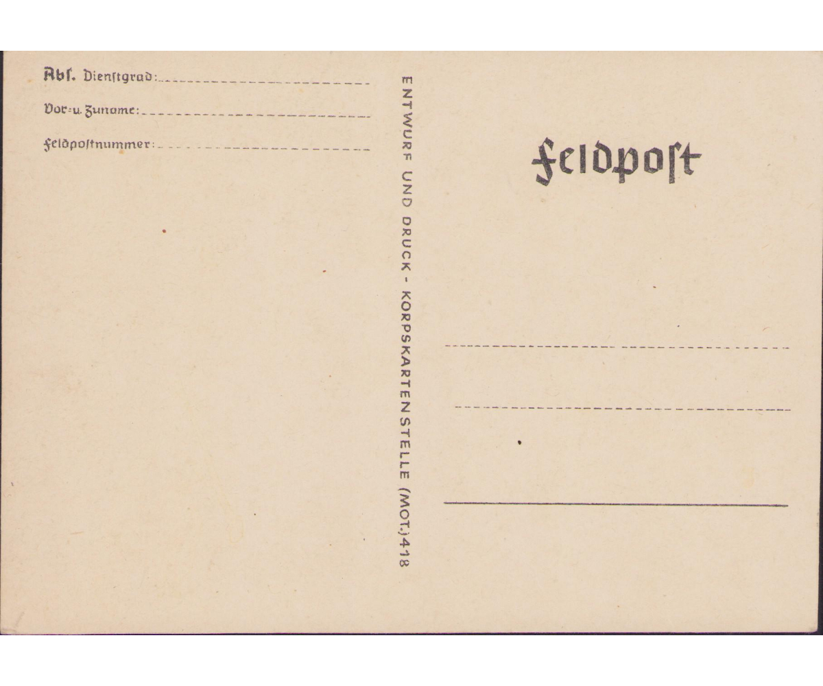 The postcard shows overall normal signs of storage wear. Issued/printed by the Korpskartenstelle (mot) 418.