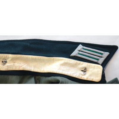 This very carefully tailored feldbluse is in excellent condition. All the insignia is present and tailor applied. It comes with two silver wire embroidered collar tabs, a silver bullion officers breast eagle, shoulder-boards with the rank of an lieutenant or 'leutnant' and an exceptional officer's edelweiss sleeve badge in silver- and gold-coloured bullion on the right arm. It has a nice added green collar to give the uniform a luxurious look and 'Modell 36' appearance.