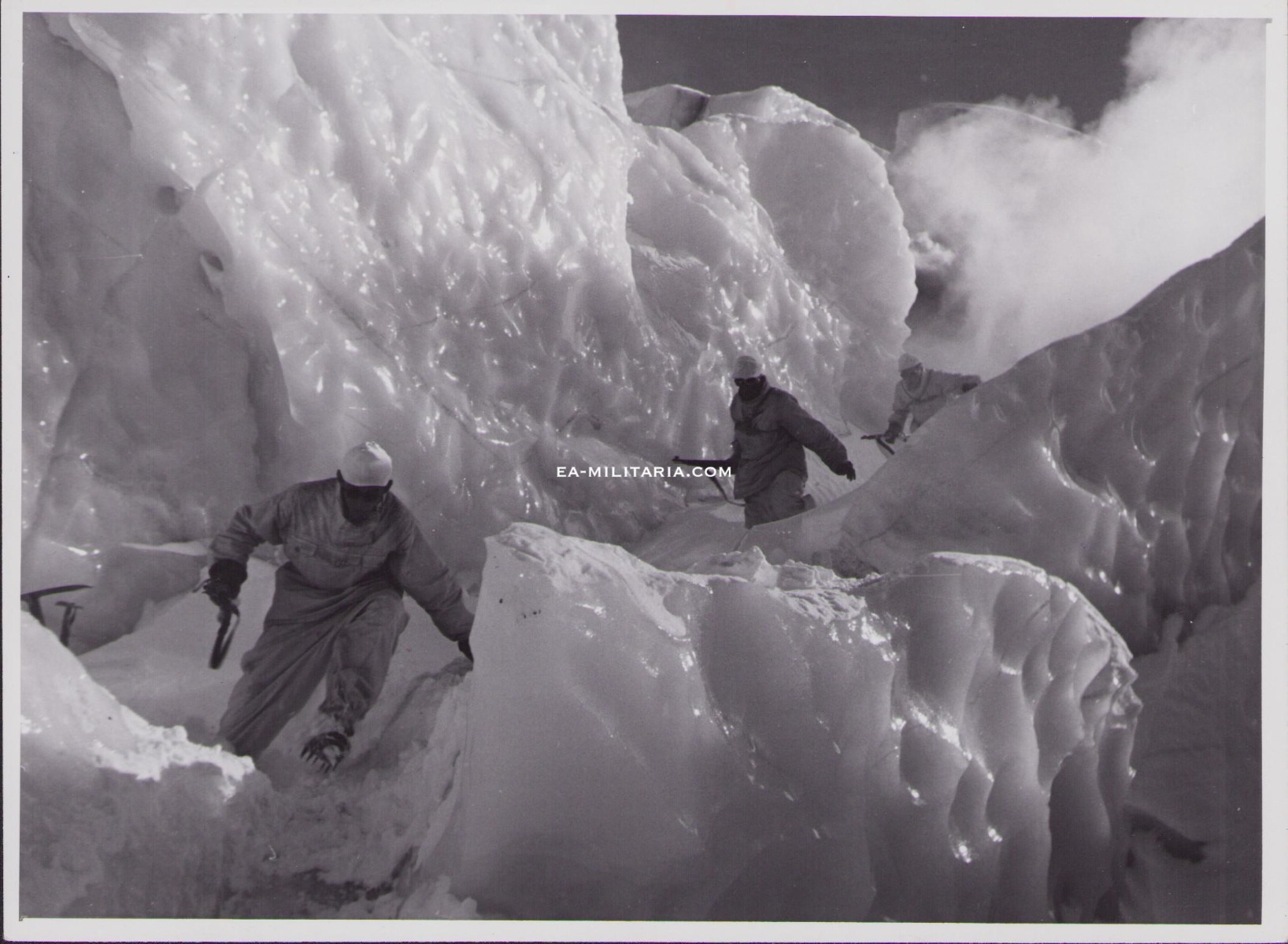 The photograph shows overall no signs of wear. Complete with caption on the back. It shows a unit running to their fightingposition. The caption on the back reads,'Alarm in einer Hochgebirgsstellung'.