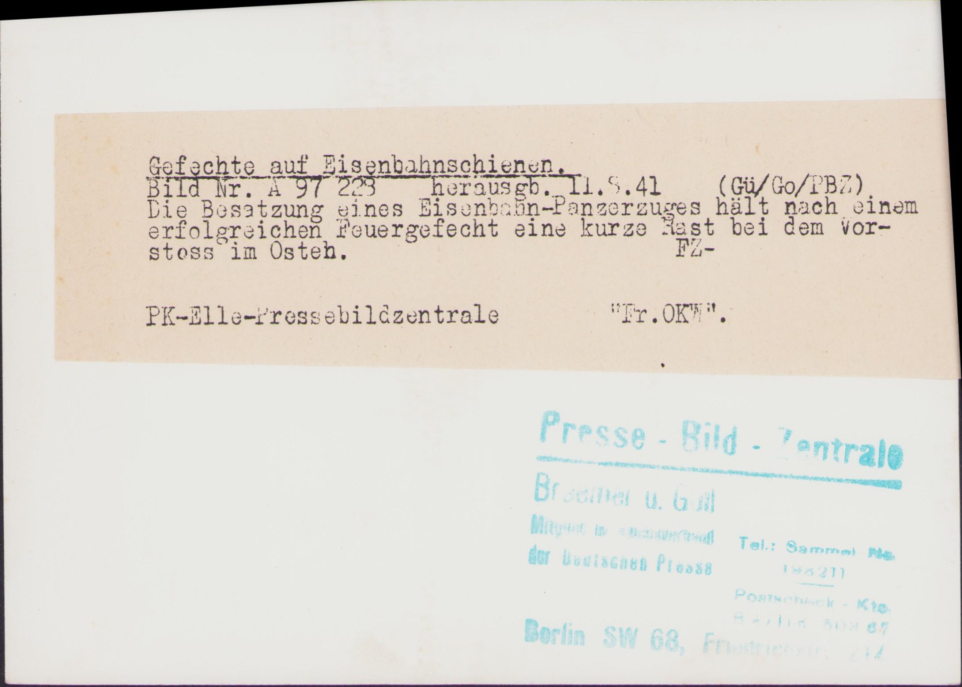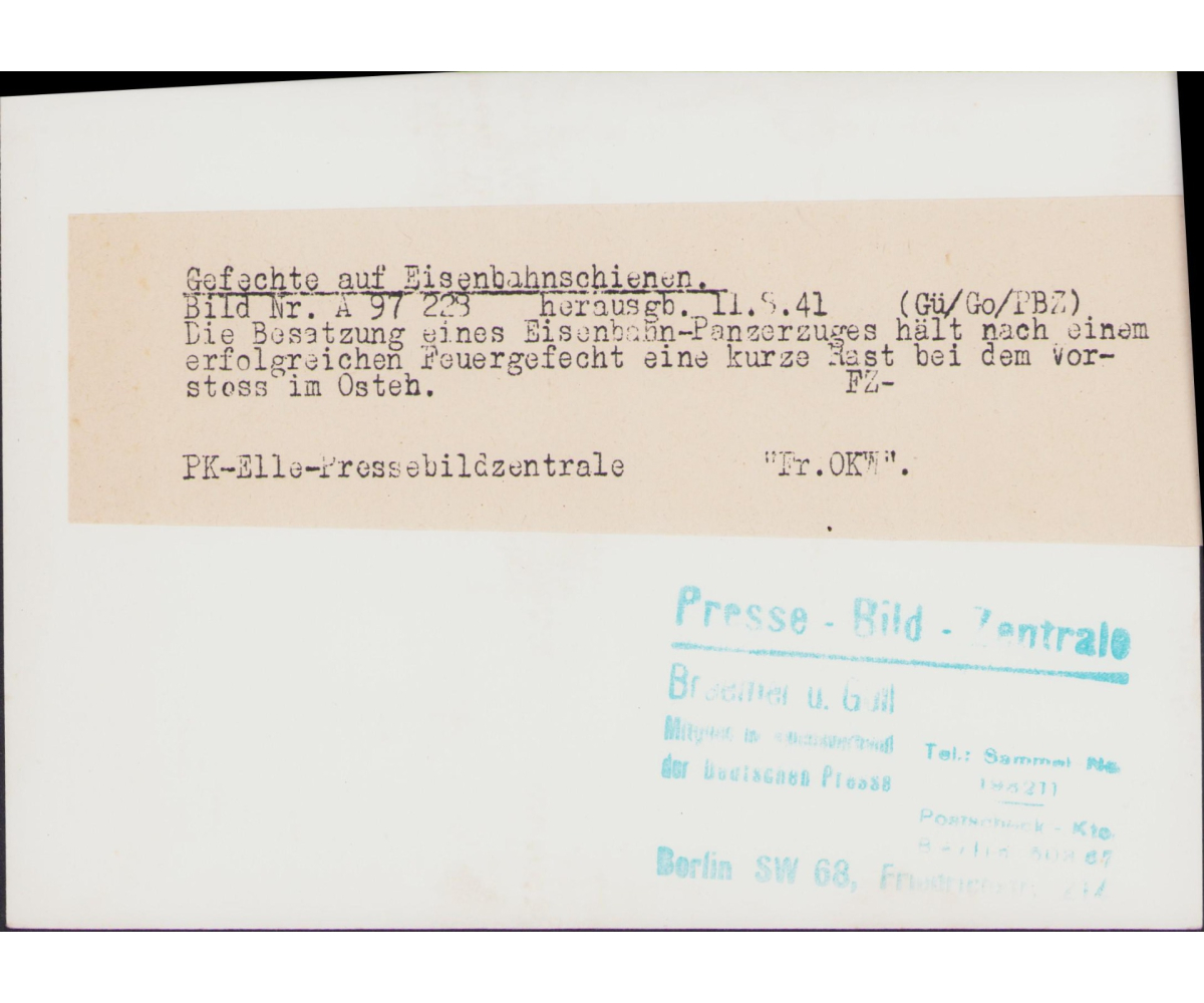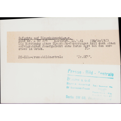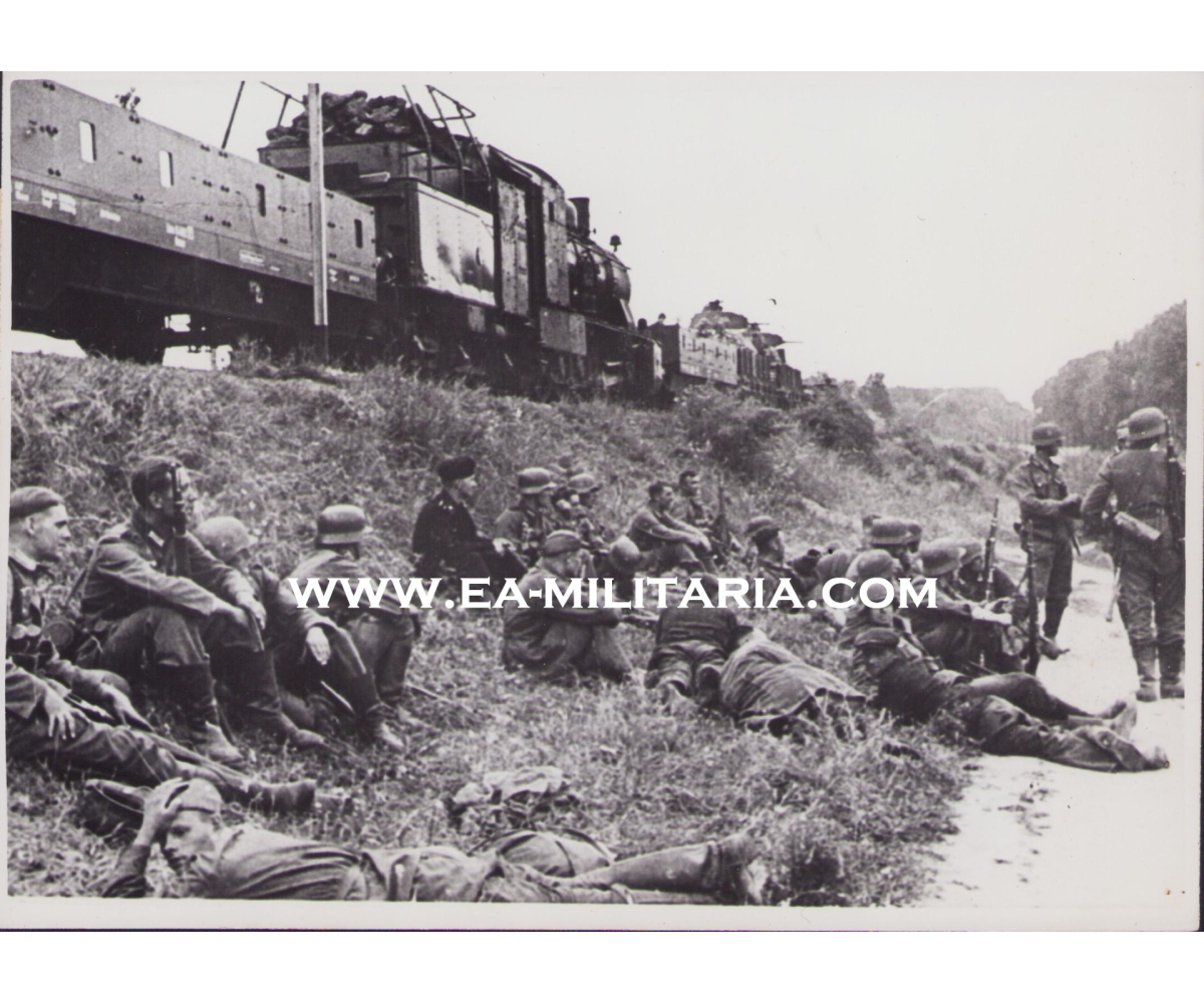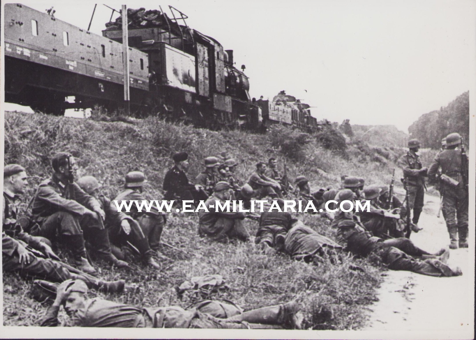 The photo shows overall normal signs of storage wear. It's complete with paper caption on the back. Here German soldiers are resting after they destroyed a armored train.