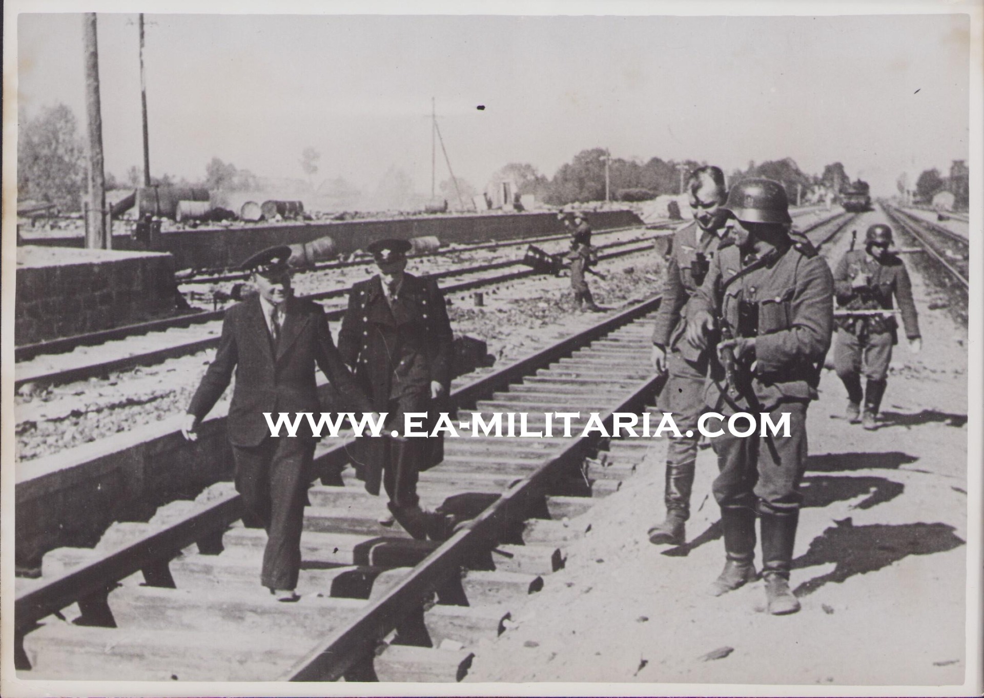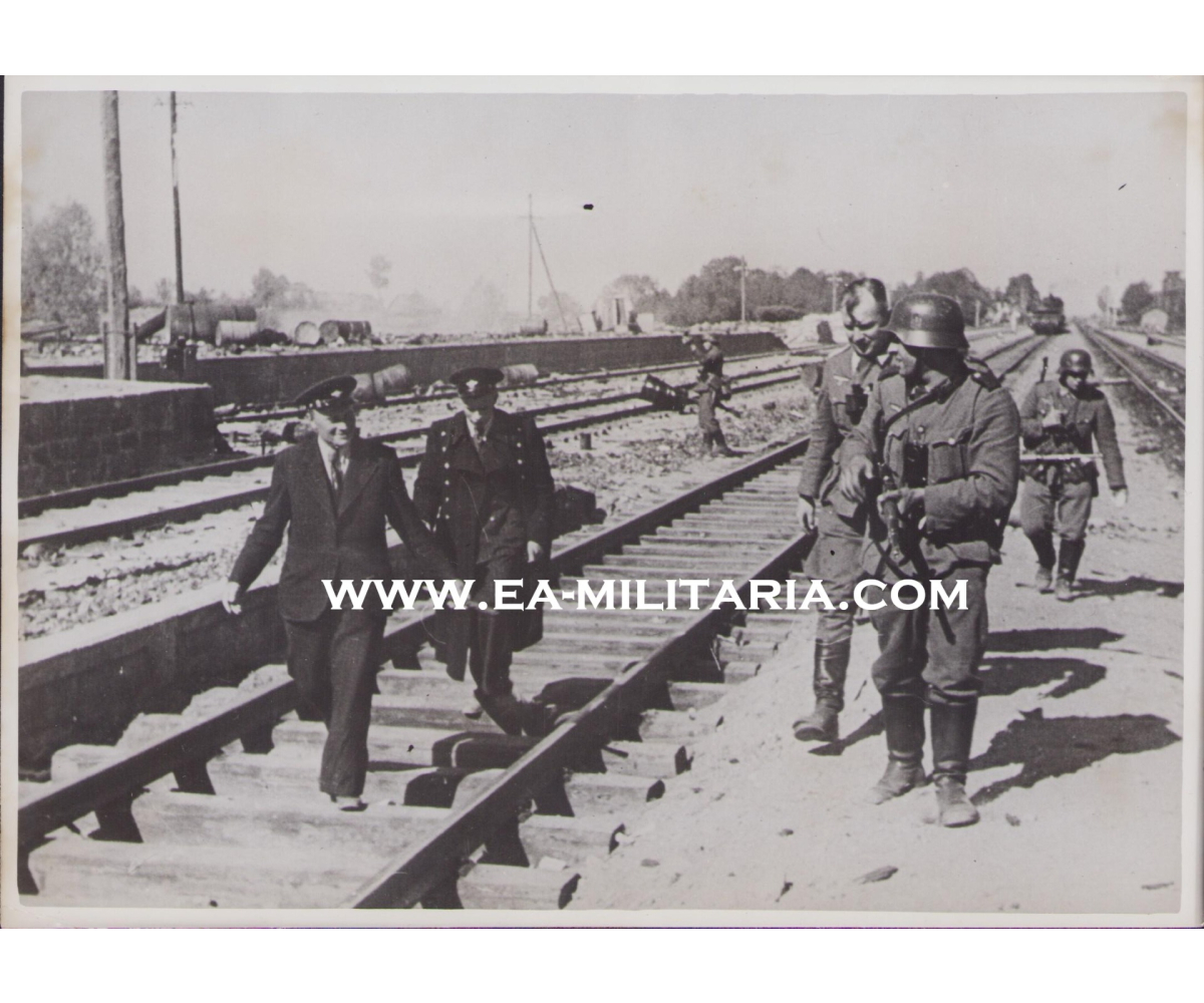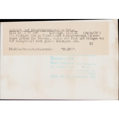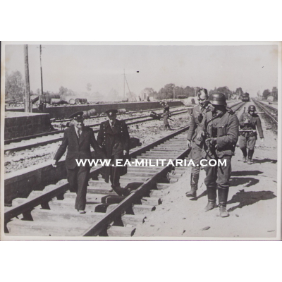 The photo shows overall normal signs of storage wear. It's complete with paper caption on the back. Here a group of German Pioniers are escorting Russian prisoners after they have camptured a train station.