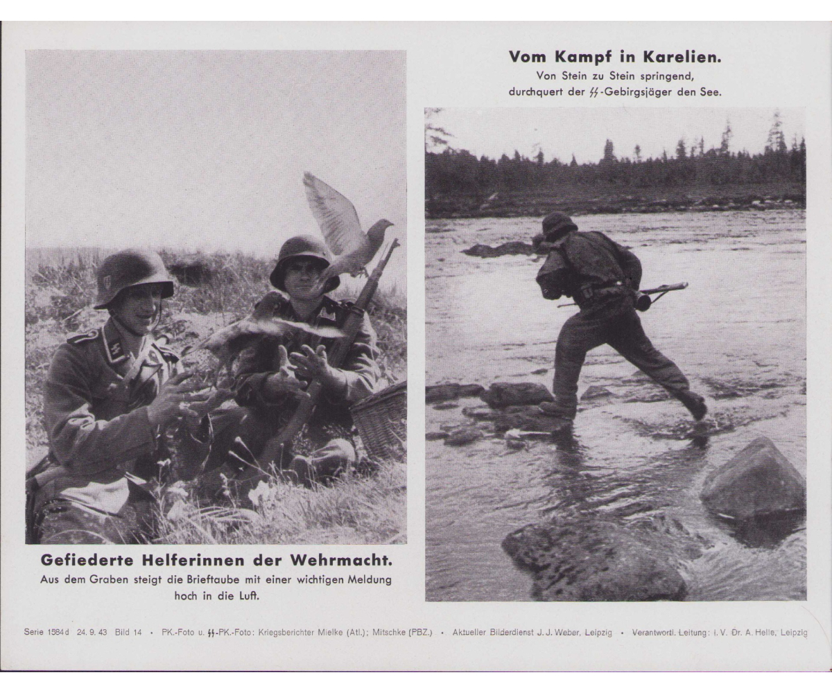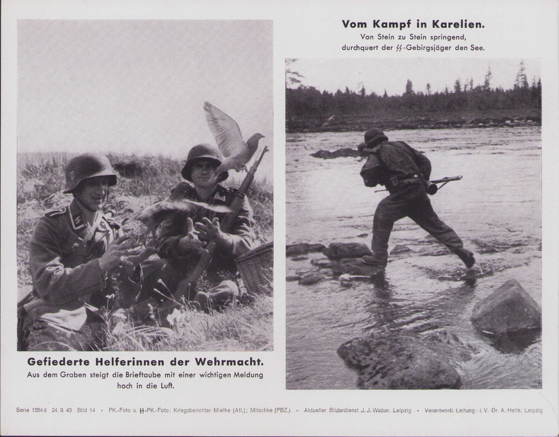 The photo shows overall normal signs of storage wear. On the left photo we see 2 Waffen-SS soldiers releasing 2 carrier pigeons. On the right photo a SS-Gebirgsjäger is crossing a river.