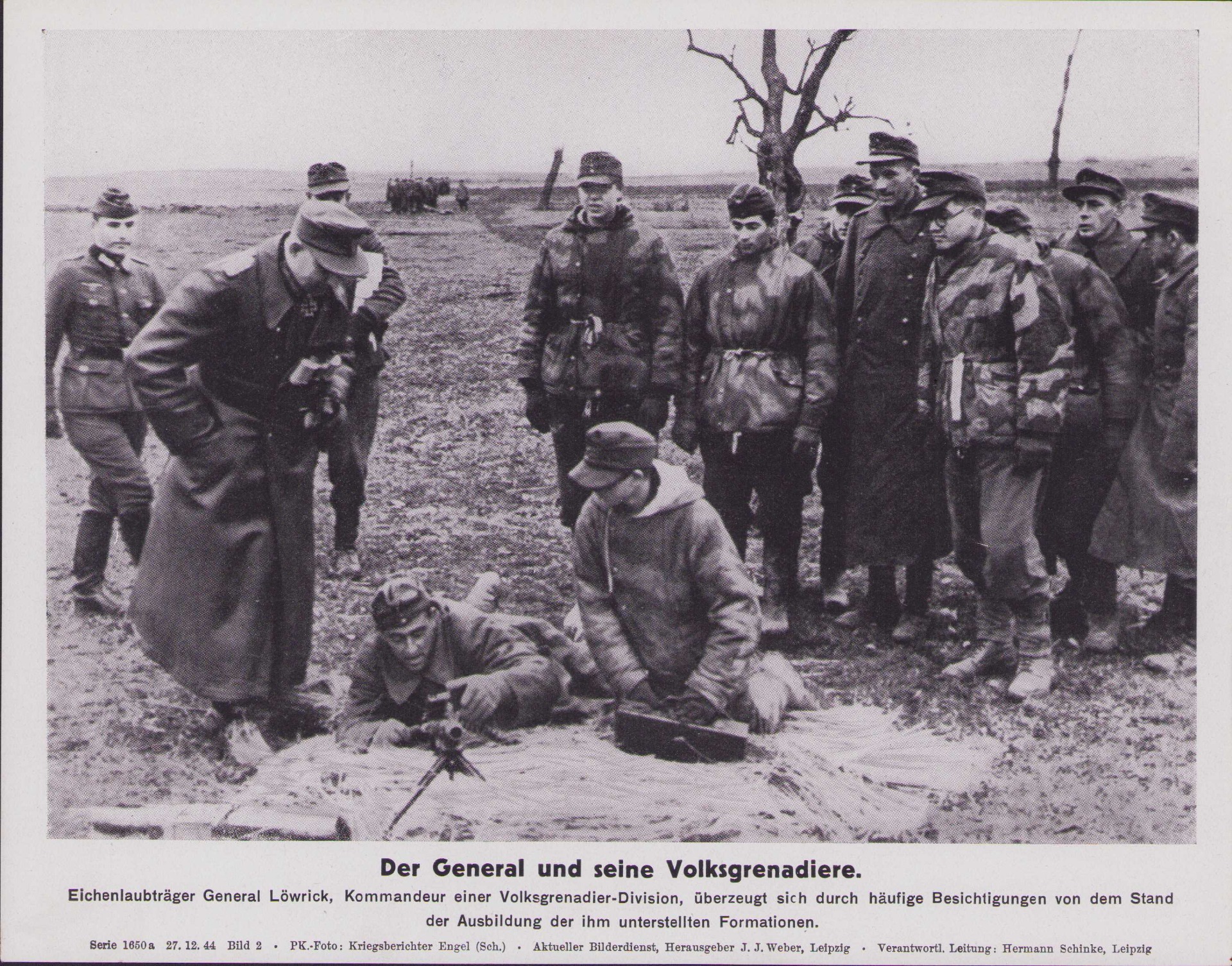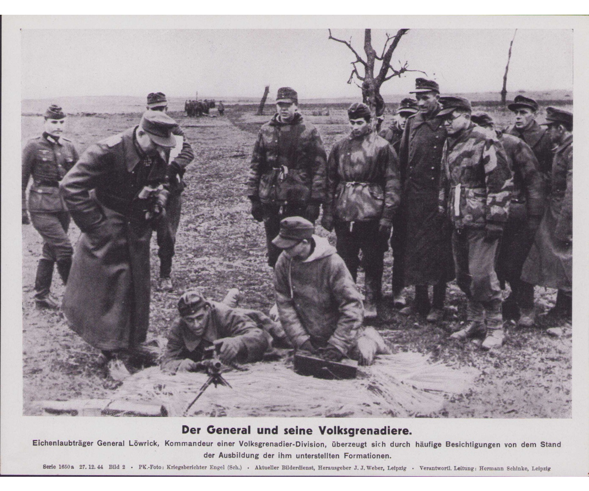 The photo shows overall normal signs of storage wear. Ritterkreuzträger mit Eichenlaub General Lowrick is visiting his troops during MG training. Note the different camouflage parka's the Volksgrenadiere are wearing.