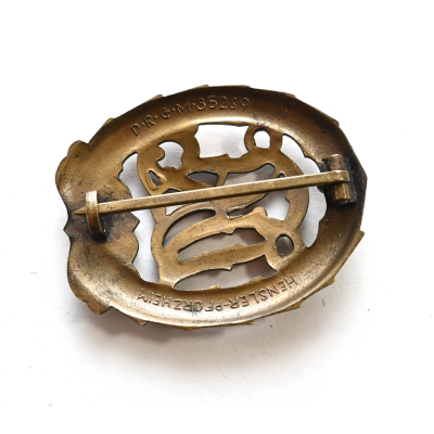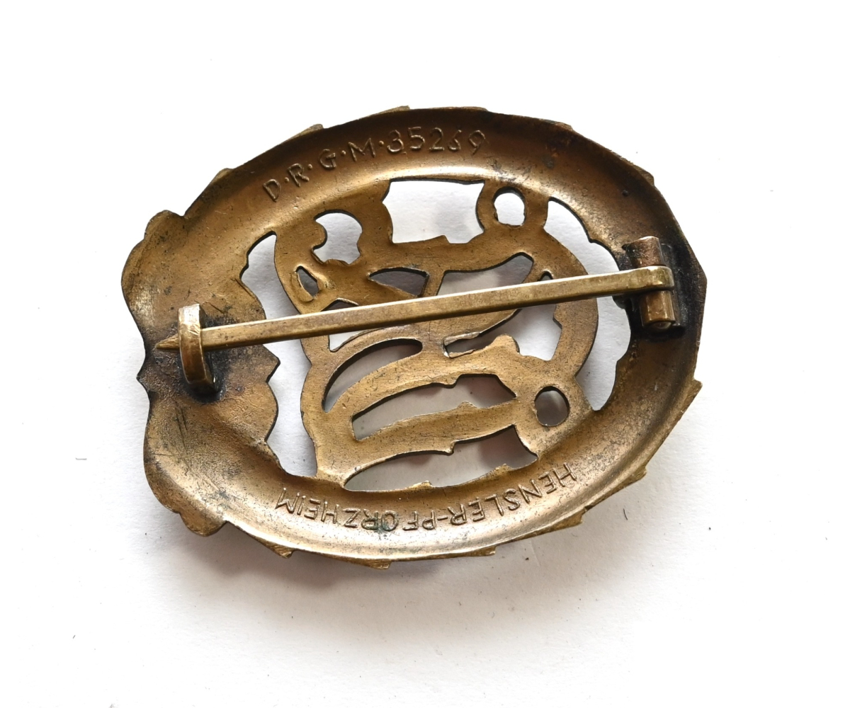 The badge is in used but very good condition. Complete with working pin and catch. Marked on the back with 'Hensler' from 'Pforzheim'. Also marked 'D.R.G.M.' & Number '35269' near the catch. Hard to find example as most of the DRL's that can be found are from 'W.Jena'.